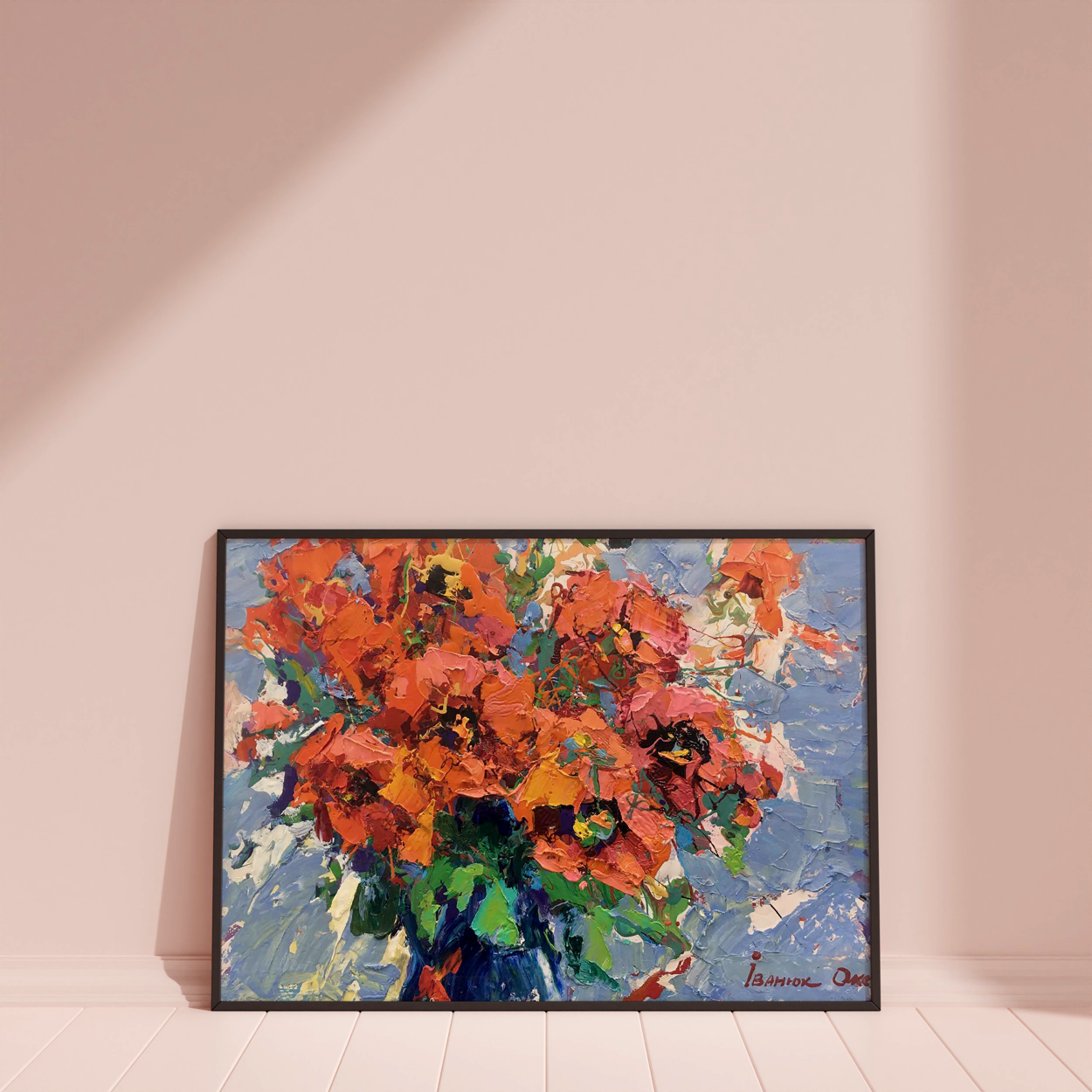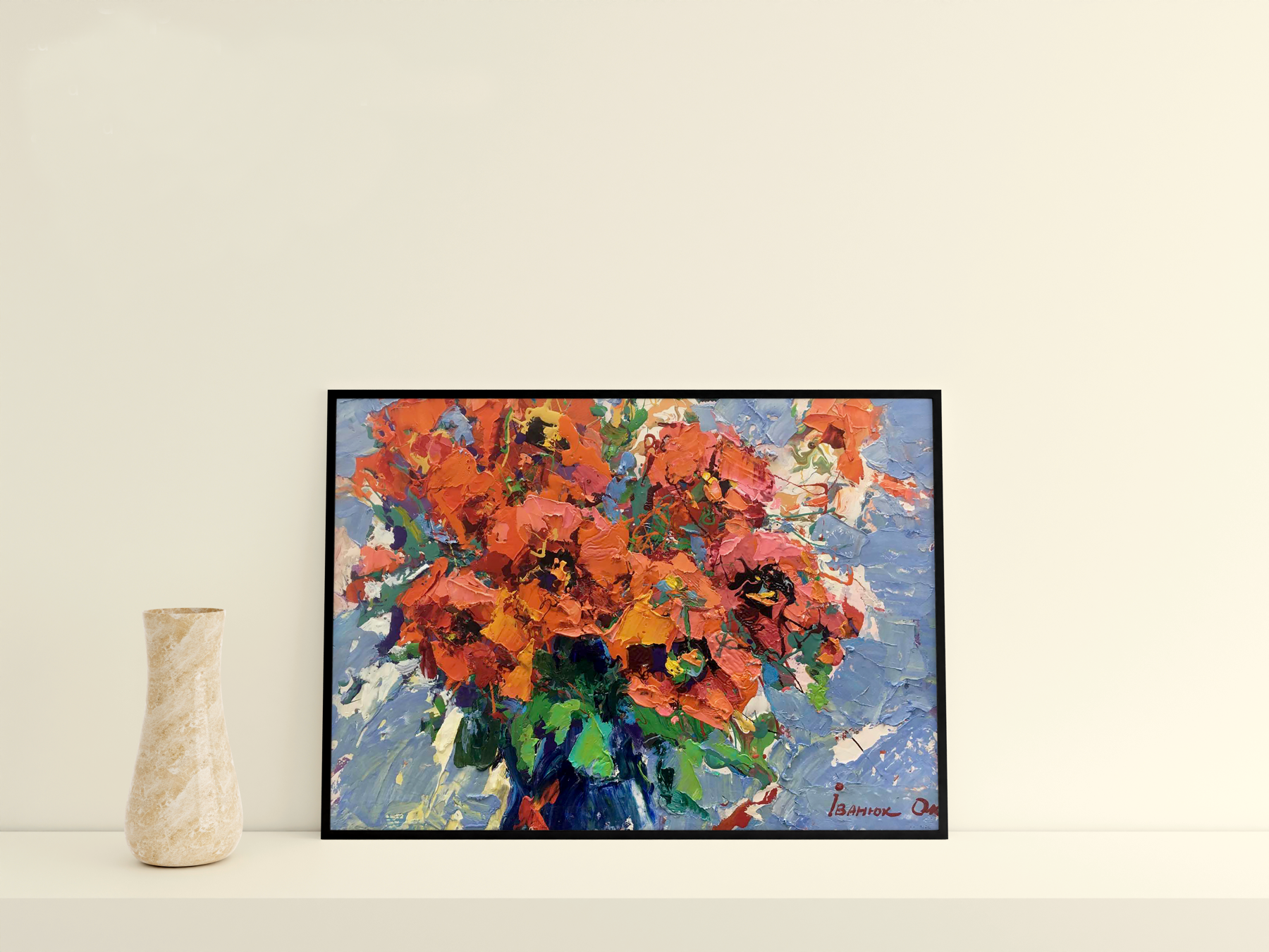 This oil painting, entitled "Poppies in the morning", depicts a beautiful bouquet of bright red poppies. The poppies are fresh and vibrant. The colors in the painting are very striking and will make a great addition to any room. The painting is sure to add a touch of elegance and style to any home.