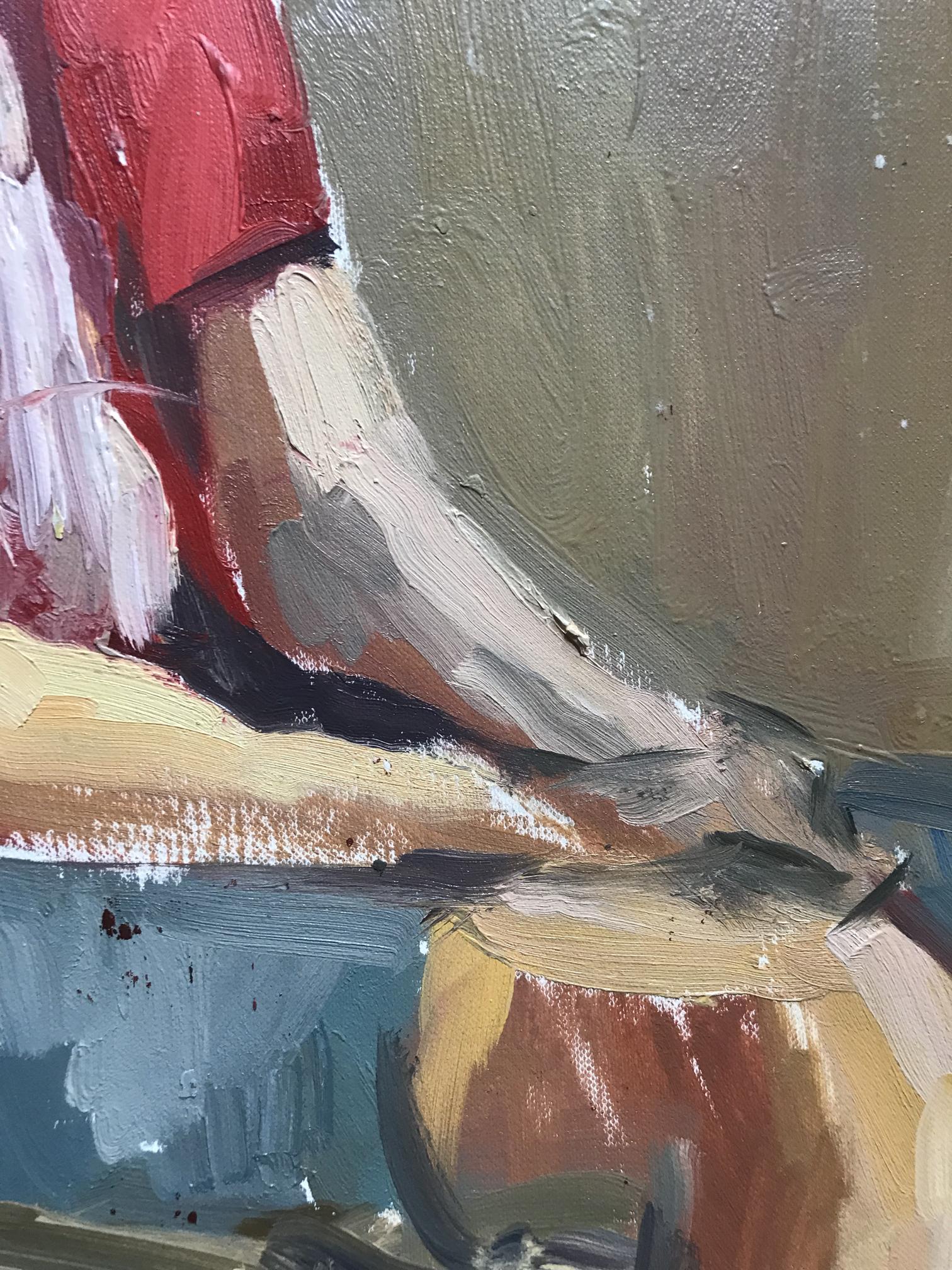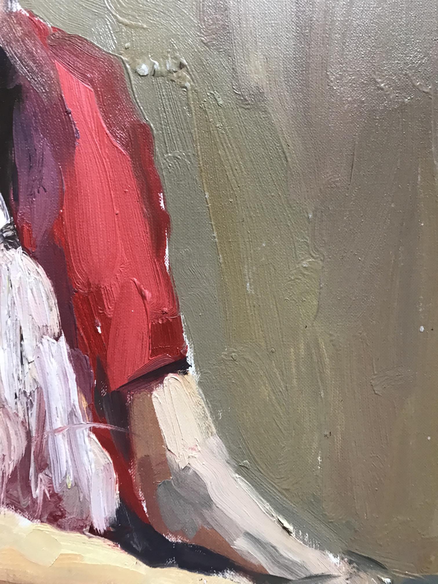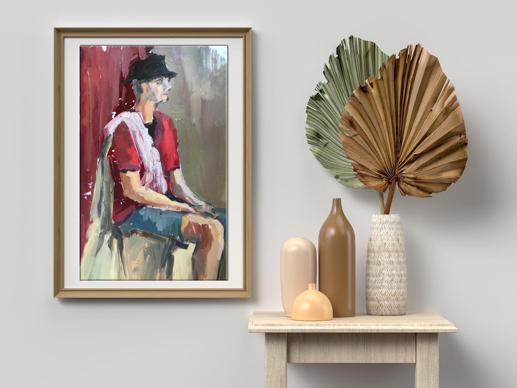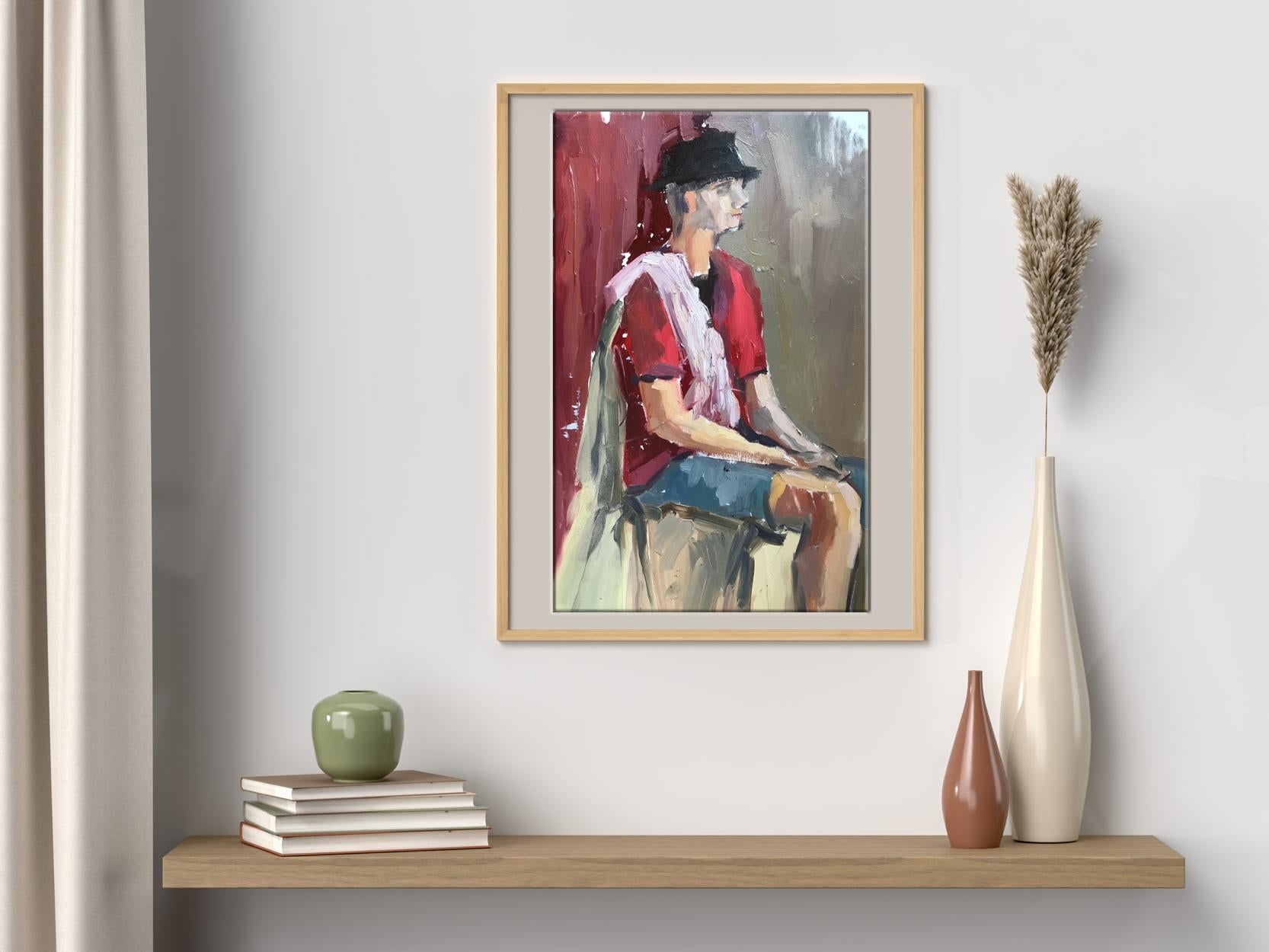 This oil painting is a beautiful and moving portrait of a young boy. He is captured in a moment of rest, with a towel over his shoulder after a hard day of play. The artist has expertly used light and shadow to create a sense of depth and dimension in the painting. The boy's face is full of emotion, and the viewer can't help but feel empathy for him. The painting is both charming and haunting, and it is sure to elicit an emotional response from anyone who sees it.