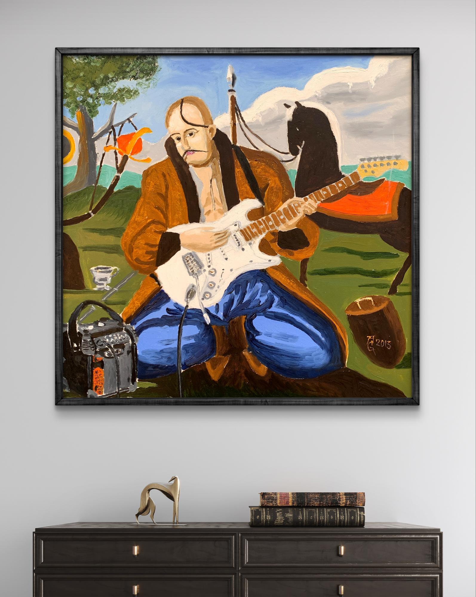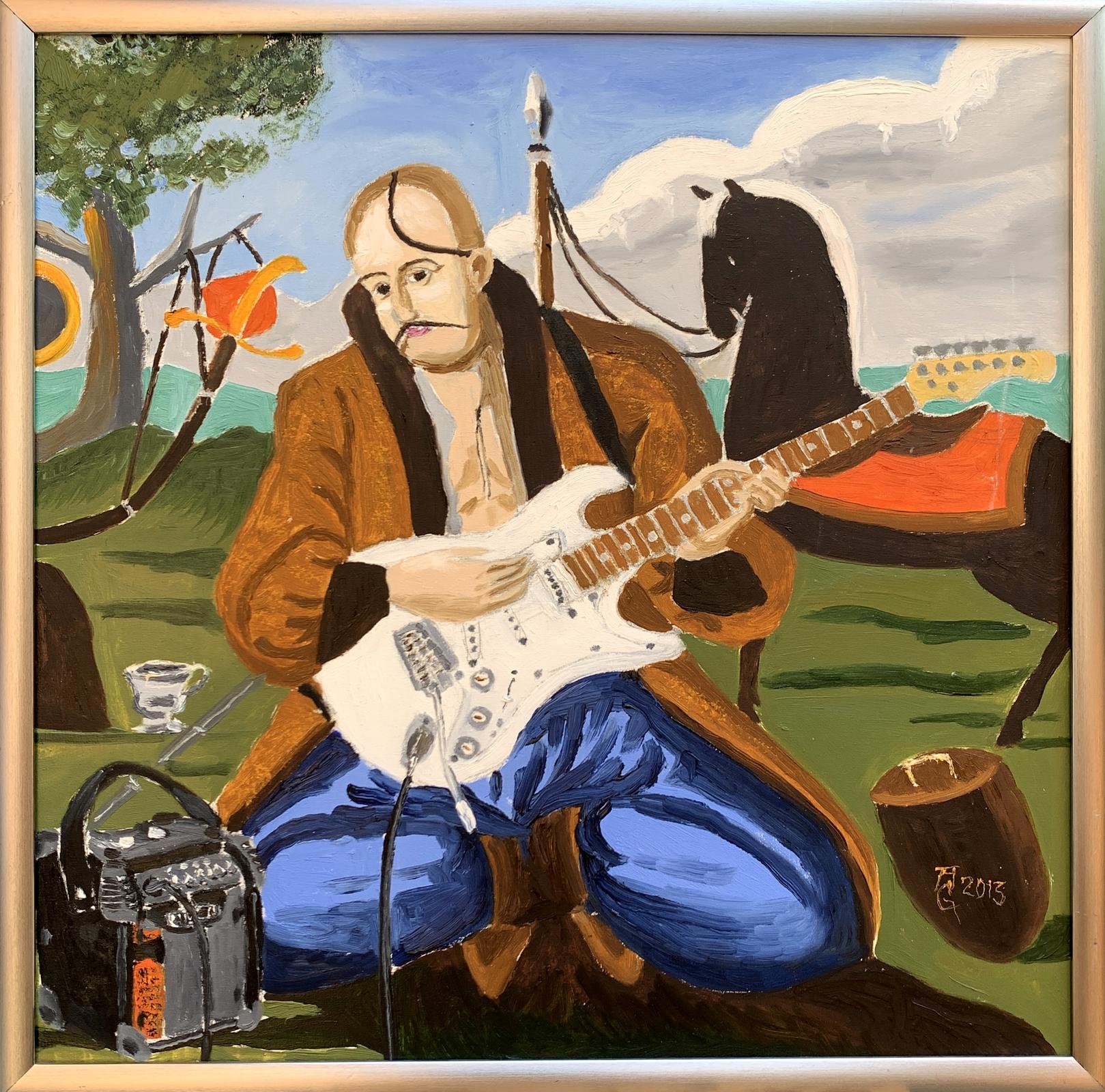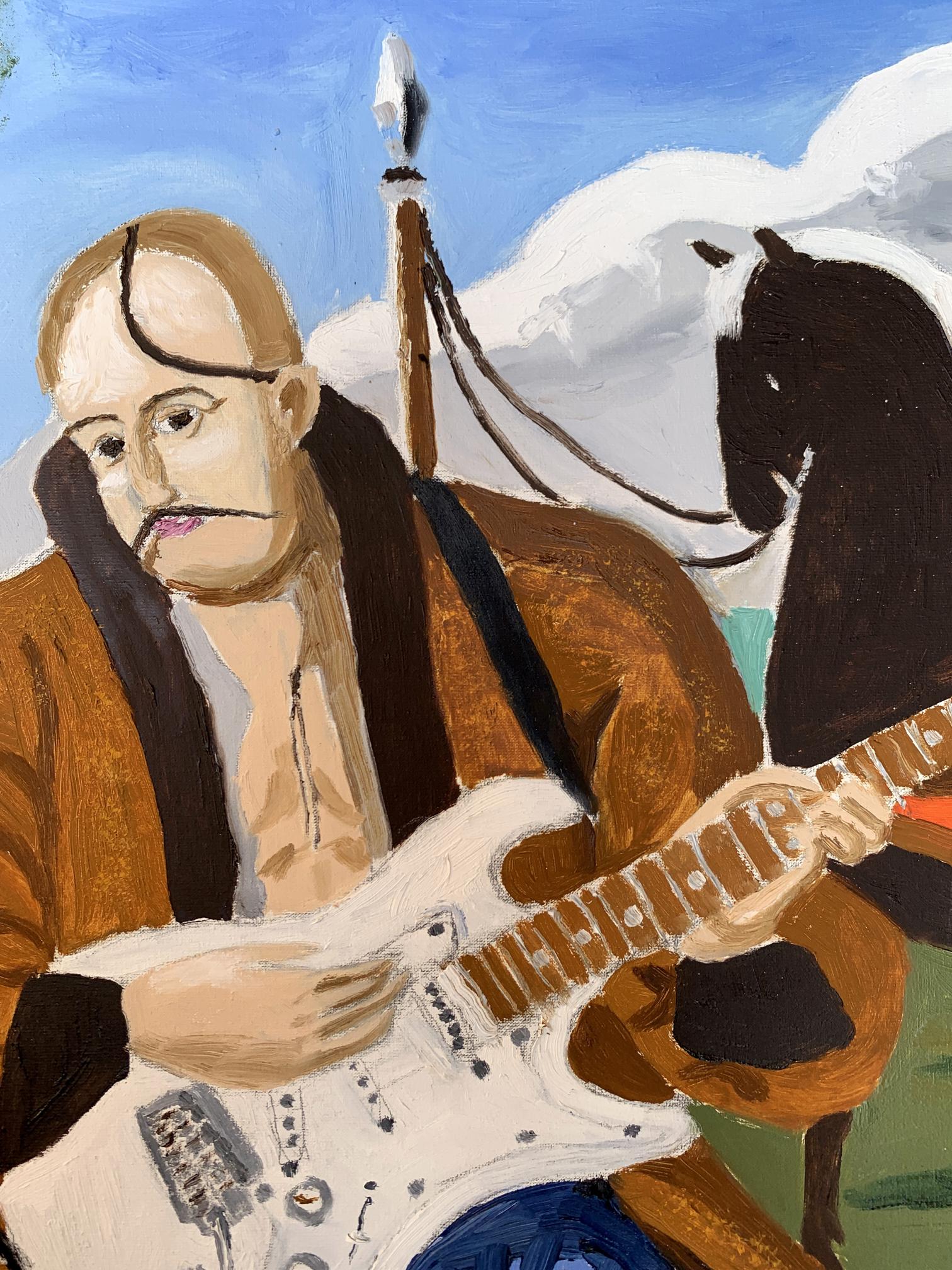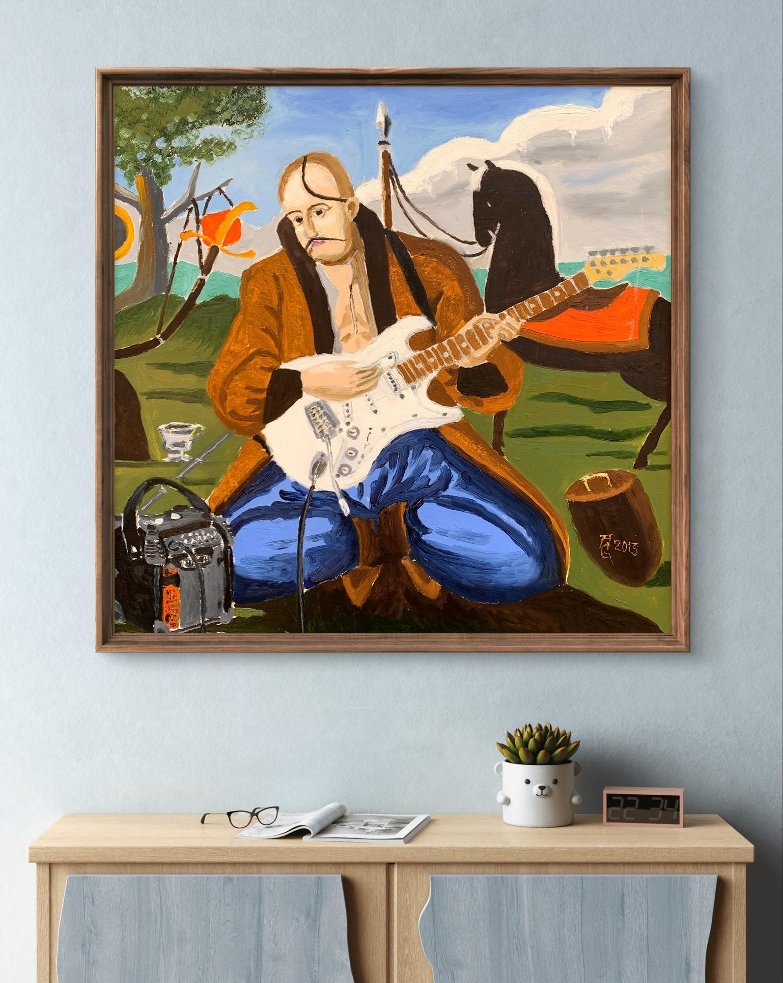 The painting titled "Portrait of a Cossack", rendered in oil on canvas, juxtaposes traditional and modern elements to create a striking and thought-provoking visual narrative. At its core, the artwork presents a Cossack—a historical figure symbolic of freedom, bravery, and cultural heritage—seated in an open landscape. However, the Cossack is not armed with the tools of war or tradition but instead holds an electric guitar, blending the past with contemporary artistic expression.The figure of the Cossack is depicted in traditional attire: a long coat and blue trousers, reflecting the historical aesthetic of Ukrainian Cossacks. His iconic shaved head with a forelock (oseledets) is unmistakably tied to his cultural identity. Despite these traditional markers, his relaxed posture, modern guitar, and amplifier create a visual and conceptual tension. This duality invites the viewer to consider the intersection of cultural heritage and modernity.Behind the Cossack, a black horse stands tethered, symbolizing loyalty and strength. The horse, a traditional companion of the Cossack, further grounds the scene in historical context. Surrounding elements, such as a campfire and trees, evoke a sense of pastoral simplicity. Yet the presence of the electric guitar amplifier, complete with visible wires, starkly contrasts with the rural environment, serving as a metaphor for the blending of old and new worlds.The color palette is rich yet balanced, with earthy greens and browns dominating the background, while the bright white of the guitar draws the viewer's focus to the centerpiece. The sky, with its soft blue hues and scattered clouds, provides a serene backdrop, enhancing the painting's contemplative mood.Through this work, the artist seems to explore themes of cultural evolution and the fusion of tradition with contemporary identity. The Cossack, historically a symbol of resistance and independence, is reimagined as a musician, expressing his spirit through music rather than battle. The painting suggests that while the tools may change, the essence of cultural expression—passion, resilience, and creativity—remains timeless. It invites the viewer to reflect on the ways in which tradition can be adapted to resonate in the modern world.