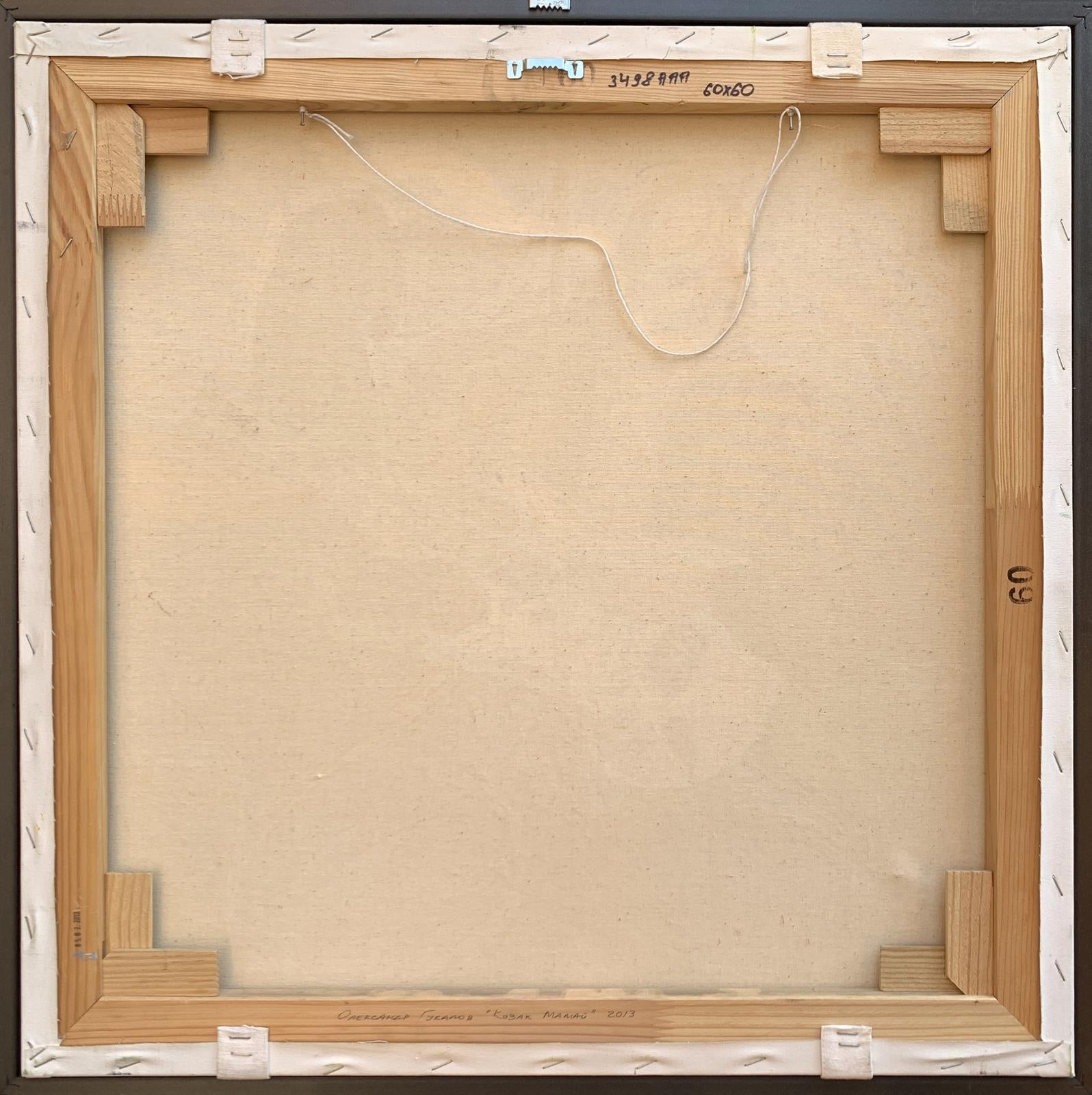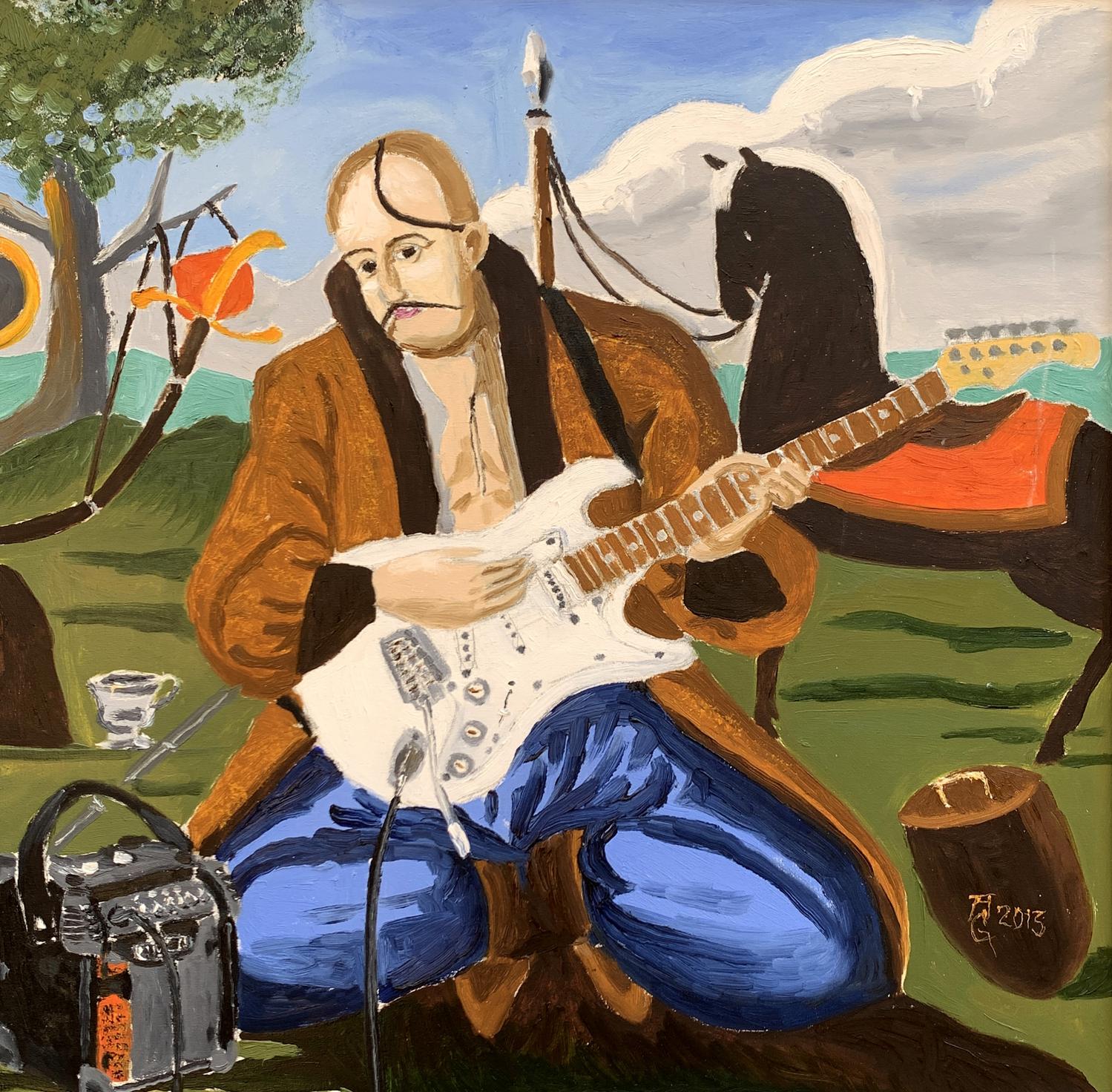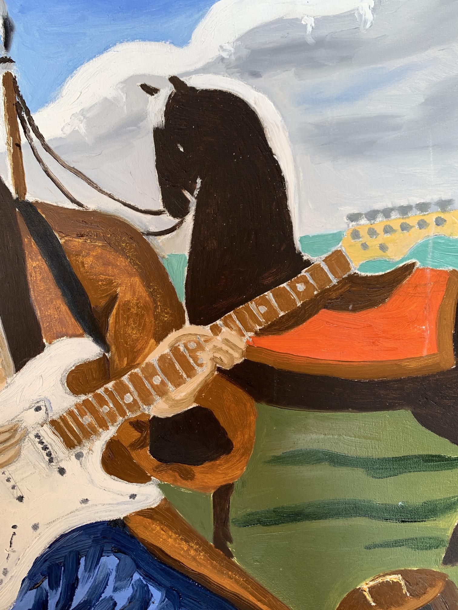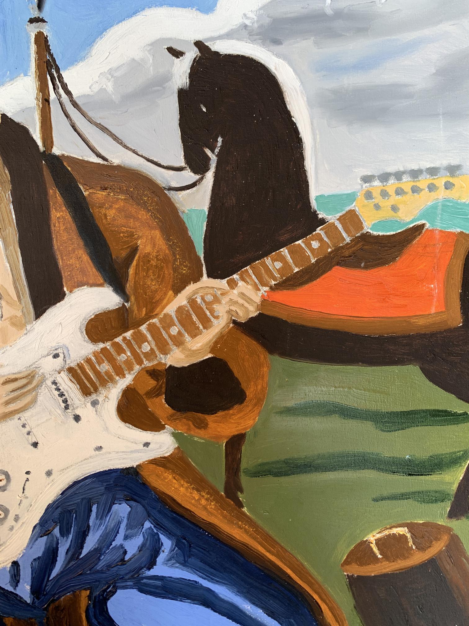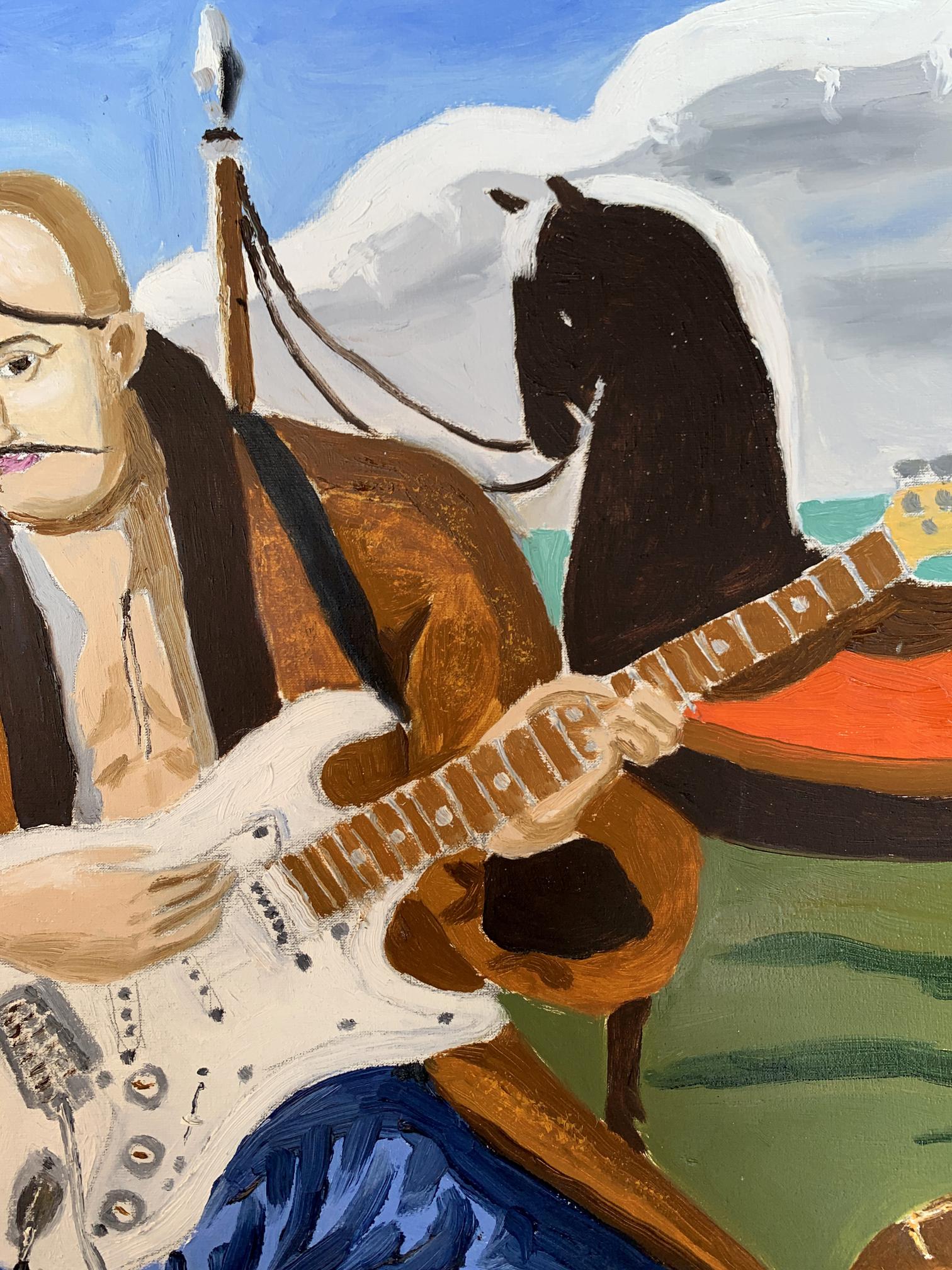 The painting titled "Portrait of a Cossack", rendered in oil on canvas, juxtaposes traditional and modern elements to create a striking and thought-provoking visual narrative. At its core, the artwork presents a Cossack—a historical figure symbolic of freedom, bravery, and cultural heritage—seated in an open landscape. However, the Cossack is not armed with the tools of war or tradition but instead holds an electric guitar, blending the past with contemporary artistic expression.The figure of the Cossack is depicted in traditional attire: a long coat and blue trousers, reflecting the historical aesthetic of Ukrainian Cossacks. His iconic shaved head with a forelock (oseledets) is unmistakably tied to his cultural identity. Despite these traditional markers, his relaxed posture, modern guitar, and amplifier create a visual and conceptual tension. This duality invites the viewer to consider the intersection of cultural heritage and modernity.Behind the Cossack, a black horse stands tethered, symbolizing loyalty and strength. The horse, a traditional companion of the Cossack, further grounds the scene in historical context. Surrounding elements, such as a campfire and trees, evoke a sense of pastoral simplicity. Yet the presence of the electric guitar amplifier, complete with visible wires, starkly contrasts with the rural environment, serving as a metaphor for the blending of old and new worlds.The color palette is rich yet balanced, with earthy greens and browns dominating the background, while the bright white of the guitar draws the viewer's focus to the centerpiece. The sky, with its soft blue hues and scattered clouds, provides a serene backdrop, enhancing the painting's contemplative mood.Through this work, the artist seems to explore themes of cultural evolution and the fusion of tradition with contemporary identity. The Cossack, historically a symbol of resistance and independence, is reimagined as a musician, expressing his spirit through music rather than battle. The painting suggests that while the tools may change, the essence of cultural expression—passion, resilience, and creativity—remains timeless. It invites the viewer to reflect on the ways in which tradition can be adapted to resonate in the modern world.