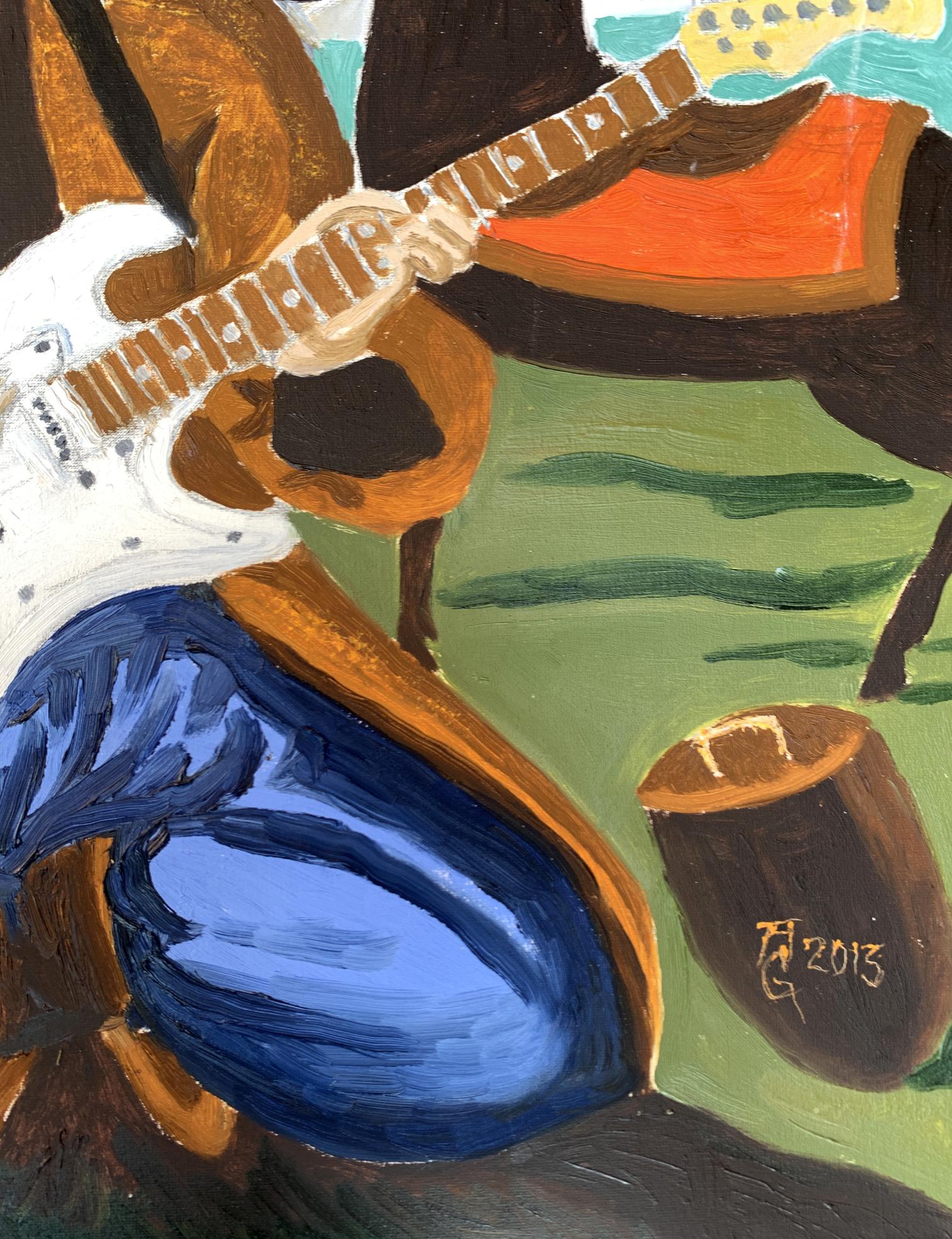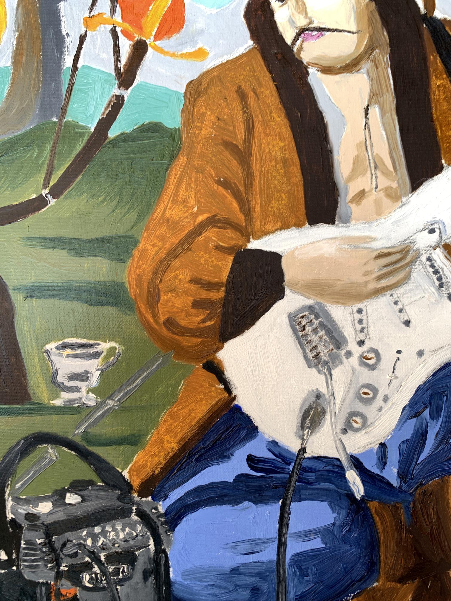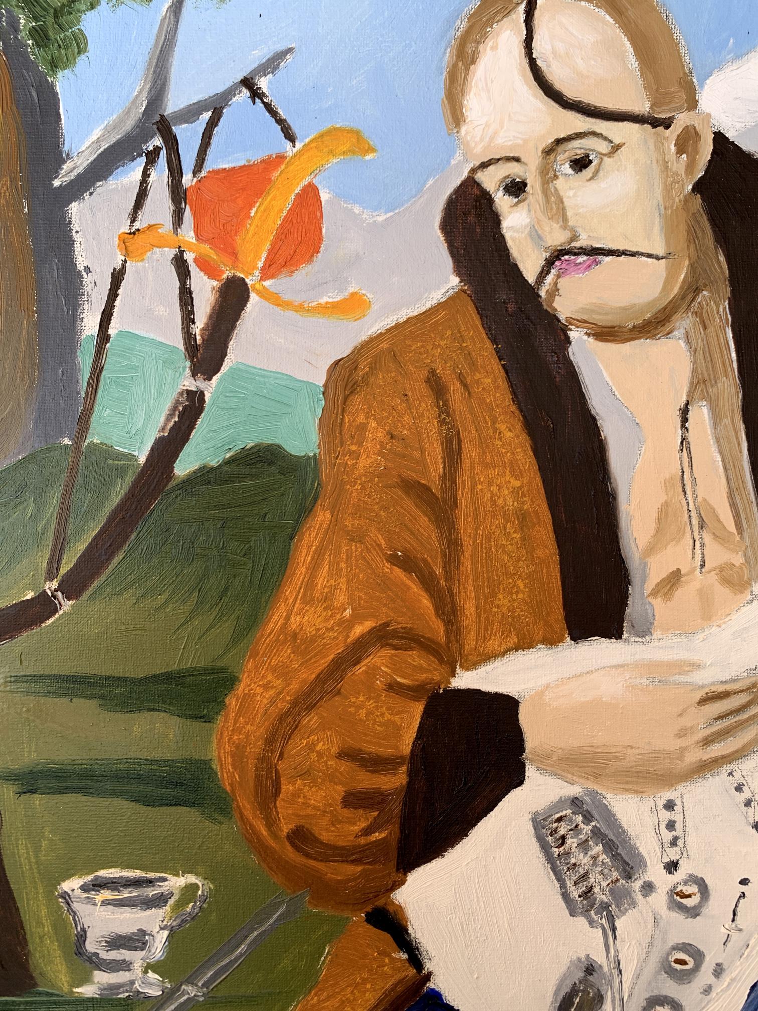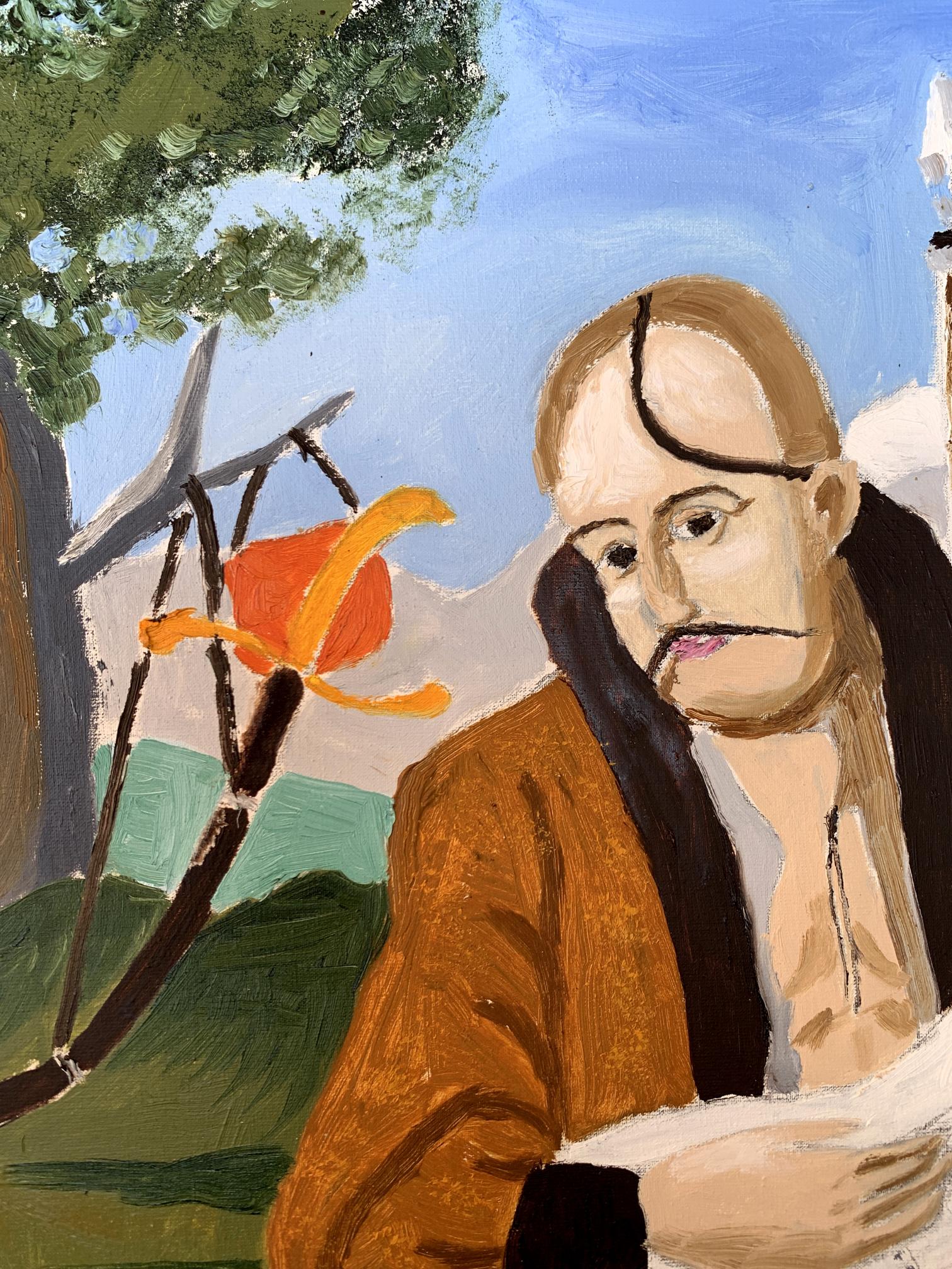 The painting titled "Portrait of a Cossack", rendered in oil on canvas, juxtaposes traditional and modern elements to create a striking and thought-provoking visual narrative. At its core, the artwork presents a Cossack—a historical figure symbolic of freedom, bravery, and cultural heritage—seated in an open landscape. However, the Cossack is not armed with the tools of war or tradition but instead holds an electric guitar, blending the past with contemporary artistic expression.The figure of the Cossack is depicted in traditional attire: a long coat and blue trousers, reflecting the historical aesthetic of Ukrainian Cossacks. His iconic shaved head with a forelock (oseledets) is unmistakably tied to his cultural identity. Despite these traditional markers, his relaxed posture, modern guitar, and amplifier create a visual and conceptual tension. This duality invites the viewer to consider the intersection of cultural heritage and modernity.Behind the Cossack, a black horse stands tethered, symbolizing loyalty and strength. The horse, a traditional companion of the Cossack, further grounds the scene in historical context. Surrounding elements, such as a campfire and trees, evoke a sense of pastoral simplicity. Yet the presence of the electric guitar amplifier, complete with visible wires, starkly contrasts with the rural environment, serving as a metaphor for the blending of old and new worlds.The color palette is rich yet balanced, with earthy greens and browns dominating the background, while the bright white of the guitar draws the viewer's focus to the centerpiece. The sky, with its soft blue hues and scattered clouds, provides a serene backdrop, enhancing the painting's contemplative mood.Through this work, the artist seems to explore themes of cultural evolution and the fusion of tradition with contemporary identity. The Cossack, historically a symbol of resistance and independence, is reimagined as a musician, expressing his spirit through music rather than battle. The painting suggests that while the tools may change, the essence of cultural expression—passion, resilience, and creativity—remains timeless. It invites the viewer to reflect on the ways in which tradition can be adapted to resonate in the modern world.
