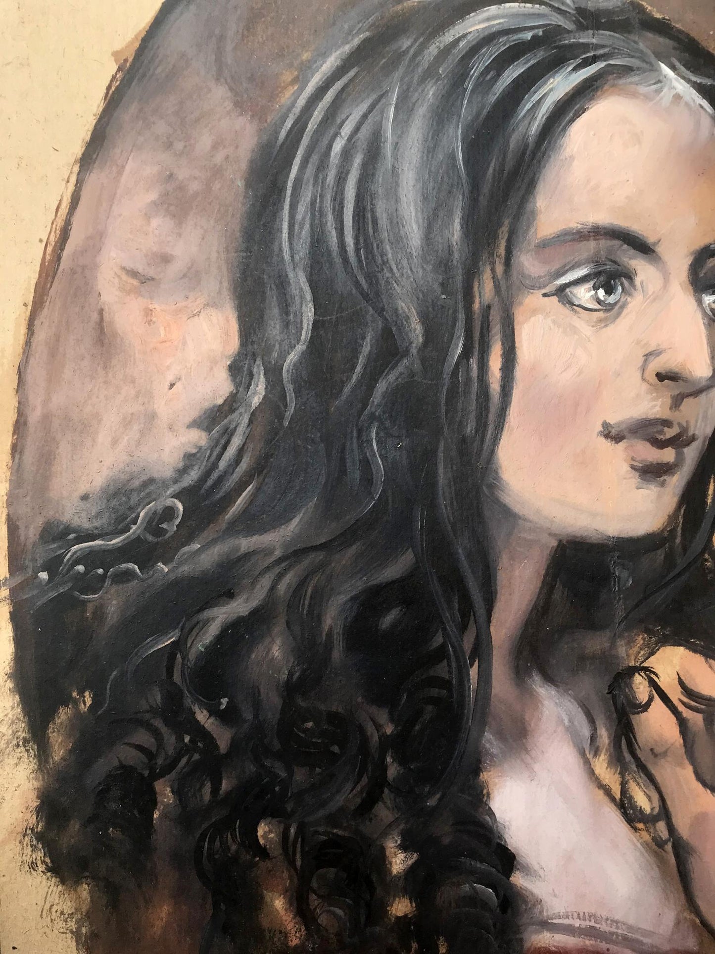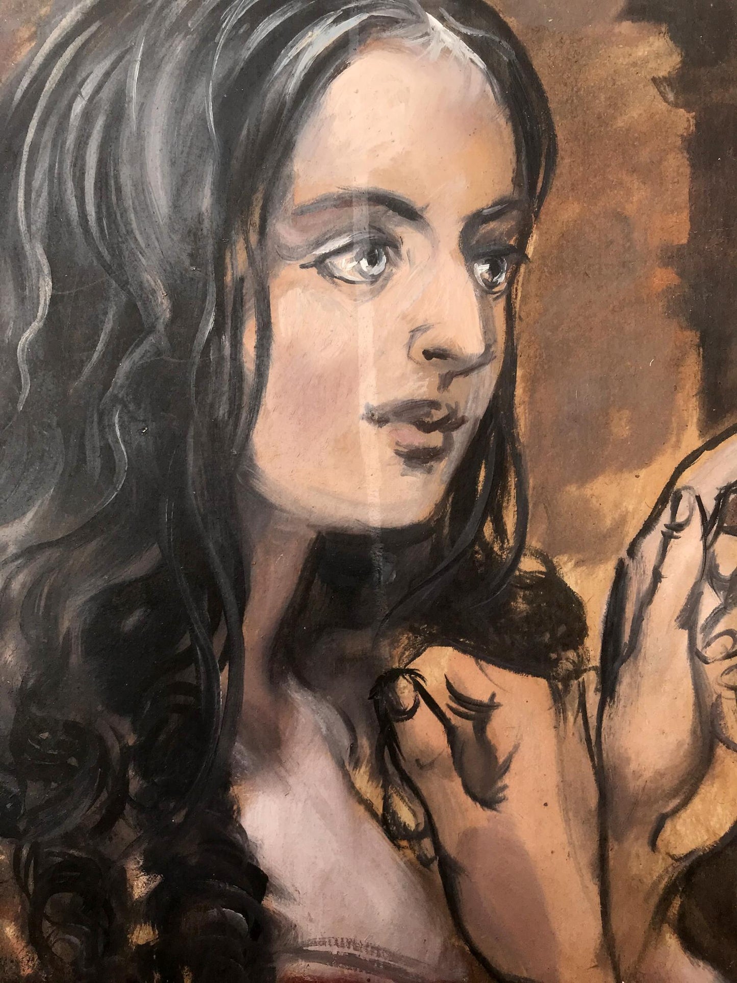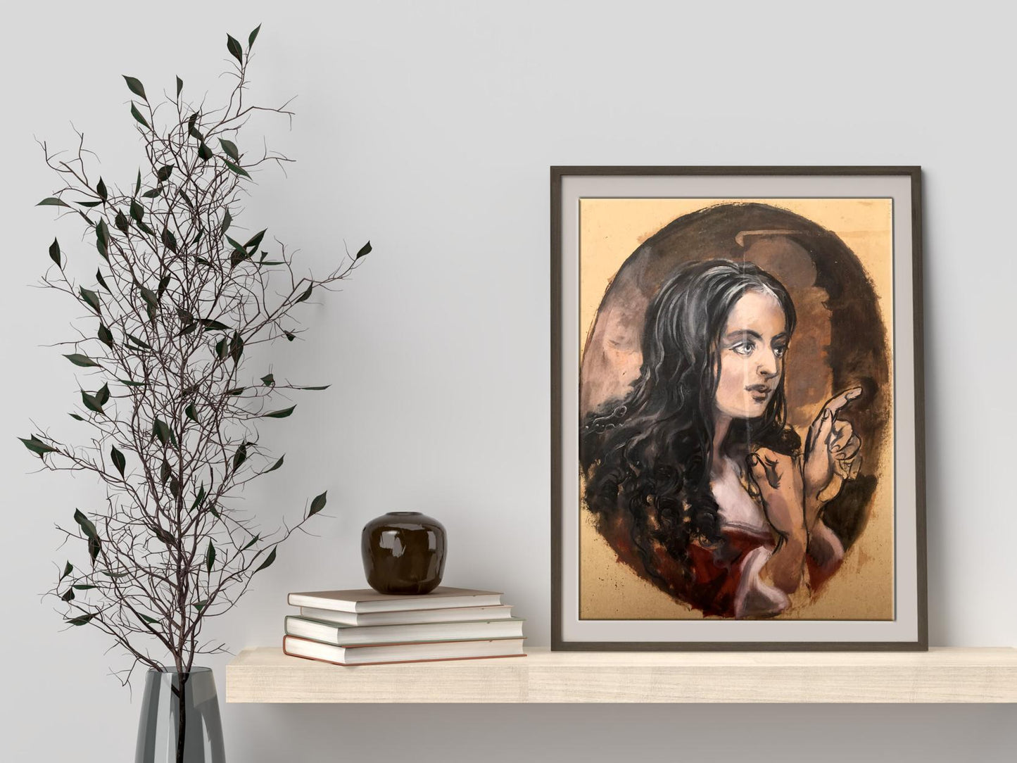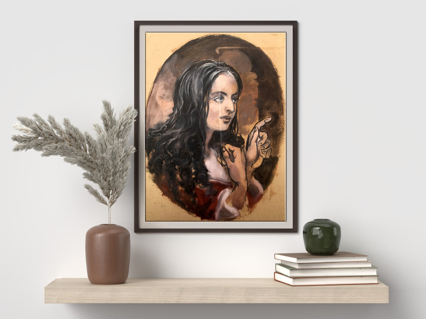 "Portrait of a Girl" is a captivating oil painting that exudes both elegance and intrigue. The artist skillfully captures the essence of a young girl, allowing her presence to emanate from the canvas with a timeless grace. The focal point of the composition is the girl's enchanting face, which holds a delicate and contemplative expression. The girl's hair is lustrous and jet-black, cascading in gentle waves down her shoulders. It frames her face, enhancing the intensity of her gaze. Her eyes, though not explicitly described, draw the viewer in with their depth and emotional depth, hinting at a complex inner world. Dressed in a striking combination of red and white, the girl's attire evokes a sense of vibrancy and purity. The red of her dress stands out against the white accents, creating a visually stunning contrast that adds a touch of vitality to the overall composition. The meticulous brushwork captures the folds and textures of the fabric, lending a sense of realism and tactility to the painting. The portrait is presented in a unique manner, spanning across the girl's chest. This composition choice draws attention to her face and emphasizes its importance in conveying her story and personality. The artist's attention to detail is evident in the careful rendering of every feature, flawlessly capturing the girl's likeness. Against a warm brown background, the girl stands out prominently, as if illuminated by an invisible light. The brown hue lends a sense of earthiness and stability to the overall composition, complementing the vibrant colors of the girl's attire and accentuating her presence. "Portrait of a Girl" is a masterful exploration of capturing human emotion and beauty on canvas. Through the careful use of color, composition, and brushwork, the artist breathes life into the subject, inviting the viewer to contemplate the girl's story and immerse themselves in her enigmatic world.