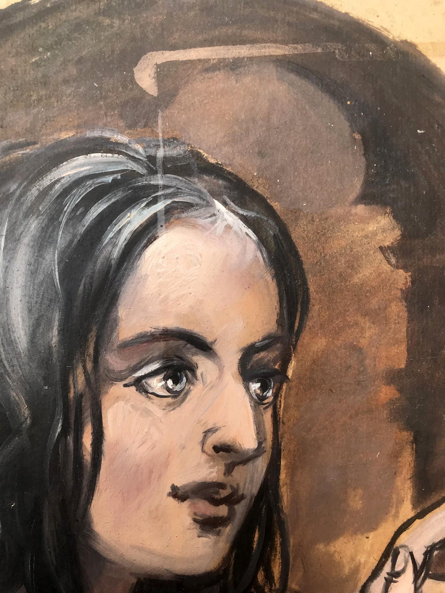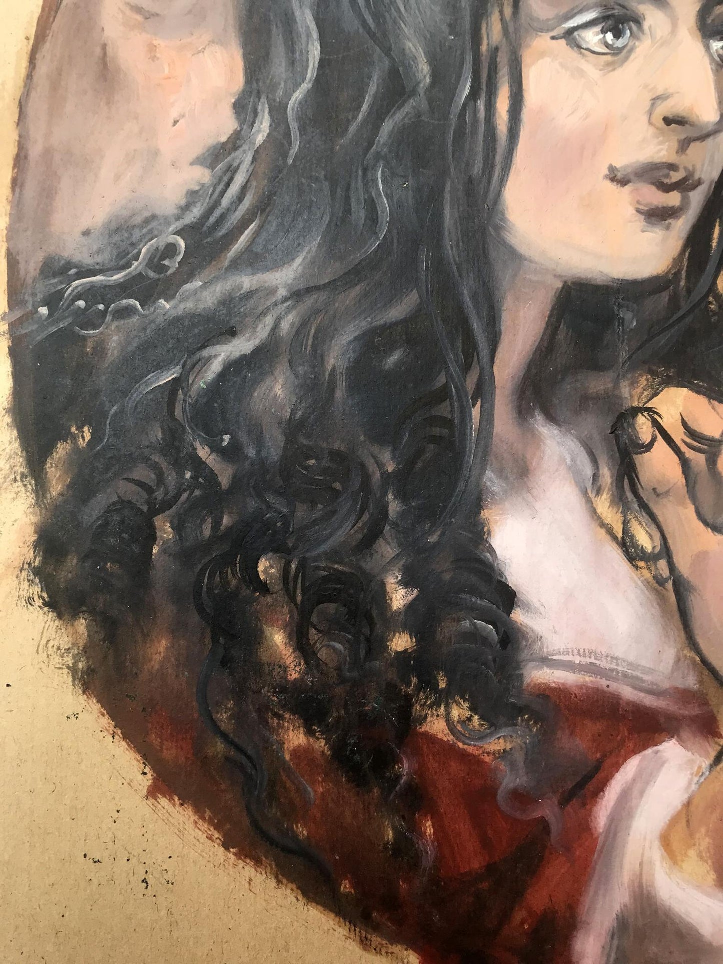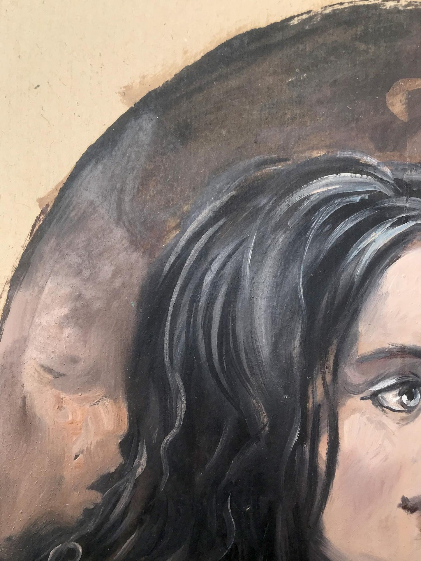 "Portrait of a Girl" is a captivating oil painting that exudes both elegance and intrigue. The artist skillfully captures the essence of a young girl, allowing her presence to emanate from the canvas with a timeless grace. The focal point of the composition is the girl's enchanting face, which holds a delicate and contemplative expression. The girl's hair is lustrous and jet-black, cascading in gentle waves down her shoulders. It frames her face, enhancing the intensity of her gaze. Her eyes, though not explicitly described, draw the viewer in with their depth and emotional depth, hinting at a complex inner world. Dressed in a striking combination of red and white, the girl's attire evokes a sense of vibrancy and purity. The red of her dress stands out against the white accents, creating a visually stunning contrast that adds a touch of vitality to the overall composition. The meticulous brushwork captures the folds and textures of the fabric, lending a sense of realism and tactility to the painting. The portrait is presented in a unique manner, spanning across the girl's chest. This composition choice draws attention to her face and emphasizes its importance in conveying her story and personality. The artist's attention to detail is evident in the careful rendering of every feature, flawlessly capturing the girl's likeness. Against a warm brown background, the girl stands out prominently, as if illuminated by an invisible light. The brown hue lends a sense of earthiness and stability to the overall composition, complementing the vibrant colors of the girl's attire and accentuating her presence. "Portrait of a Girl" is a masterful exploration of capturing human emotion and beauty on canvas. Through the careful use of color, composition, and brushwork, the artist breathes life into the subject, inviting the viewer to contemplate the girl's story and immerse themselves in her enigmatic world.
