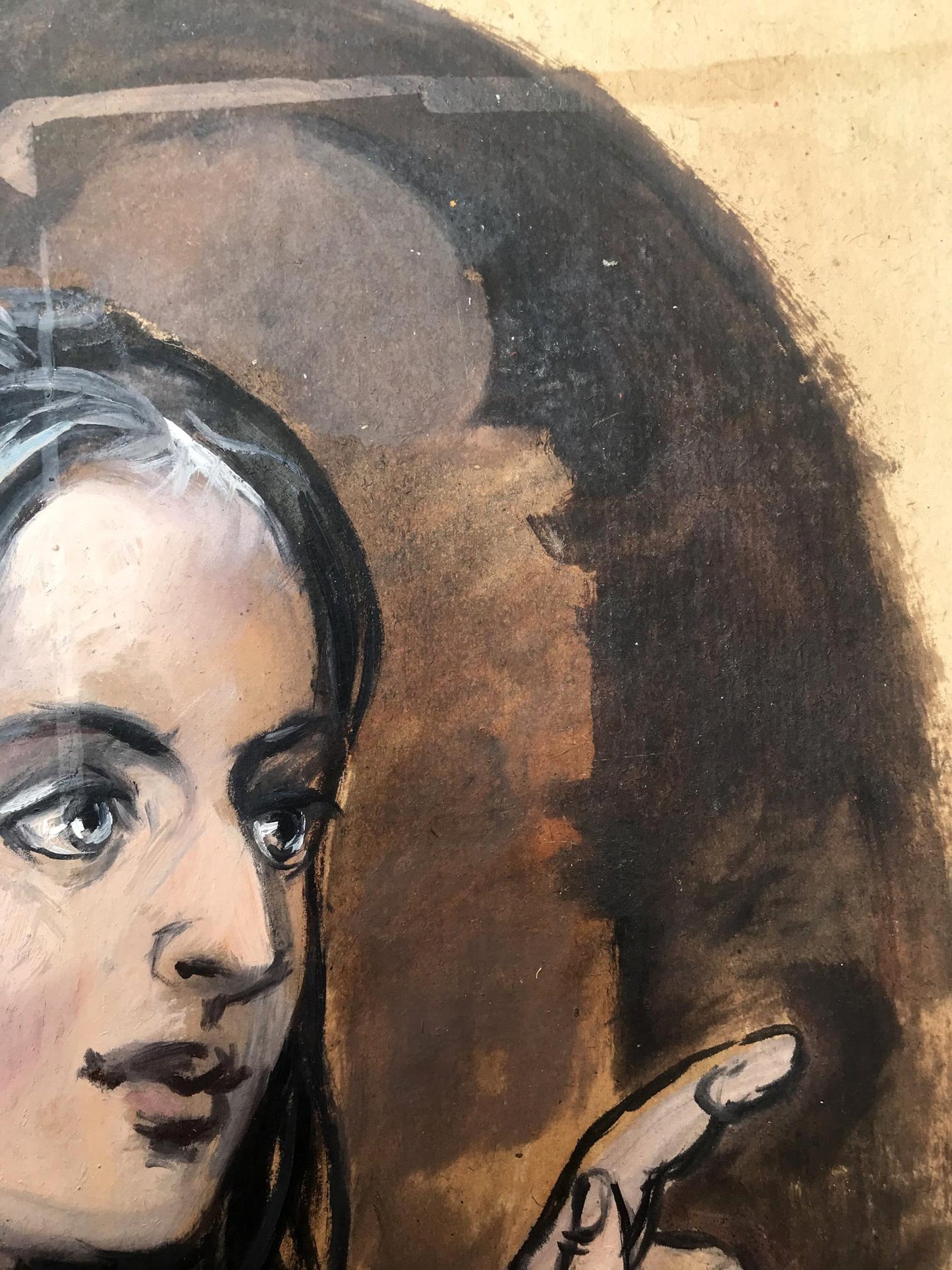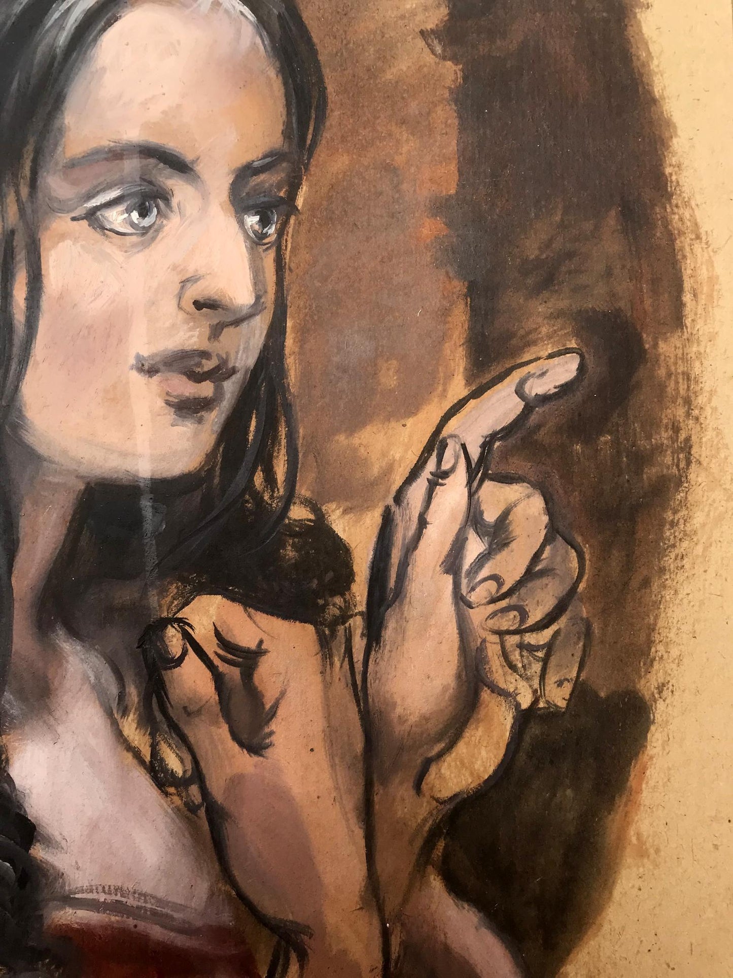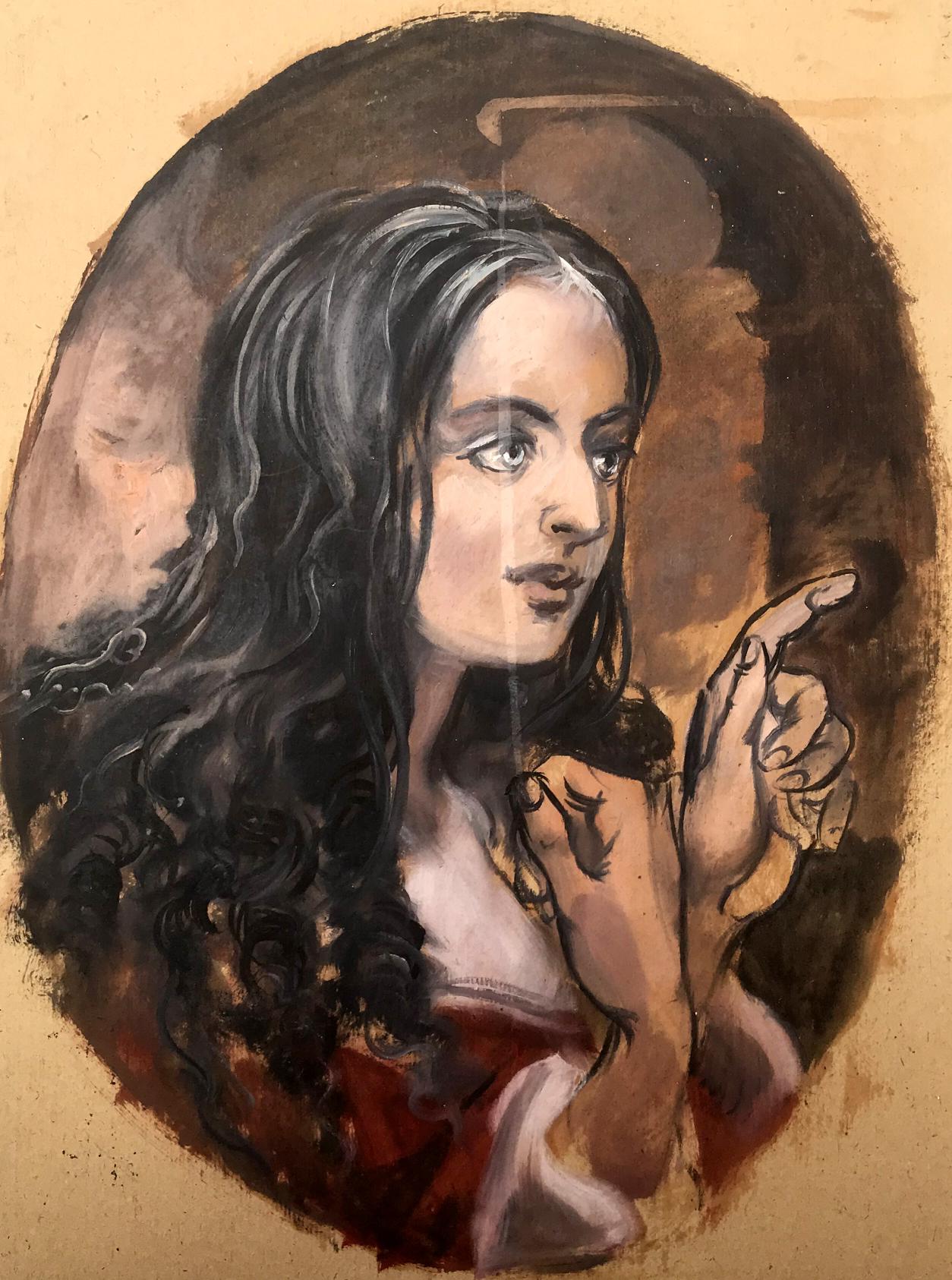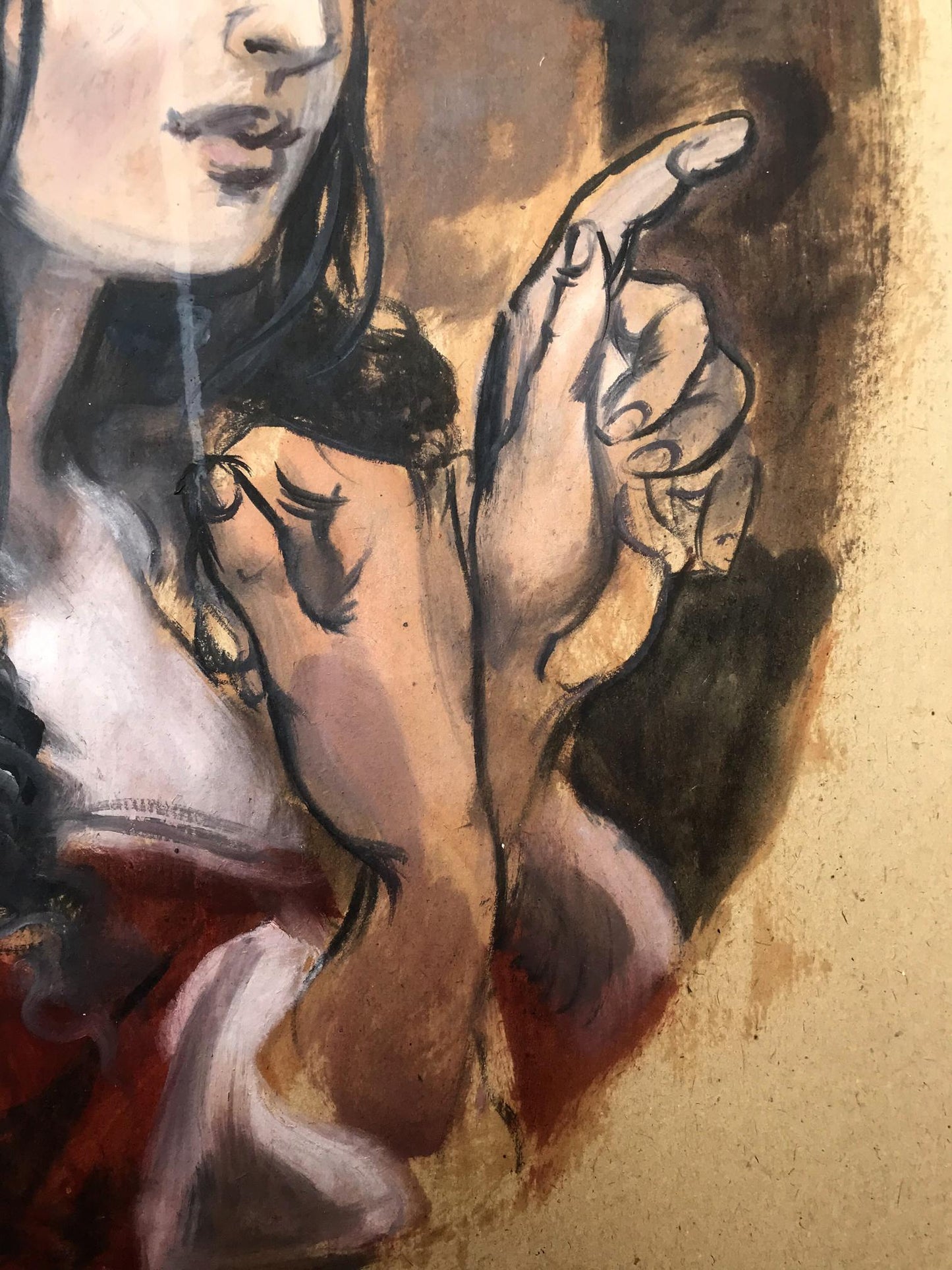 "Portrait of a Girl" is a captivating oil painting that exudes both elegance and intrigue. The artist skillfully captures the essence of a young girl, allowing her presence to emanate from the canvas with a timeless grace. The focal point of the composition is the girl's enchanting face, which holds a delicate and contemplative expression. The girl's hair is lustrous and jet-black, cascading in gentle waves down her shoulders. It frames her face, enhancing the intensity of her gaze. Her eyes, though not explicitly described, draw the viewer in with their depth and emotional depth, hinting at a complex inner world. Dressed in a striking combination of red and white, the girl's attire evokes a sense of vibrancy and purity. The red of her dress stands out against the white accents, creating a visually stunning contrast that adds a touch of vitality to the overall composition. The meticulous brushwork captures the folds and textures of the fabric, lending a sense of realism and tactility to the painting. The portrait is presented in a unique manner, spanning across the girl's chest. This composition choice draws attention to her face and emphasizes its importance in conveying her story and personality. The artist's attention to detail is evident in the careful rendering of every feature, flawlessly capturing the girl's likeness. Against a warm brown background, the girl stands out prominently, as if illuminated by an invisible light. The brown hue lends a sense of earthiness and stability to the overall composition, complementing the vibrant colors of the girl's attire and accentuating her presence. "Portrait of a Girl" is a masterful exploration of capturing human emotion and beauty on canvas. Through the careful use of color, composition, and brushwork, the artist breathes life into the subject, inviting the viewer to contemplate the girl's story and immerse themselves in her enigmatic world.
