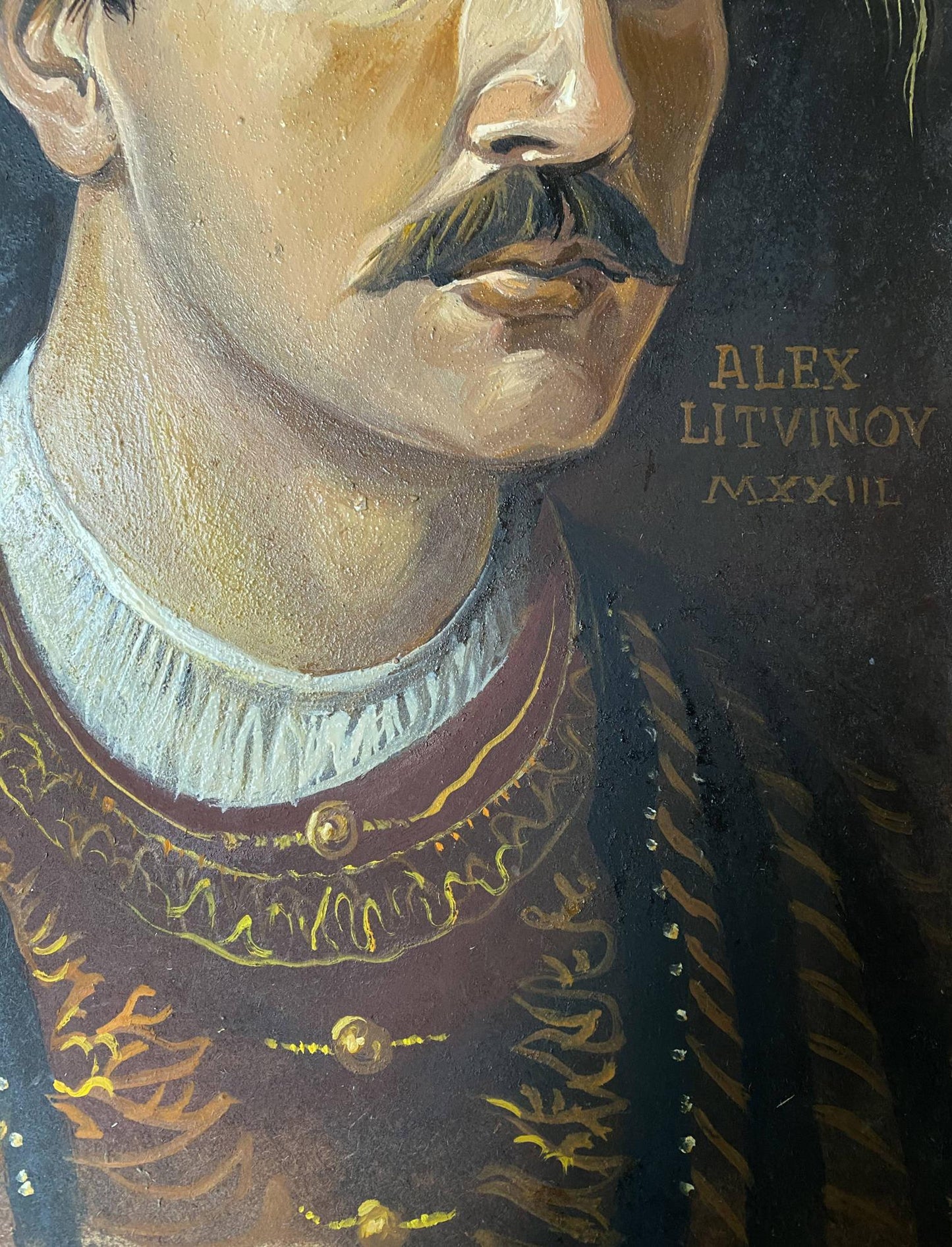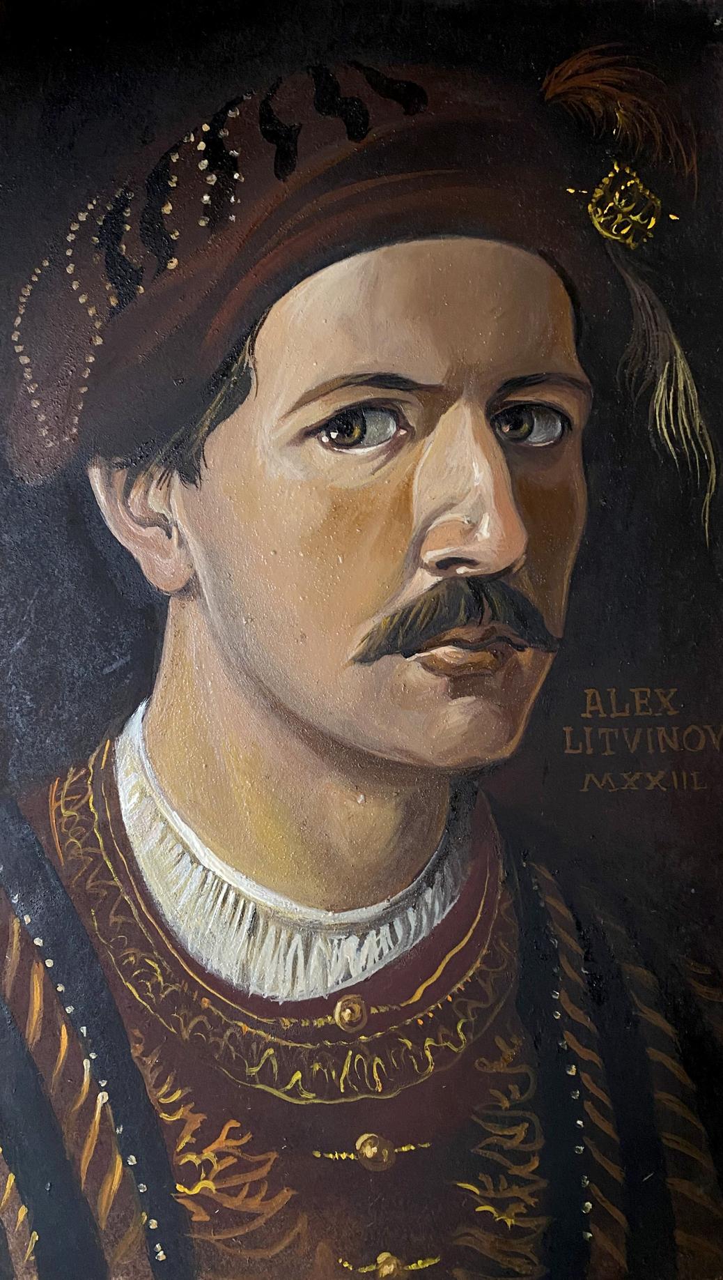 "Portrait of a man with a mustache" is an intimate exploration of individuality, character, and emotion. Litvinov employs his mastery of oil painting to craft a portrait that is both a visual and psychological study of its subject. The careful attention to detail, from the texture of the skin to the depth of the gaze, invites viewers to contemplate the story and personality of the man depicted.