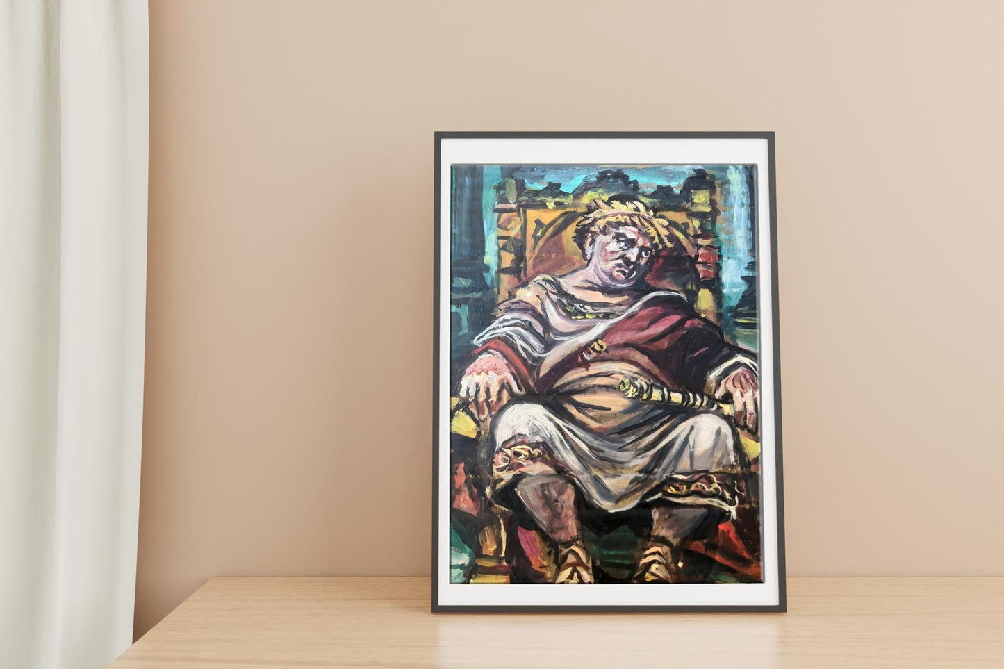"Portrait of Caesar" is a captivating oil painting that depicts the legendary Roman leader in all his regal glory. The artwork showcases the charismatic ruler seated upon a majestic golden throne, exuding an aura of power and authority. Created with meticulous brushstrokes and a keen attention to detail, the painting transports the viewer to an era of grandeur and historical significance. Caesar's visage is captured with great finesse, portraying him as a commanding figure with piercing eyes and a strong, determined gaze. His expression conveys a sense of thoughtful introspection as his eyes focus on an unseen point in the distance, suggesting his profound contemplation of his empire and the weight of his responsibilities. The artist masterfully captures the depth of Caesar's character, evoking a mix of wisdom, ambition, and strategic prowess. Dressed in resplendent white and red robes, Caesar appears draped in the colors symbolizing his status and authority. The white robes, adorned with intricate golden patterns, embody his position as a virtuous and noble leader. The rich red fabric, flowing around him, serves as a reminder of his military prowess and the countless victories he achieved on the battlefield. The interplay of colors adds vibrancy to the composition, enhancing the overall sense of grandeur. The golden throne on which Caesar sits is a work of art in itself, intricately adorned with ornate carvings and embellishments. The golden hues shimmer and reflect light, lending an air of opulence and majesty to the scene. The throne symbolizes Caesar's reign and the immense power he holds over the Roman Empire, acting as a focal point that emphasizes his authority. The artist's skilled use of light and shadow accentuates the three-dimensional quality of the painting, bringing Caesar and his surroundings to life. The play of light highlights the contours of his face, adding depth and dimension to his features. The background, deliberately kept vague, creates a sense of spatial ambiguity, allowing the viewer to focus entirely on Caesar and his commanding presence. "Portrait of Caesar" is a masterful portrayal of a revered historical figure, capturing the essence of his leadership and leaving a lasting impression on the viewer. It serves as a testament to the artist's talent in capturing the spirit of a bygone era and evoking a sense of reverence for one of history's most influential individuals.