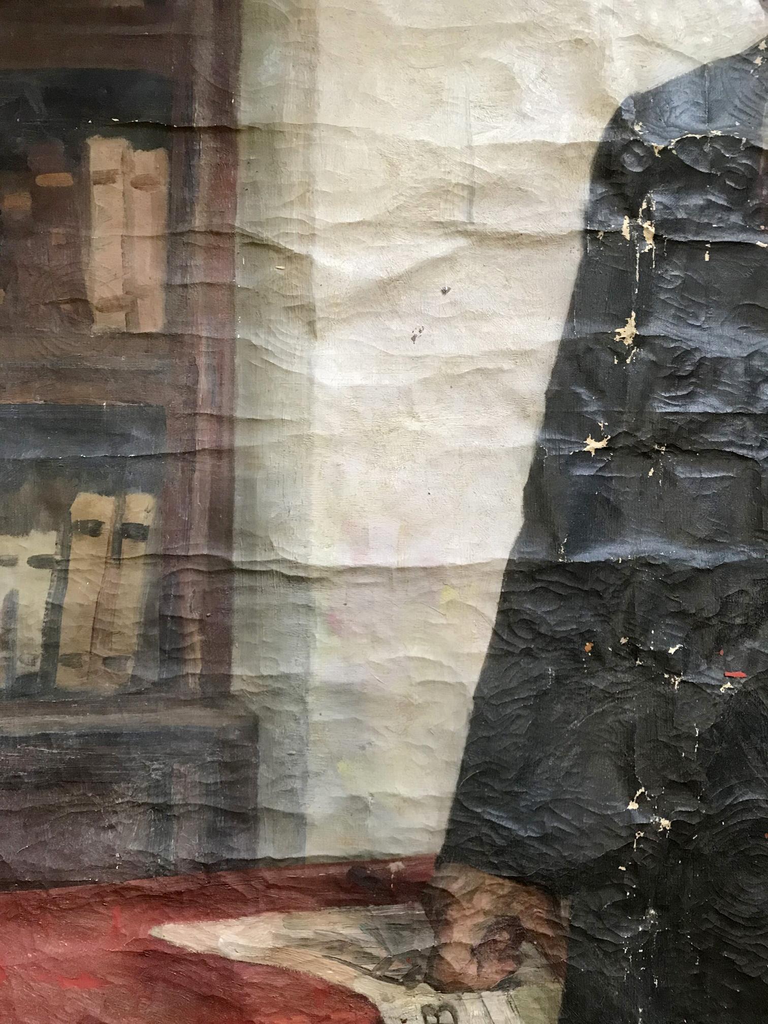 "Portrait of Lenin in the Study" is a captivating oil painting that captures the essence of Vladimir Lenin, the prominent revolutionary and political leader of the early 20th century. The artist skillfully brings Lenin to life, placing him in the foreground of the composition, commanding attention and exuding an aura of intellectual prowess and determination. Lenin, portrayed in a striking black suit with a perfectly tied red tie, stands tall and confident. The white collar of his attire adds a touch of formality and emphasizes his sharp intellect. His facial expression is stoic and introspective, reflecting the weight of his responsibilities and the depth of his thoughts. The focal point of the painting is Lenin's hands, each conveying a different message. His right hand is nonchalantly tucked into his pocket, symbolizing a sense of casual confidence and ease. On the other hand, his left hand rests gently on the table, near a newspaper that lies unfolded upon a vibrant red sheet. This positioning highlights Lenin's engagement with the news and his tireless dedication to understanding the world around him. The table itself, covered in the intense red fabric, serves as a vibrant contrast against the otherwise subdued color palette. It adds a touch of dynamism and energy to the composition, drawing the viewer's attention to the pivotal role that knowledge and information played in Lenin's life. The background of the painting consists of a pristine white wall, evoking a sense of purity and austerity. Adjacent to Lenin, a bookcase stands tall, filled with volumes that represent his vast intellect and unwavering commitment to education and ideological exploration. "Portrait of Lenin in the Study" encapsulates Lenin's intellectual prowess, resolute determination, and profound influence on history. Through careful attention to detail and masterful brushwork, the artist invites viewers to contemplate Lenin's legacy and the significant impact he had on shaping the course of the world.