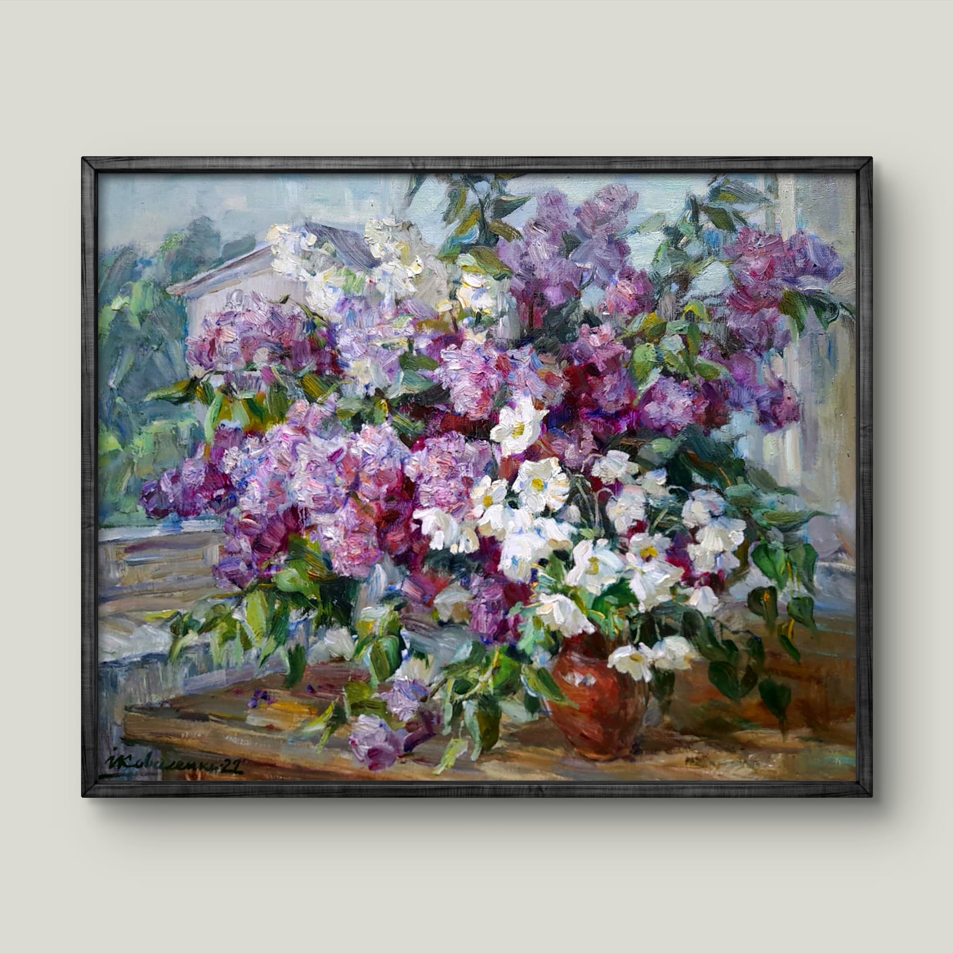 In "Purple Bouquet," Ukrainian artist Kovalenko Ivan masterfully captures the vibrant beauty of a large arrangement of purple and white flowers, placed in a simple clay vase. The rich, vivid hues of the purple blossoms dominate the composition, while the white flowers add contrast, brightening and enhancing the overall harmony of the scene. This stunning piece is a perfect addition to any Collection of Still Lifes, reflecting the natural elegance of everyday objects.