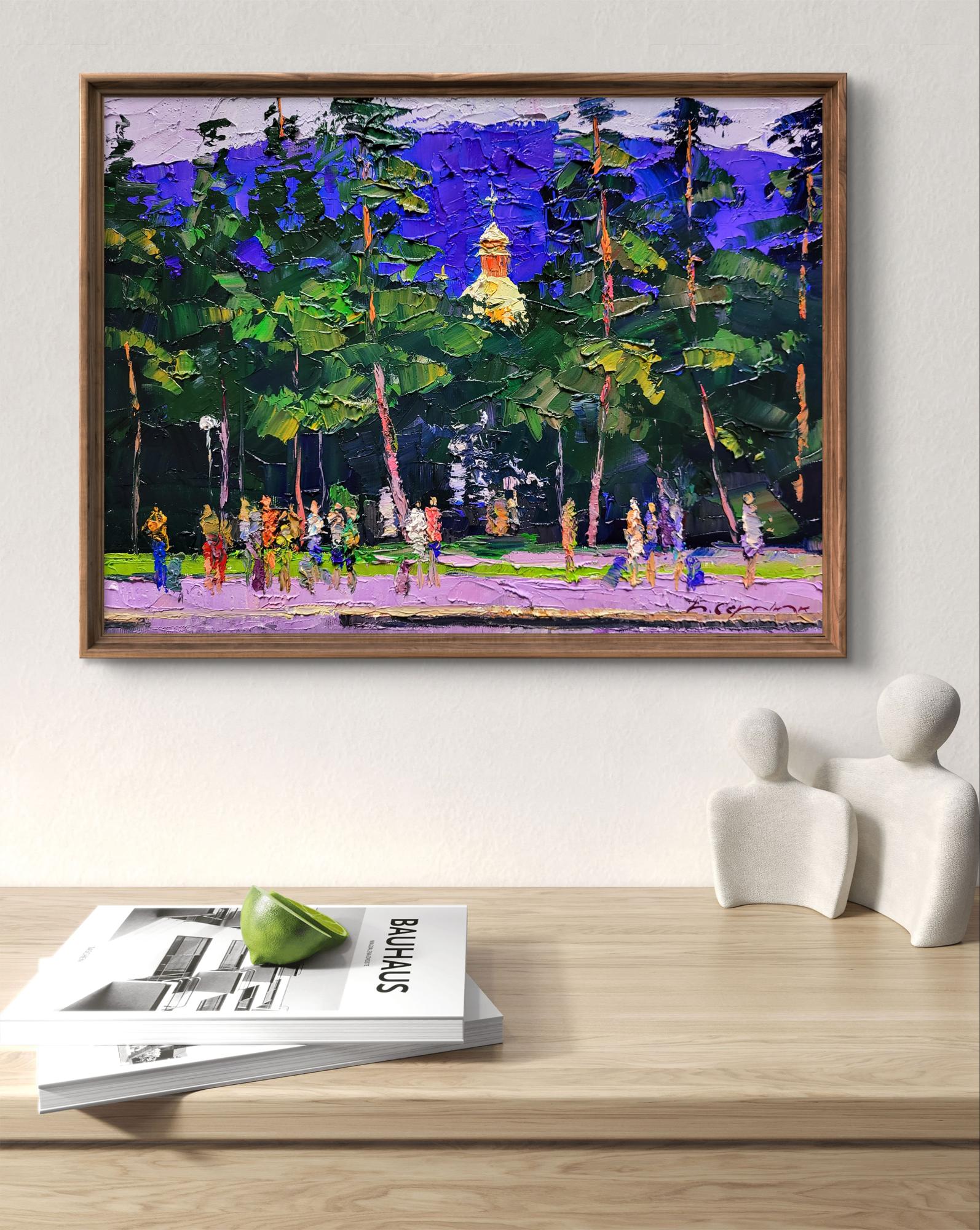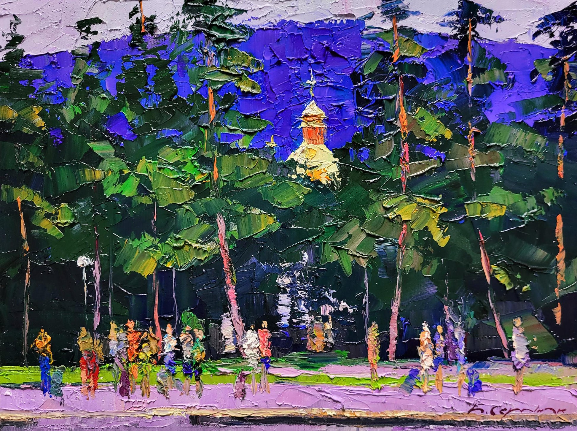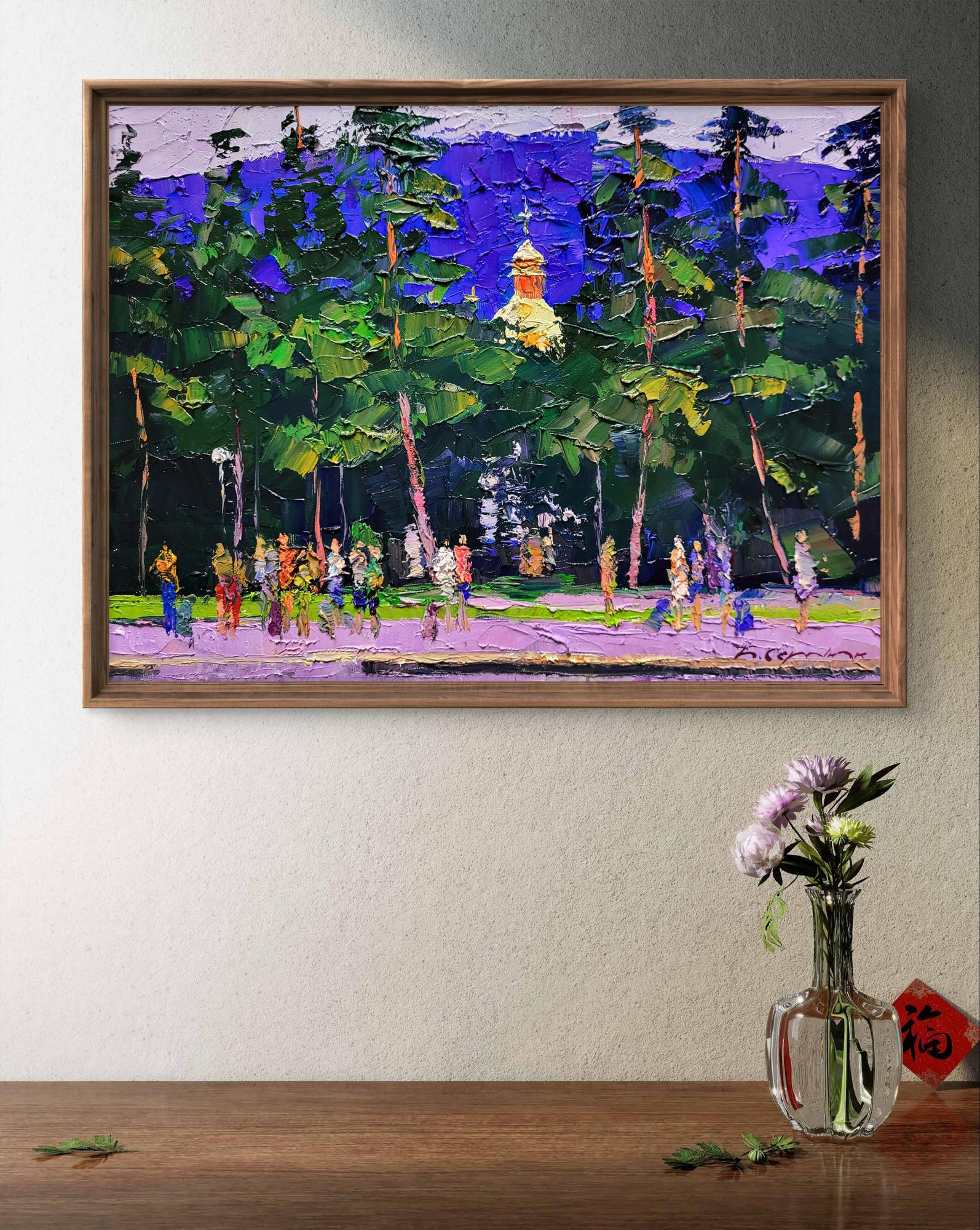 The painting titled "Railway Platform" depicts a lively scene at a train station surrounded by lush greenery and tall pine trees. The composition is filled with vibrant colors and dynamic brushstrokes, capturing the movement and energy of people waiting on the platform. The platform itself, painted in soft shades of purple and gray, stretches across the foreground, providing a grounding element to the scene. Above the trees, a golden church dome with a cross rises into the sky, adding a spiritual and cultural element to the painting.The background is dominated by the tall green trees, their branches creating a natural curtain that partially hides the platform from view. The deep shades of green contrast beautifully with the bright blue and purple tones of the sky. The trees are painted with thick, expressive strokes, giving them a sense of texture and depth. The artist masterfully uses color to convey the mood of a warm, sunny day, with light filtering through the trees and illuminating the figures below.The figures on the platform are depicted in an impressionistic style, with blurred outlines and bright clothing. The diversity of colors used for their clothes — red, yellow, blue, and green — adds vibrancy and life to the scene. These figures represent the daily rhythm of life at a train station, where people gather to meet, depart, or wait for their journeys to continue. Their presence suggests movement and anticipation, a sense of stories unfolding in every direction.In the background, the golden dome of the church peeks out from behind the trees. This architectural element adds a layer of meaning to the painting, symbolizing the presence of tradition and spirituality even in everyday life. The church dome, painted in warm golden hues, contrasts with the cool tones of the trees and sky, drawing the viewer’s attention to it as a focal point.Through "Railway Platform," the artist conveys a message about the intersection of nature, culture, and human life. The painting reflects the idea that even the most mundane locations, like a train station, can be filled with beauty and meaning. The surrounding trees and the presence of the church dome remind viewers of the timeless connection between nature, human activity, and spirituality.The painting evokes a sense of nostalgia and curiosity about the journeys people take — both physical and spiritual. It invites the viewer to reflect on the moments of waiting and transition in life, reminding us that each stop along the way has its own story and significance. "Railway Platform" is a celebration of everyday life, highlighting the harmony between human presence, natural landscapes, and cultural heritage.