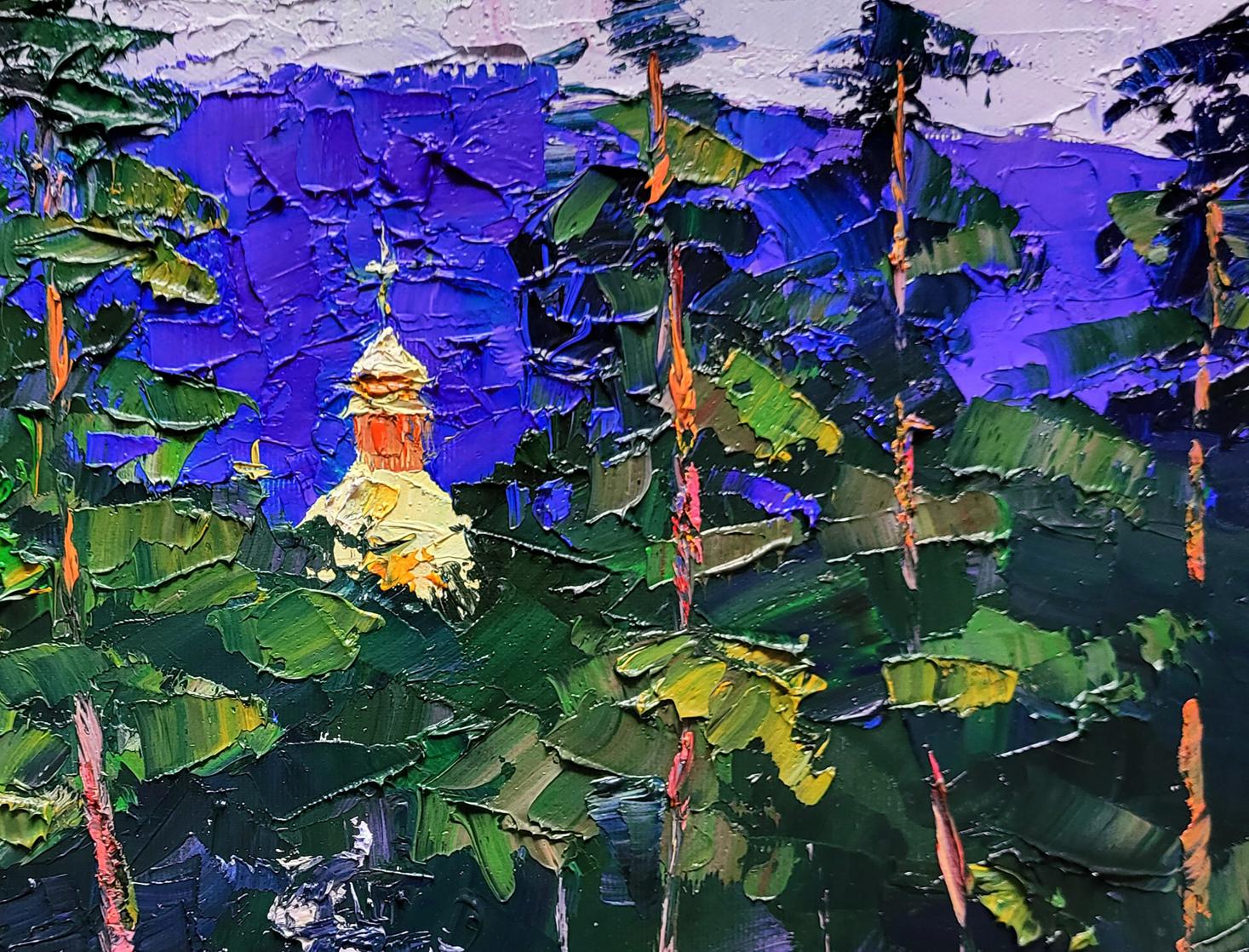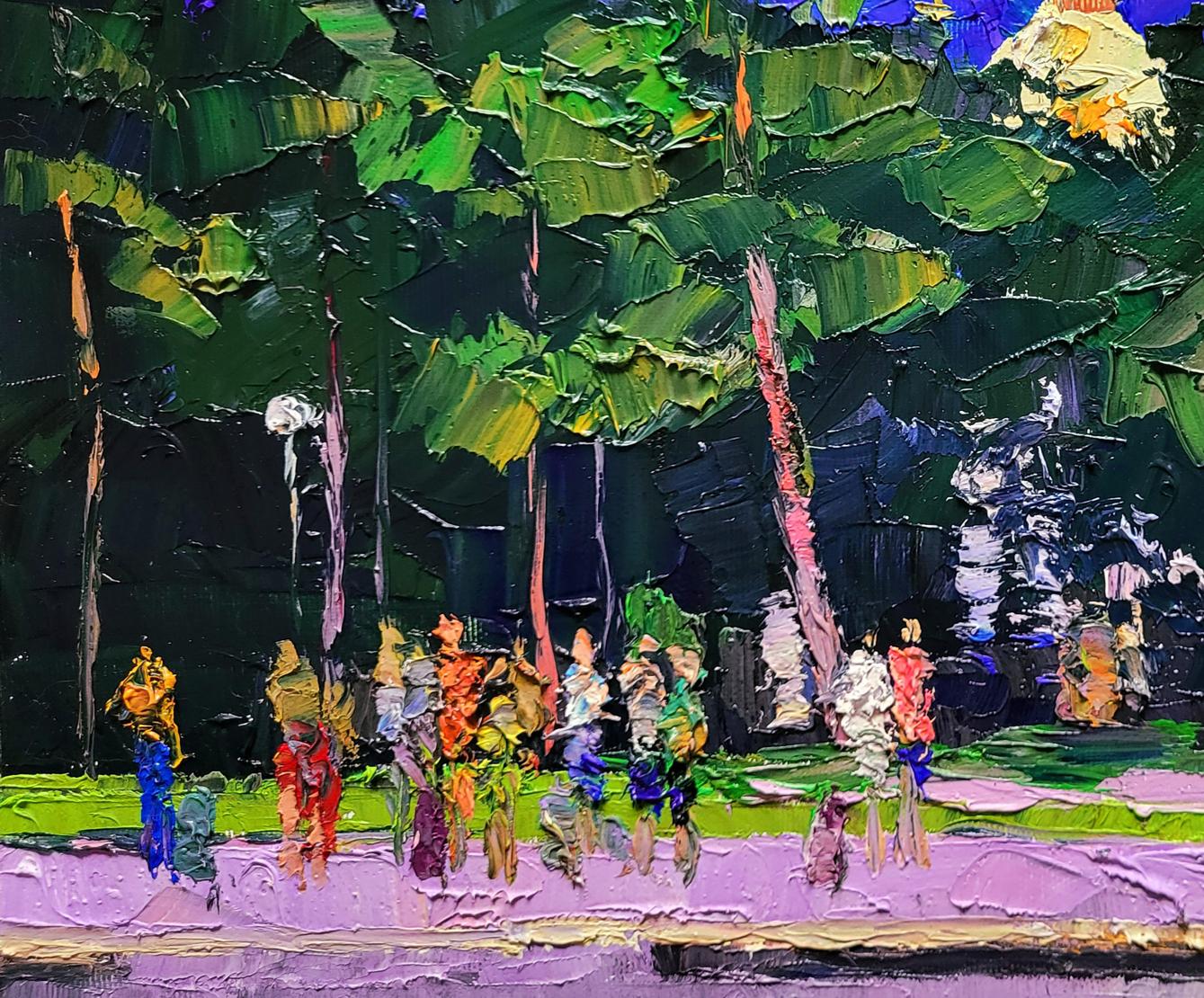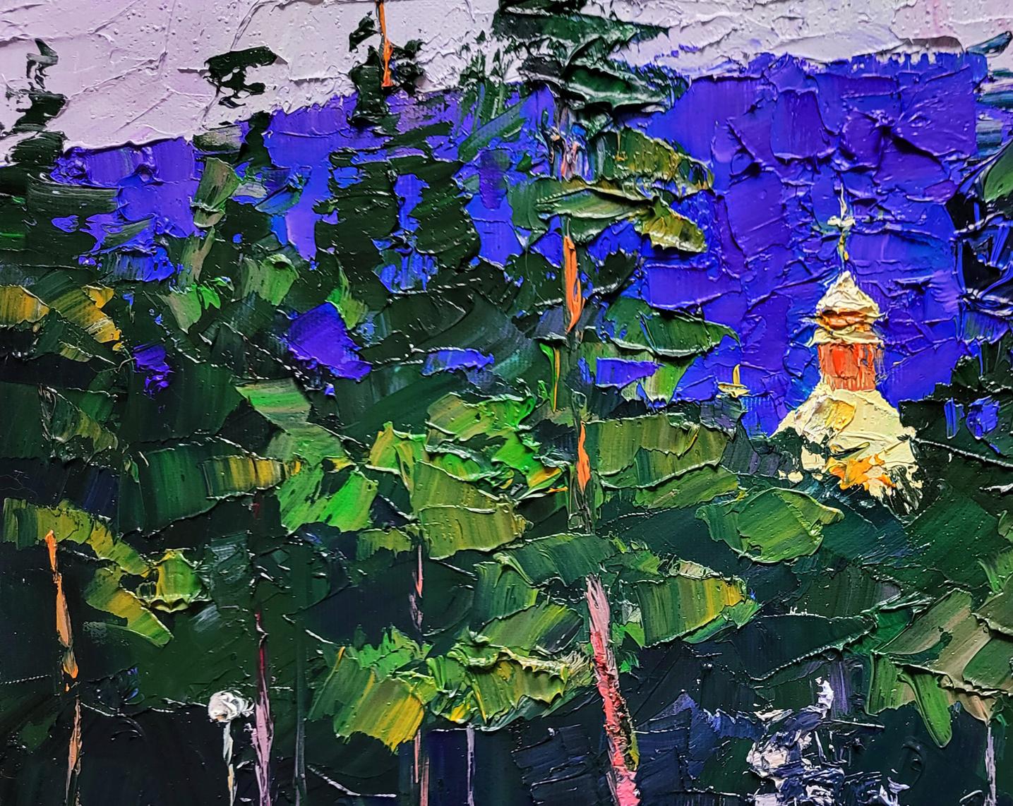 The painting titled "Railway Platform" depicts a lively scene at a train station surrounded by lush greenery and tall pine trees. The composition is filled with vibrant colors and dynamic brushstrokes, capturing the movement and energy of people waiting on the platform. The platform itself, painted in soft shades of purple and gray, stretches across the foreground, providing a grounding element to the scene. Above the trees, a golden church dome with a cross rises into the sky, adding a spiritual and cultural element to the painting.The background is dominated by the tall green trees, their branches creating a natural curtain that partially hides the platform from view. The deep shades of green contrast beautifully with the bright blue and purple tones of the sky. The trees are painted with thick, expressive strokes, giving them a sense of texture and depth. The artist masterfully uses color to convey the mood of a warm, sunny day, with light filtering through the trees and illuminating the figures below.The figures on the platform are depicted in an impressionistic style, with blurred outlines and bright clothing. The diversity of colors used for their clothes — red, yellow, blue, and green — adds vibrancy and life to the scene. These figures represent the daily rhythm of life at a train station, where people gather to meet, depart, or wait for their journeys to continue. Their presence suggests movement and anticipation, a sense of stories unfolding in every direction.In the background, the golden dome of the church peeks out from behind the trees. This architectural element adds a layer of meaning to the painting, symbolizing the presence of tradition and spirituality even in everyday life. The church dome, painted in warm golden hues, contrasts with the cool tones of the trees and sky, drawing the viewer’s attention to it as a focal point.Through "Railway Platform," the artist conveys a message about the intersection of nature, culture, and human life. The painting reflects the idea that even the most mundane locations, like a train station, can be filled with beauty and meaning. The surrounding trees and the presence of the church dome remind viewers of the timeless connection between nature, human activity, and spirituality.The painting evokes a sense of nostalgia and curiosity about the journeys people take — both physical and spiritual. It invites the viewer to reflect on the moments of waiting and transition in life, reminding us that each stop along the way has its own story and significance. "Railway Platform" is a celebration of everyday life, highlighting the harmony between human presence, natural landscapes, and cultural heritage.