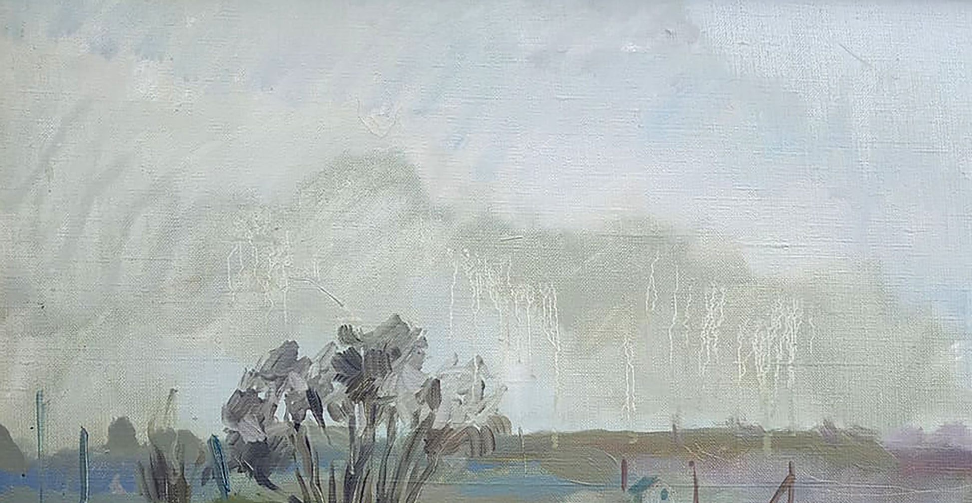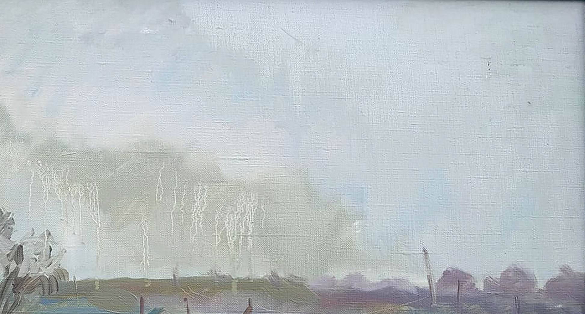 In "Rainy Day," Ukrainian artist Mazur Vladimir captures a tranquil landscape softened by the diffused light of an overcast sky. The muted, earthy tones of soft greens and browns suggest the serenity of a day either during or after rainfall. The blurred edges of the trees and the horizon, combined with gentle streaks in the sky, evoke the misty, damp atmosphere that follows a rainstorm. The artist’s use of delicate brushstrokes adds a sense of movement to the sky, while the earth below remains calm and grounded.