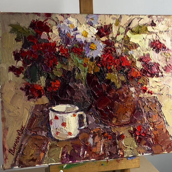 "Red viburnum and poppies" is a symphony of colors and textures, a still life that resonates with the abundance and serenity of home life. The lush reds of the viburnum, symbolizing the heart's vitality and nature's generosity, take center stage, while the complementary hues of blues and purples create a backdrop that accentuates their richness. The inclusion of a classic white mug, adorned with motifs that echo the red of the berries, adds a touch of domestic harmony to the scene.
