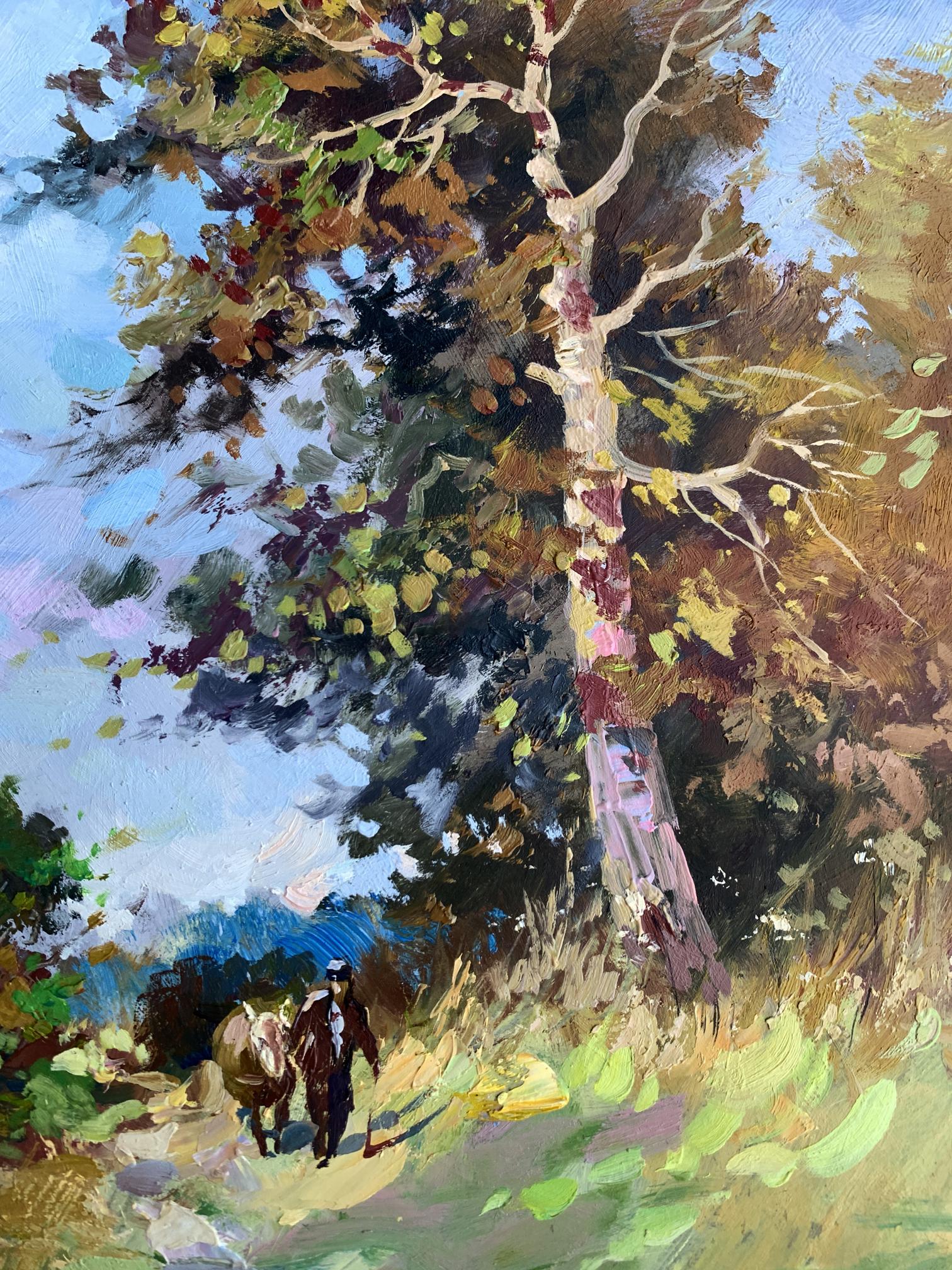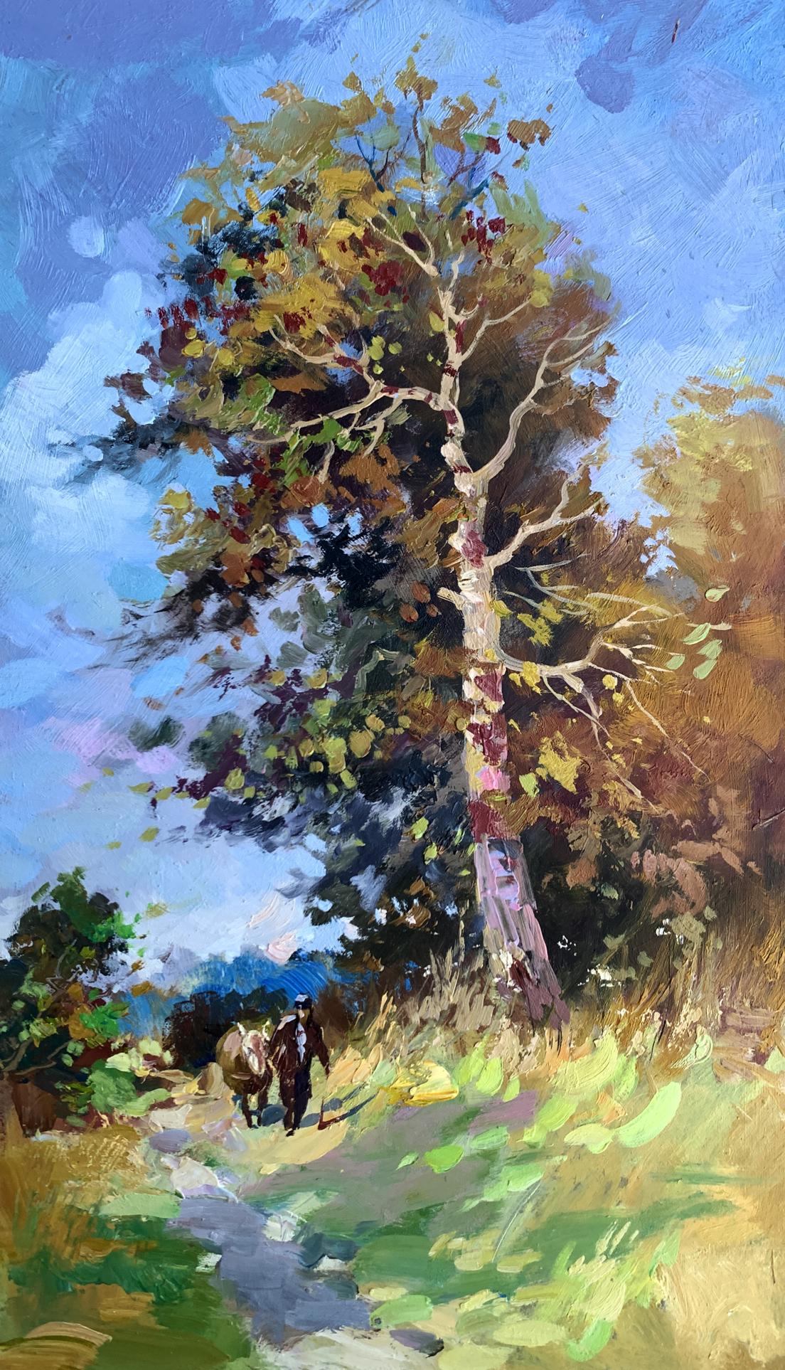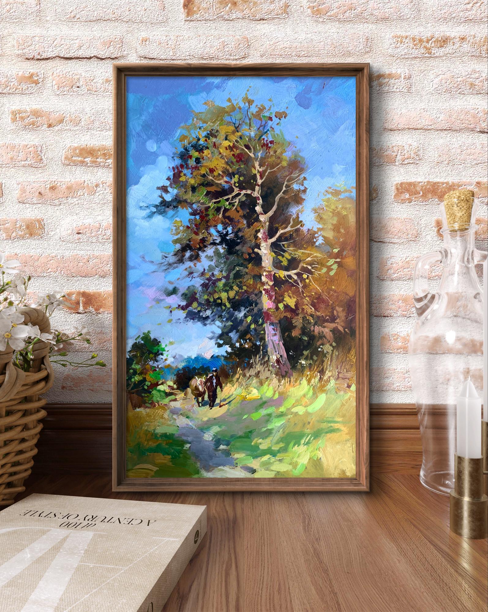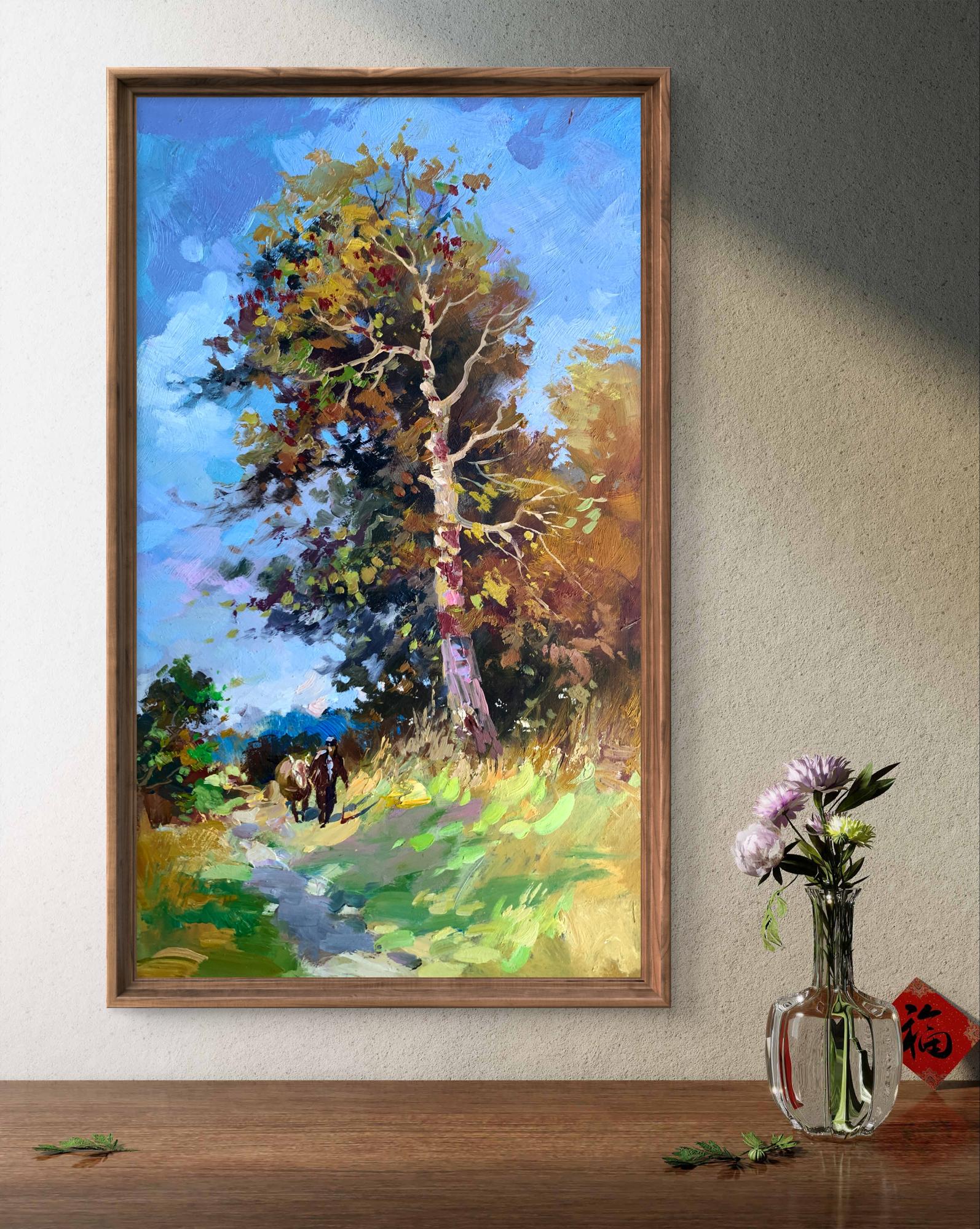 The painting "Returning Home" captures a serene countryside scene, evoking the warmth and simplicity of rural life. Painted with oil on cardboard, the composition draws the viewer into a tranquil moment of transition as two figures, likely a farmer and their animal, walk along a sunlit path toward home.The tall tree in the foreground dominates the composition, its golden and green leaves shimmering under the afternoon sunlight. The play of light and shadow is masterfully executed, creating depth and vibrancy. The tree stands as a silent guardian, marking the path and symbolizing resilience and growth. The winding trail, partially covered in dappled light, guides the eye naturally through the artwork, leading toward the figures and into the distance, where the horizon blends into the sky.The figures, though small in scale compared to the towering tree, add a human element to the piece, highlighting the harmony between people and nature. The earthy tones of their attire blend seamlessly with the surrounding environment, suggesting a life deeply connected to the land. The background features patches of soft blue sky, dotted with hints of foliage, creating a sense of openness and freedom.Through this painting, the artist communicates a sense of homecoming and belonging. The journey of the figures symbolizes a return not only to a physical place but to a sense of comfort, safety, and connection with nature. The warm palette and dynamic brushstrokes bring the scene to life, making the viewer feel the gentle rustle of leaves and the soft crunch of the path underfoot.Ultimately, "Returning Home" reflects the beauty of simple pleasures and the deep-rooted relationship between humanity and the natural world. The artist’s intent seems to be a celebration of rural life and its timeless rhythm, offering a moment of peace and reflection to anyone who views the work.