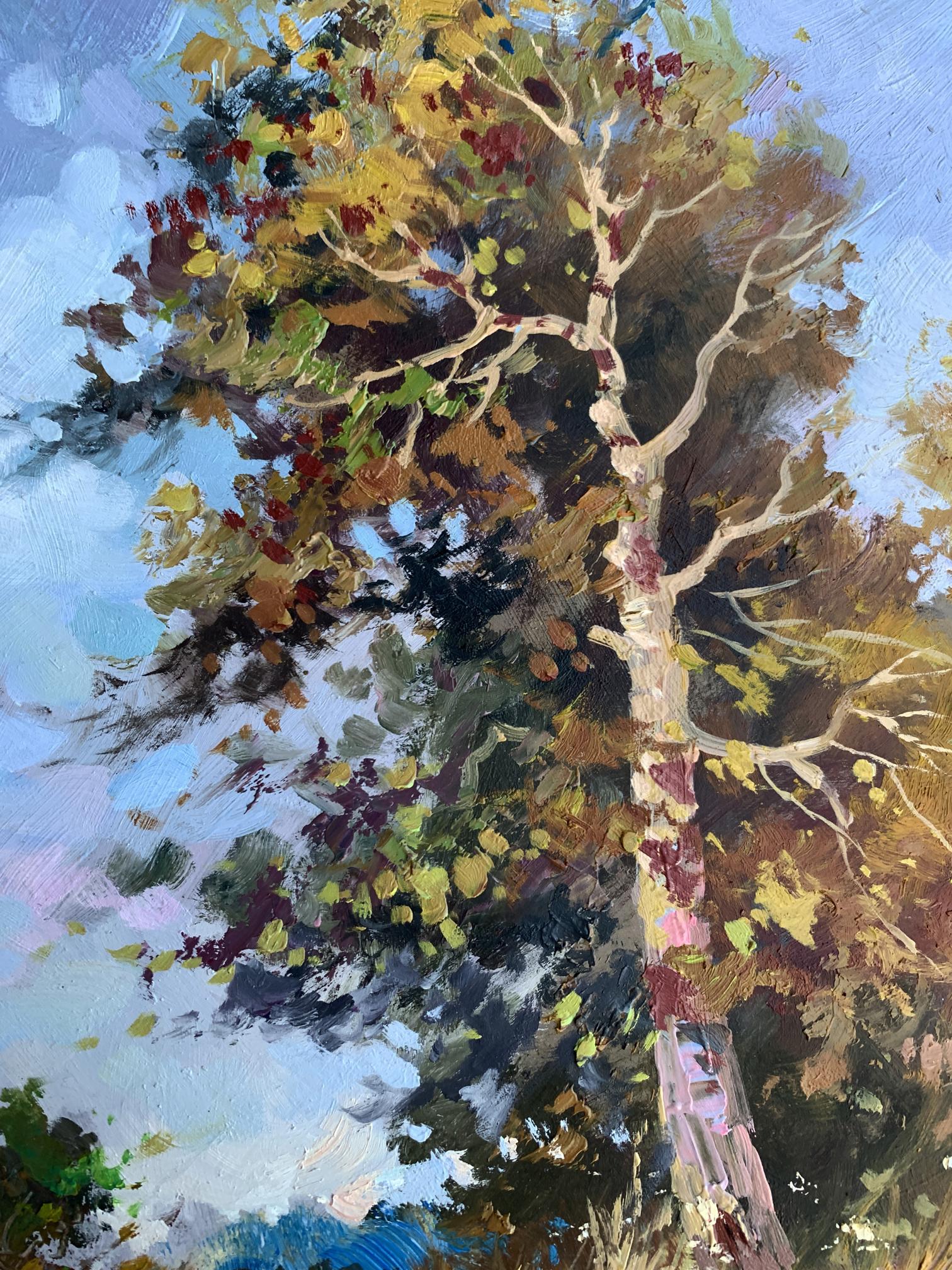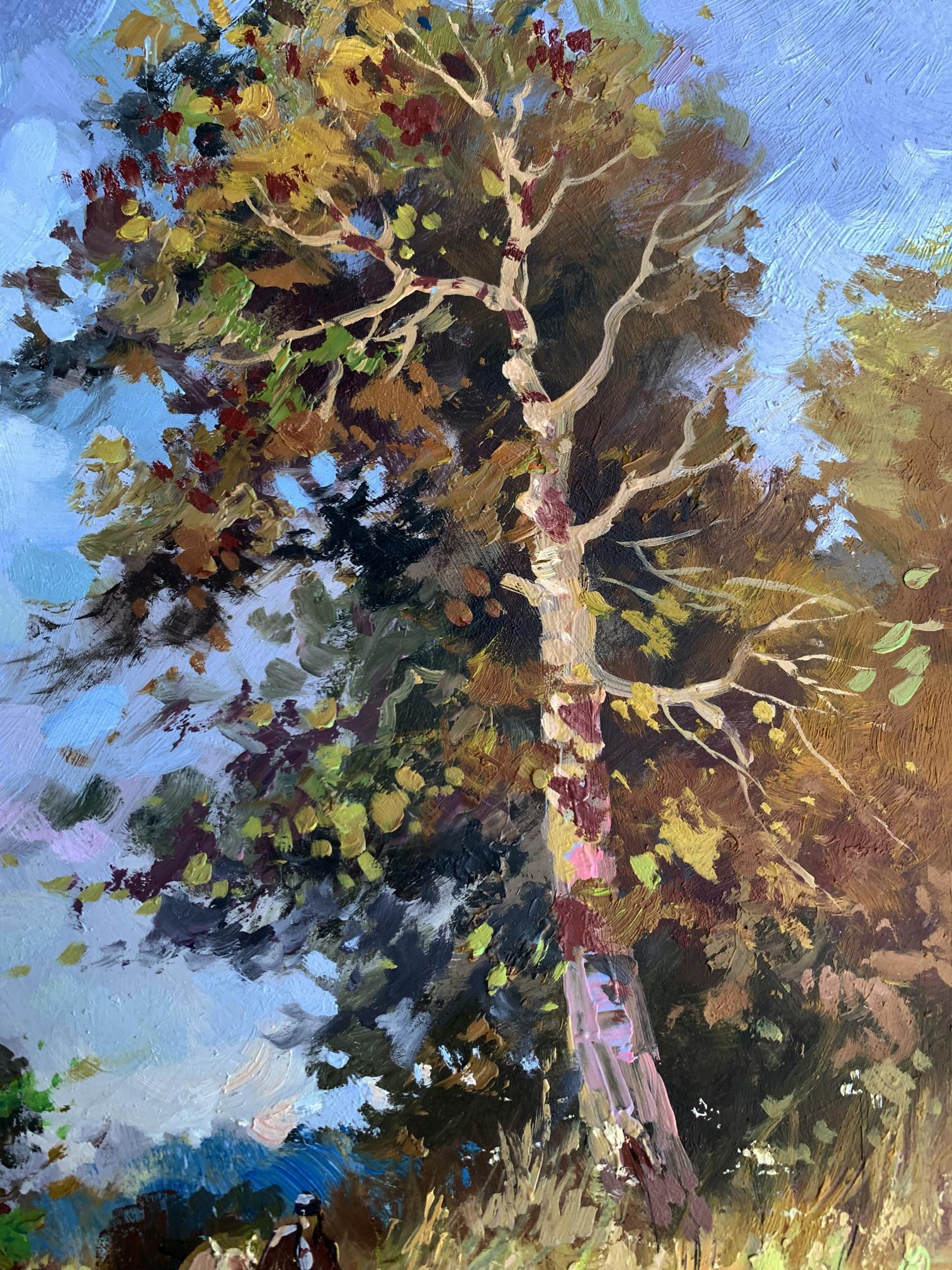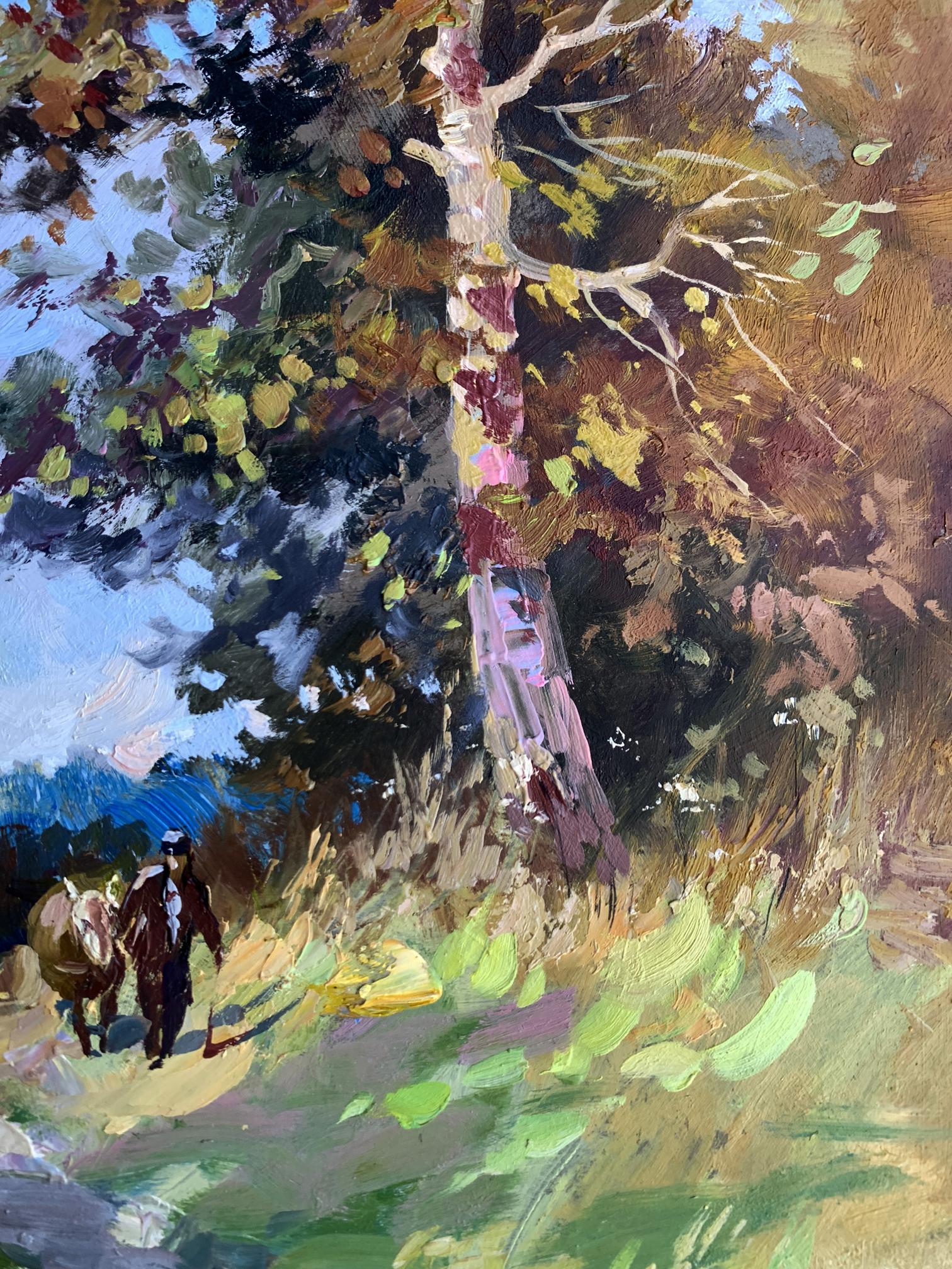 The painting "Returning Home" captures a serene countryside scene, evoking the warmth and simplicity of rural life. Painted with oil on cardboard, the composition draws the viewer into a tranquil moment of transition as two figures, likely a farmer and their animal, walk along a sunlit path toward home.The tall tree in the foreground dominates the composition, its golden and green leaves shimmering under the afternoon sunlight. The play of light and shadow is masterfully executed, creating depth and vibrancy. The tree stands as a silent guardian, marking the path and symbolizing resilience and growth. The winding trail, partially covered in dappled light, guides the eye naturally through the artwork, leading toward the figures and into the distance, where the horizon blends into the sky.The figures, though small in scale compared to the towering tree, add a human element to the piece, highlighting the harmony between people and nature. The earthy tones of their attire blend seamlessly with the surrounding environment, suggesting a life deeply connected to the land. The background features patches of soft blue sky, dotted with hints of foliage, creating a sense of openness and freedom.Through this painting, the artist communicates a sense of homecoming and belonging. The journey of the figures symbolizes a return not only to a physical place but to a sense of comfort, safety, and connection with nature. The warm palette and dynamic brushstrokes bring the scene to life, making the viewer feel the gentle rustle of leaves and the soft crunch of the path underfoot.Ultimately, "Returning Home" reflects the beauty of simple pleasures and the deep-rooted relationship between humanity and the natural world. The artist’s intent seems to be a celebration of rural life and its timeless rhythm, offering a moment of peace and reflection to anyone who views the work.