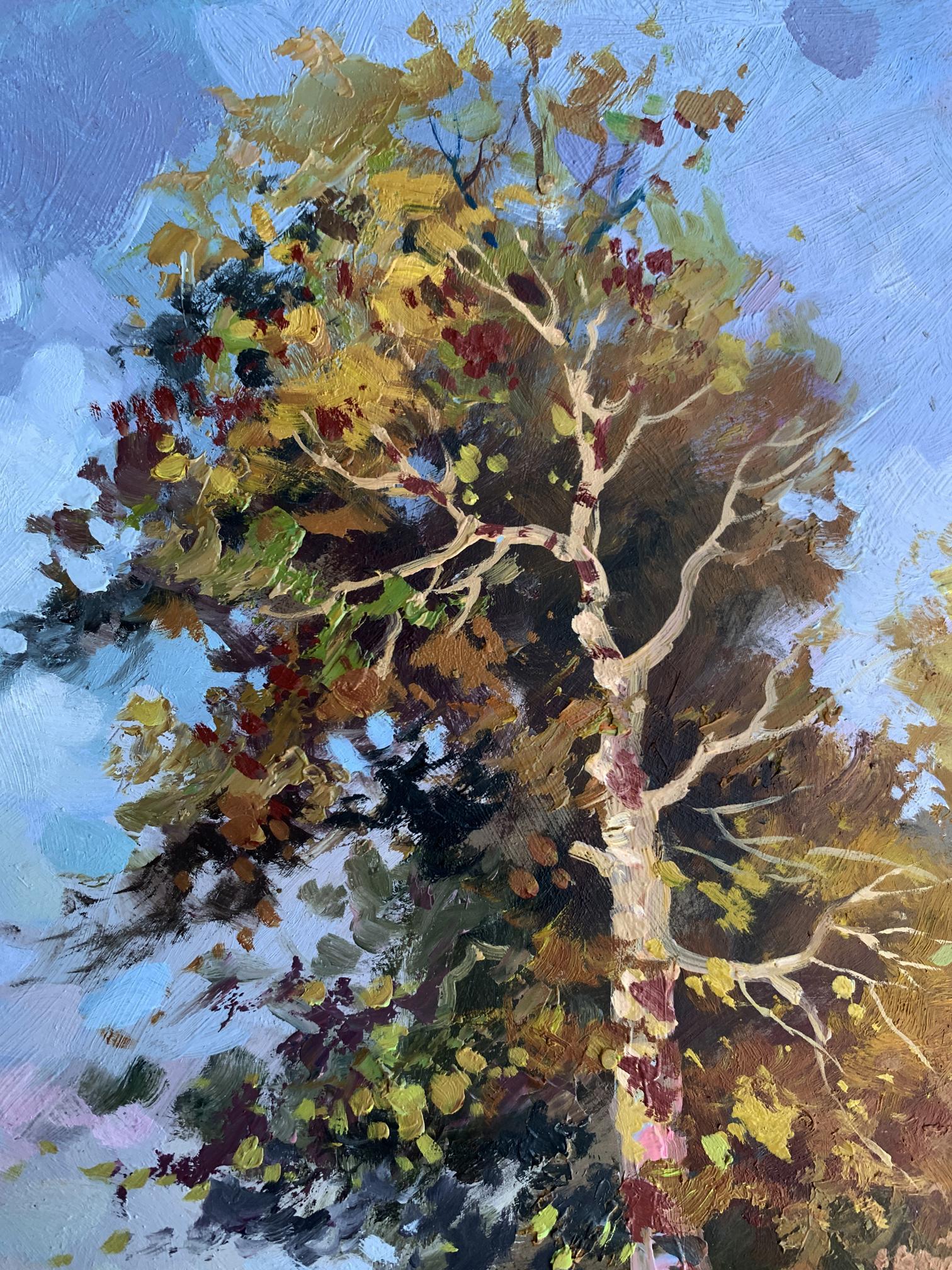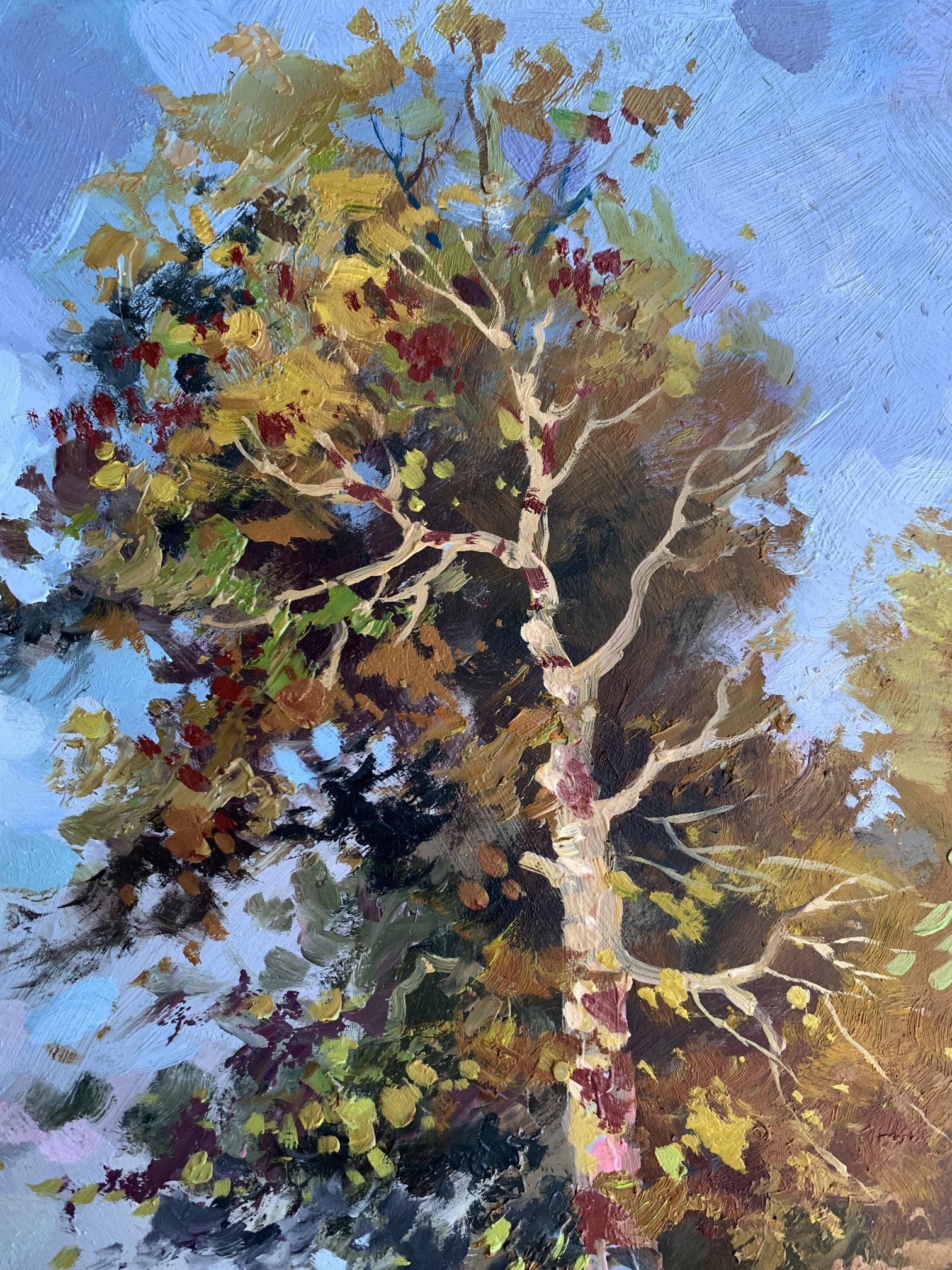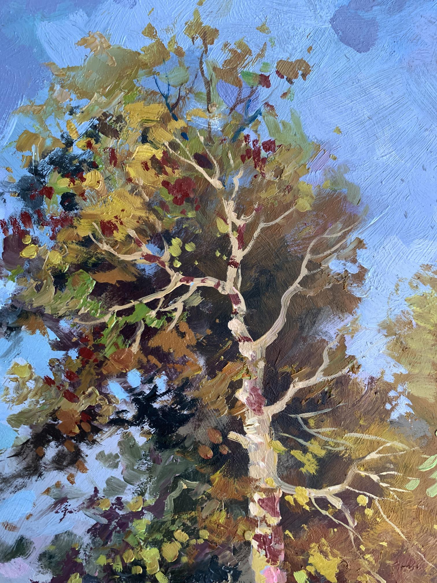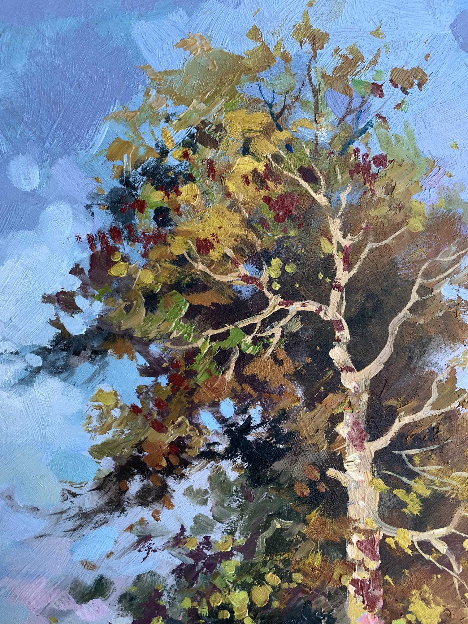 The painting "Returning Home" captures a serene countryside scene, evoking the warmth and simplicity of rural life. Painted with oil on cardboard, the composition draws the viewer into a tranquil moment of transition as two figures, likely a farmer and their animal, walk along a sunlit path toward home.The tall tree in the foreground dominates the composition, its golden and green leaves shimmering under the afternoon sunlight. The play of light and shadow is masterfully executed, creating depth and vibrancy. The tree stands as a silent guardian, marking the path and symbolizing resilience and growth. The winding trail, partially covered in dappled light, guides the eye naturally through the artwork, leading toward the figures and into the distance, where the horizon blends into the sky.The figures, though small in scale compared to the towering tree, add a human element to the piece, highlighting the harmony between people and nature. The earthy tones of their attire blend seamlessly with the surrounding environment, suggesting a life deeply connected to the land. The background features patches of soft blue sky, dotted with hints of foliage, creating a sense of openness and freedom.Through this painting, the artist communicates a sense of homecoming and belonging. The journey of the figures symbolizes a return not only to a physical place but to a sense of comfort, safety, and connection with nature. The warm palette and dynamic brushstrokes bring the scene to life, making the viewer feel the gentle rustle of leaves and the soft crunch of the path underfoot.Ultimately, "Returning Home" reflects the beauty of simple pleasures and the deep-rooted relationship between humanity and the natural world. The artist’s intent seems to be a celebration of rural life and its timeless rhythm, offering a moment of peace and reflection to anyone who views the work.