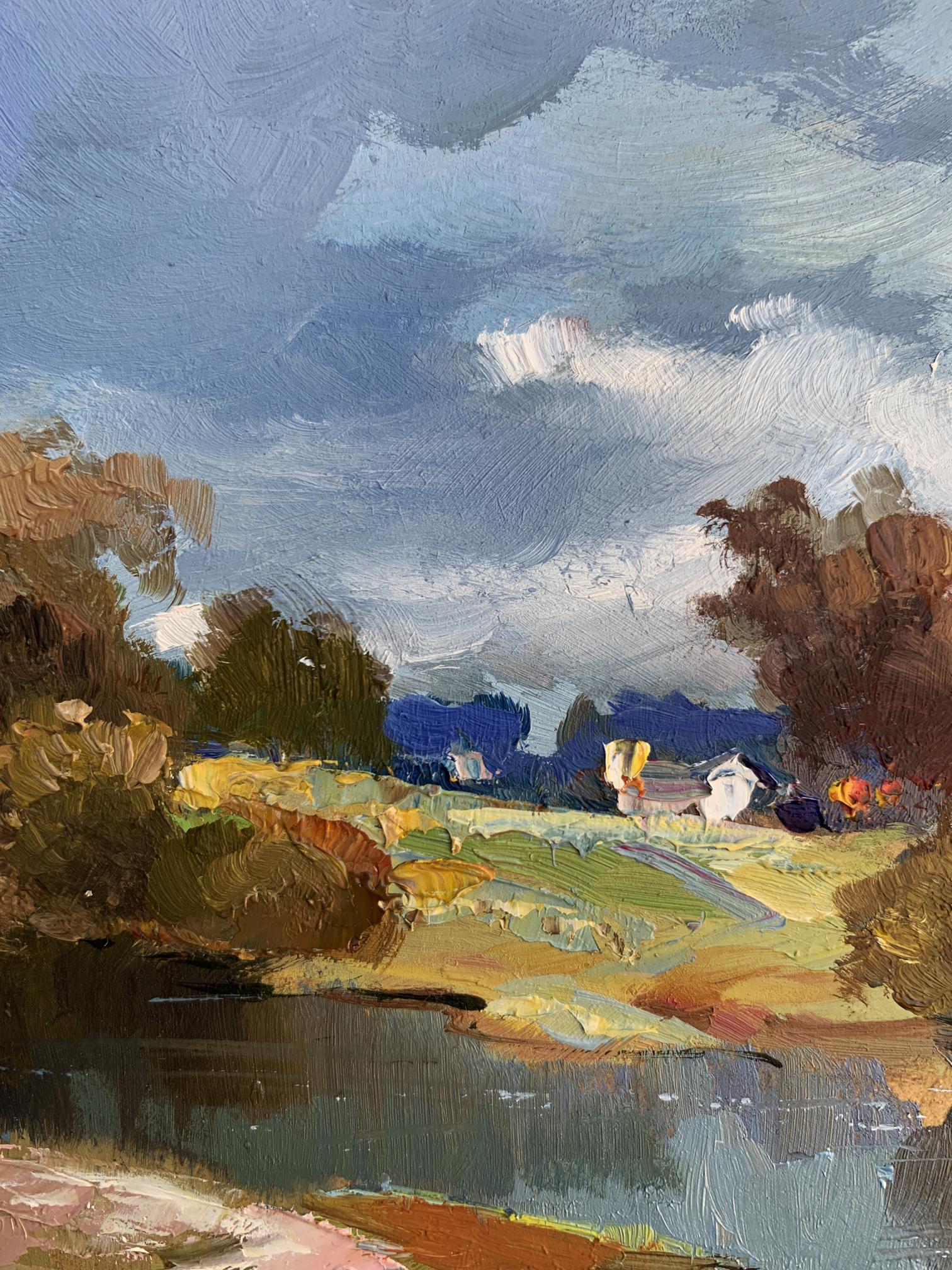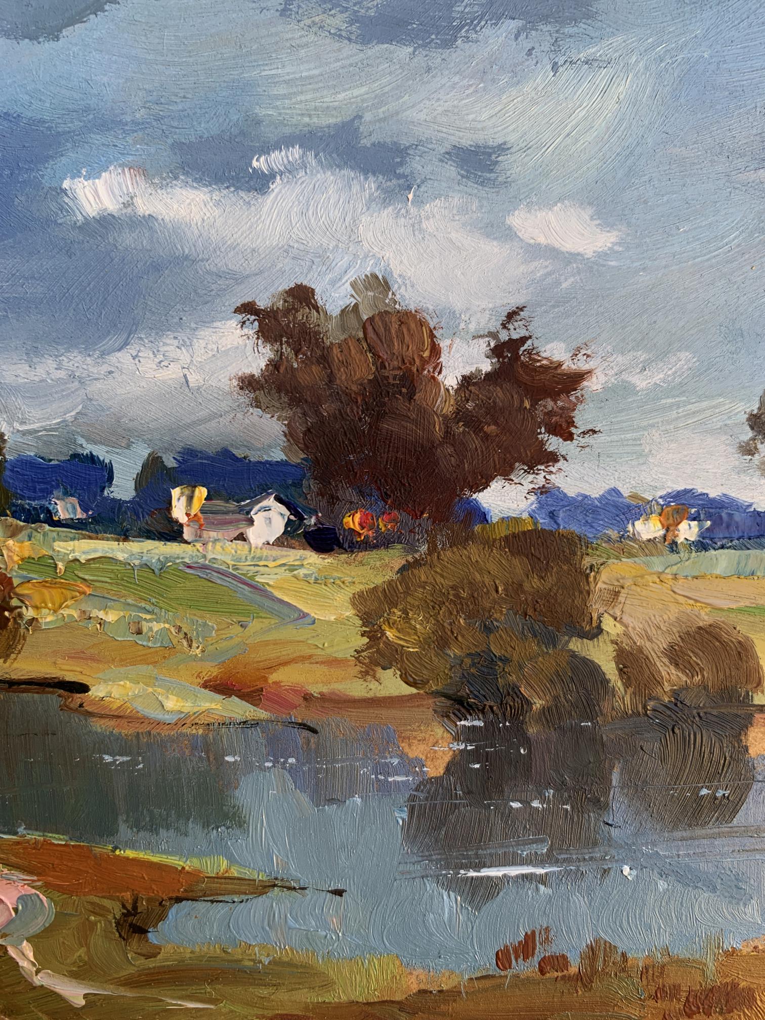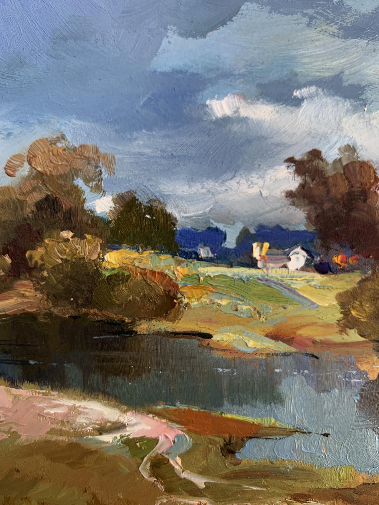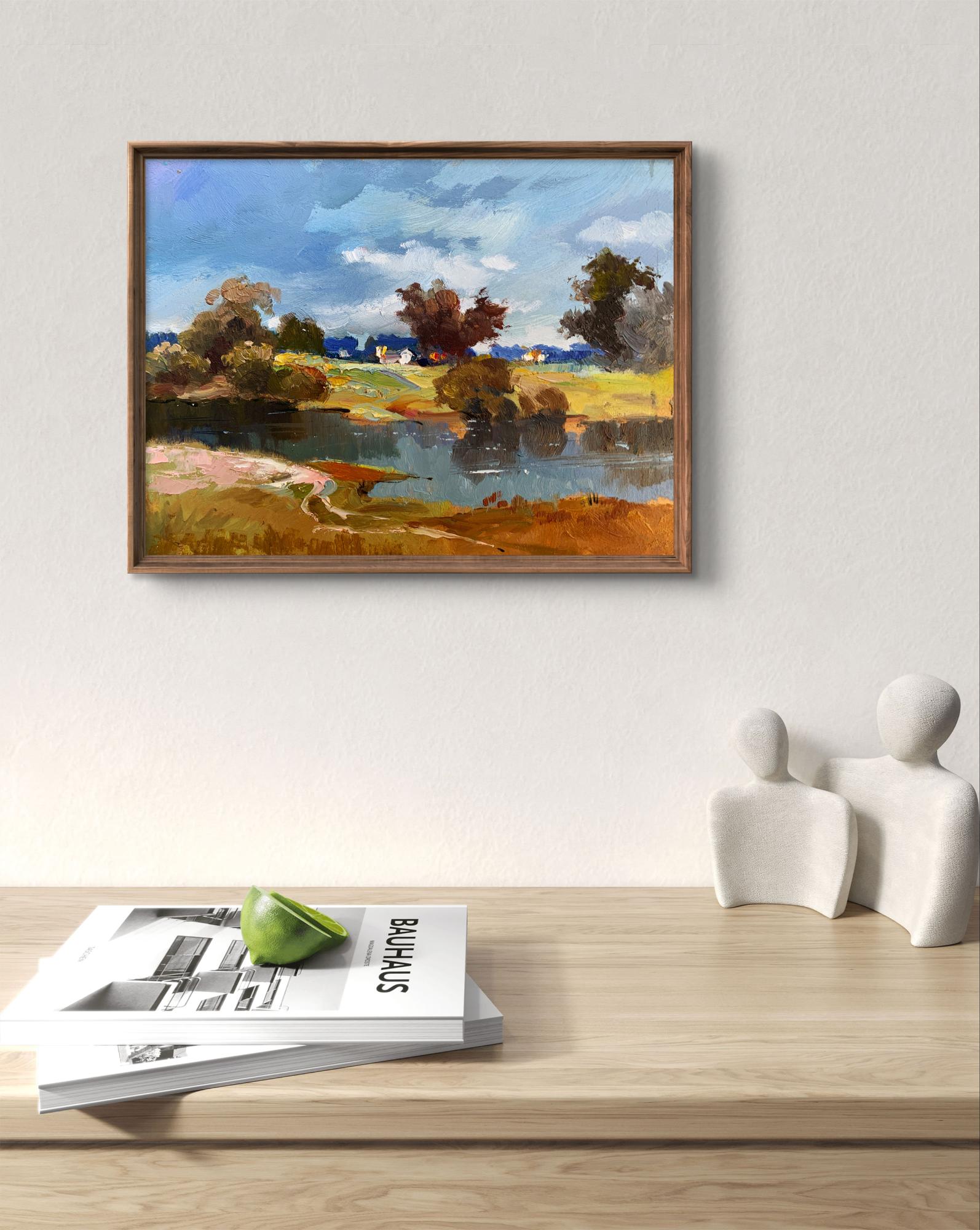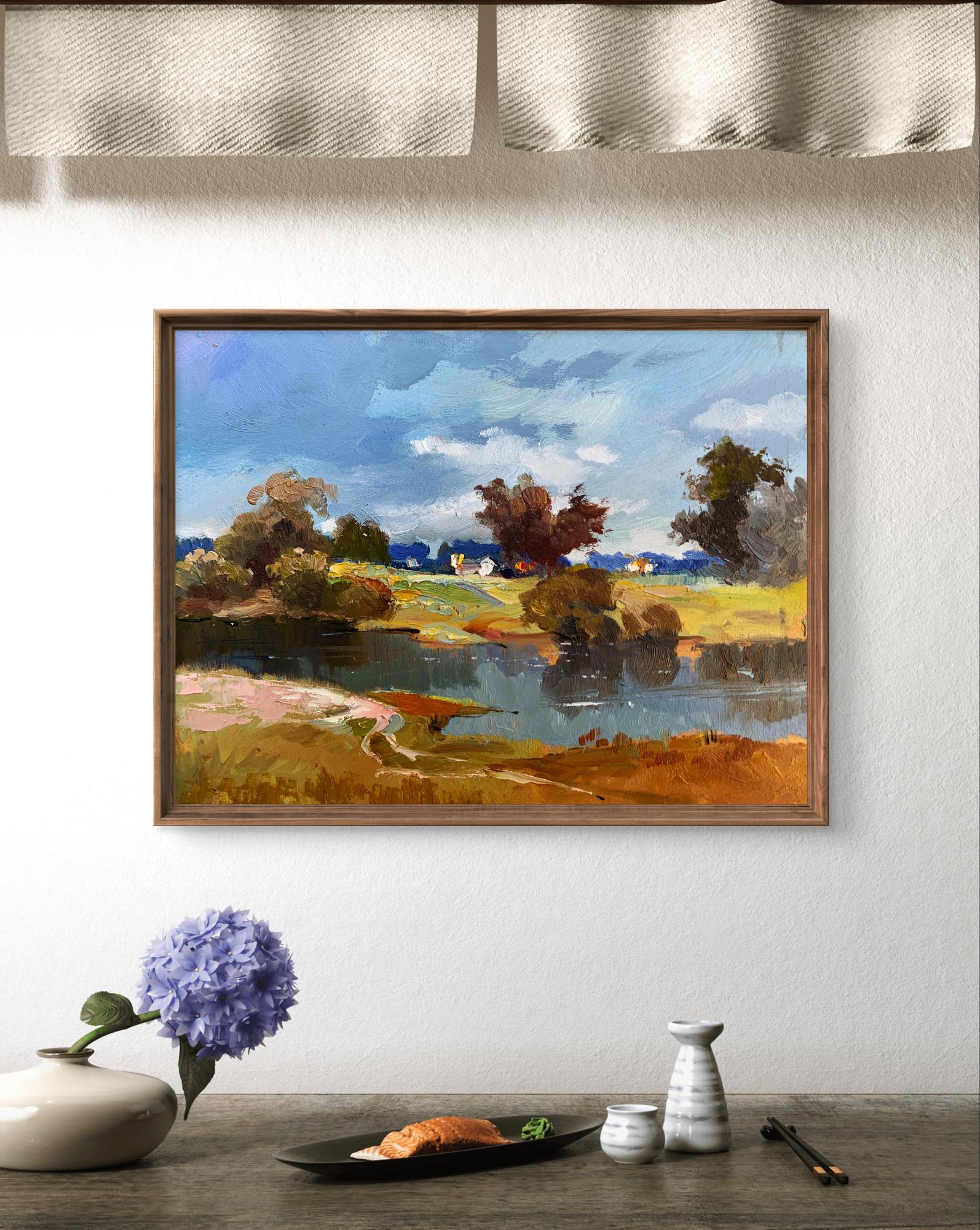 The painting "River Silence" presents a tranquil and picturesque rural landscape, highlighting the serene beauty of a quiet river surrounded by nature. Executed in oil on cardboard, the artwork captures the delicate interplay of light, water, and land, immersing the viewer in a peaceful moment where time seems to stand still. The composition emphasizes the harmony between the natural elements and human presence, subtly woven into the background.In the foreground, the calm river reflects the surrounding trees and sky with remarkable clarity, its surface interrupted only by gentle ripples. The water, painted in deep blues and soft greens, conveys a sense of depth and stillness. Along the riverbank, patches of earthy tones—browns, ochres, and muted greens—suggest a natural, unspoiled environment. A sandy curve at the edge of the water adds texture and a sense of accessibility, as if inviting the viewer to step closer.The middle ground transitions to open fields dotted with trees and shrubs, painted with loose, impressionistic strokes. The warm yellows and greens of the grass contrast with the cooler tones of the water, creating a balanced and harmonious palette. Among the fields, a small cluster of houses with white walls and colorful roofs provides a subtle but significant human presence, blending seamlessly with the natural surroundings. The houses, though distant, add warmth and a sense of life to the composition.The background features a line of trees in varying shades of green and brown, their forms softened by distance and atmospheric perspective. The sky above dominates the scene, painted in a vibrant mix of blues and whites. The dynamic brushstrokes of the clouds suggest a breezy day, adding movement and energy to the otherwise still landscape.Through "River Silence," the artist conveys a deep appreciation for the beauty of unhurried, rural life. The painting captures the soothing stillness of nature, offering the viewer a moment of reflection and tranquility. The calm river serves as a central element, symbolizing the timeless flow of life and the connection between humans and their environment.This work celebrates the harmony and simplicity of rural landscapes, emphasizing the restorative power of nature. The artist’s use of vibrant colors and expressive brushstrokes evokes feelings of peace and nostalgia, inviting the viewer to pause and appreciate the quiet beauty of the natural world. It is a tribute to the enduring allure of serene moments by the river, where life feels balanced and whole.