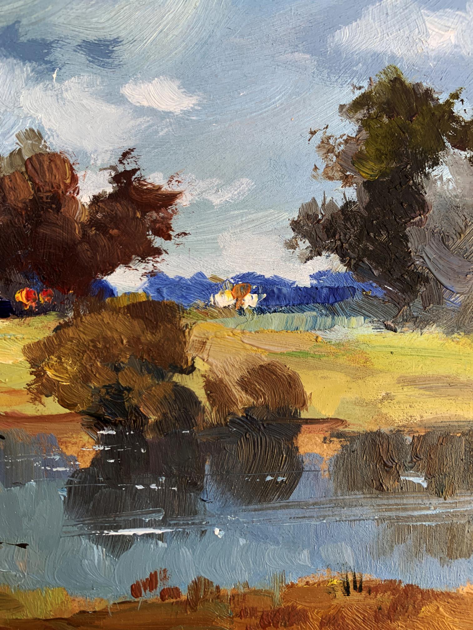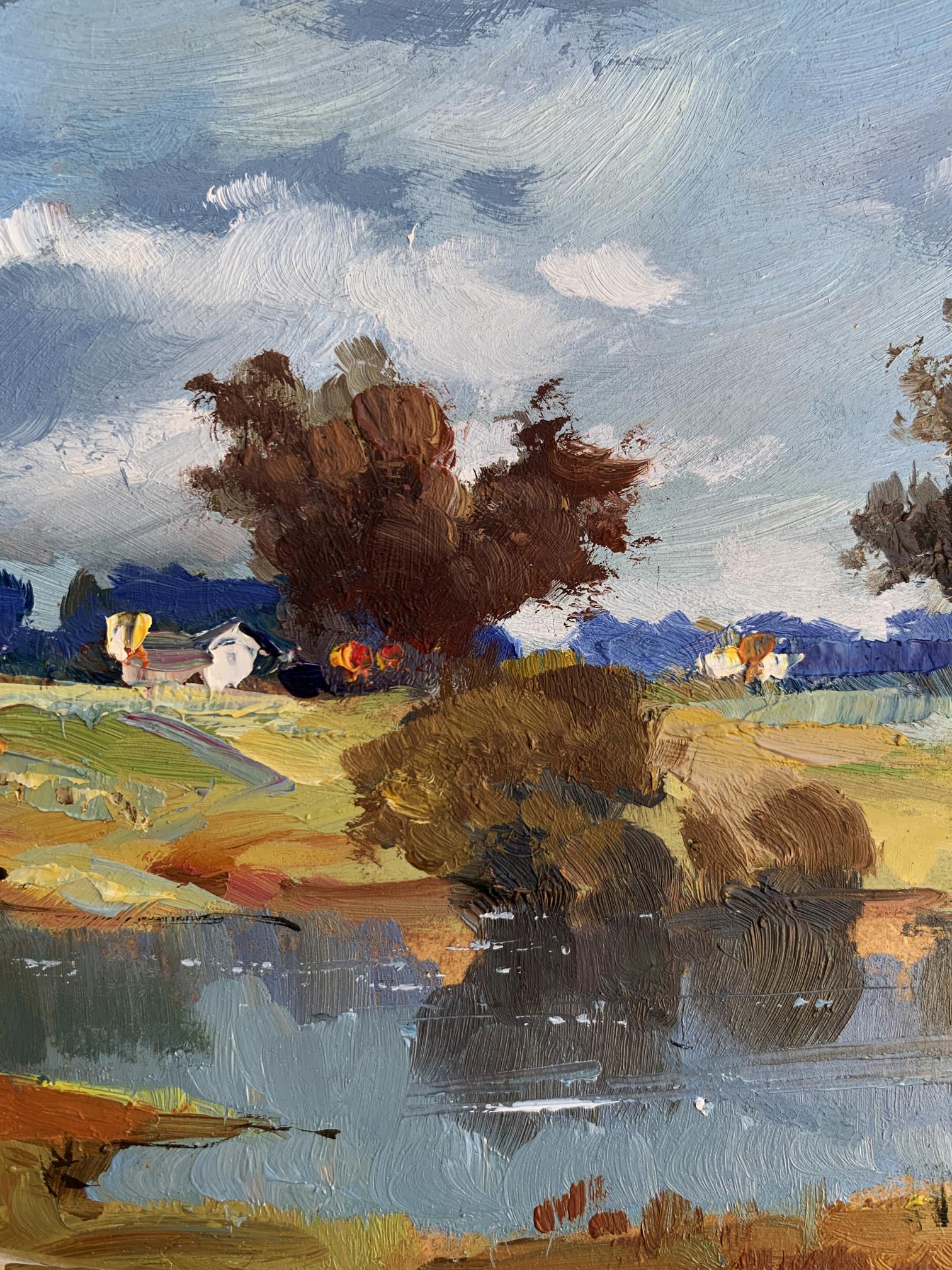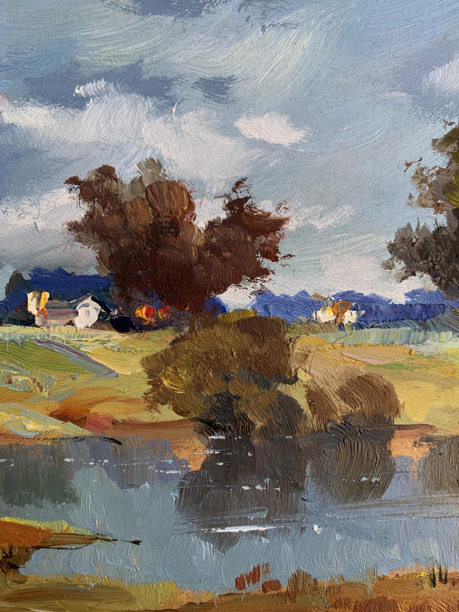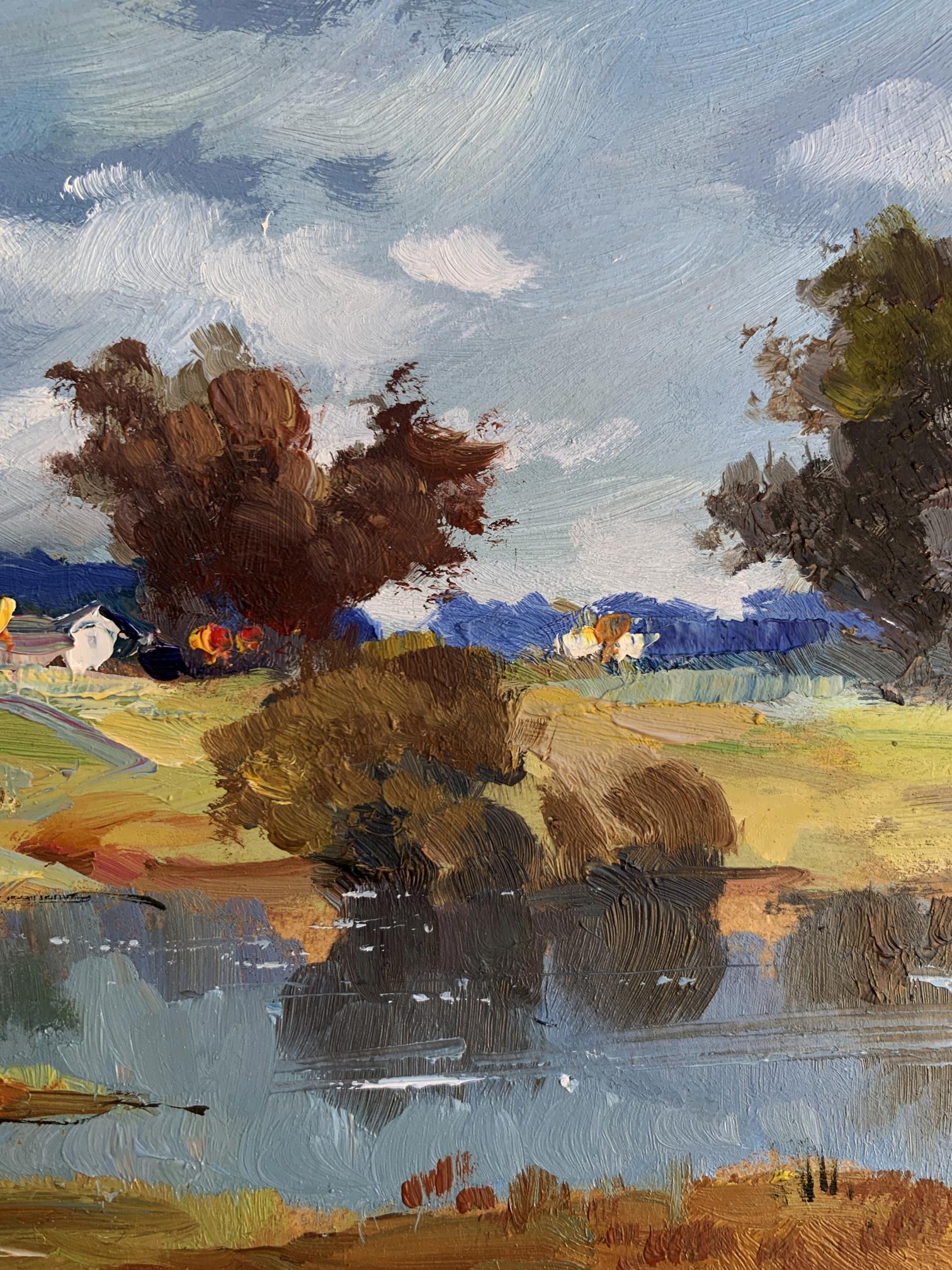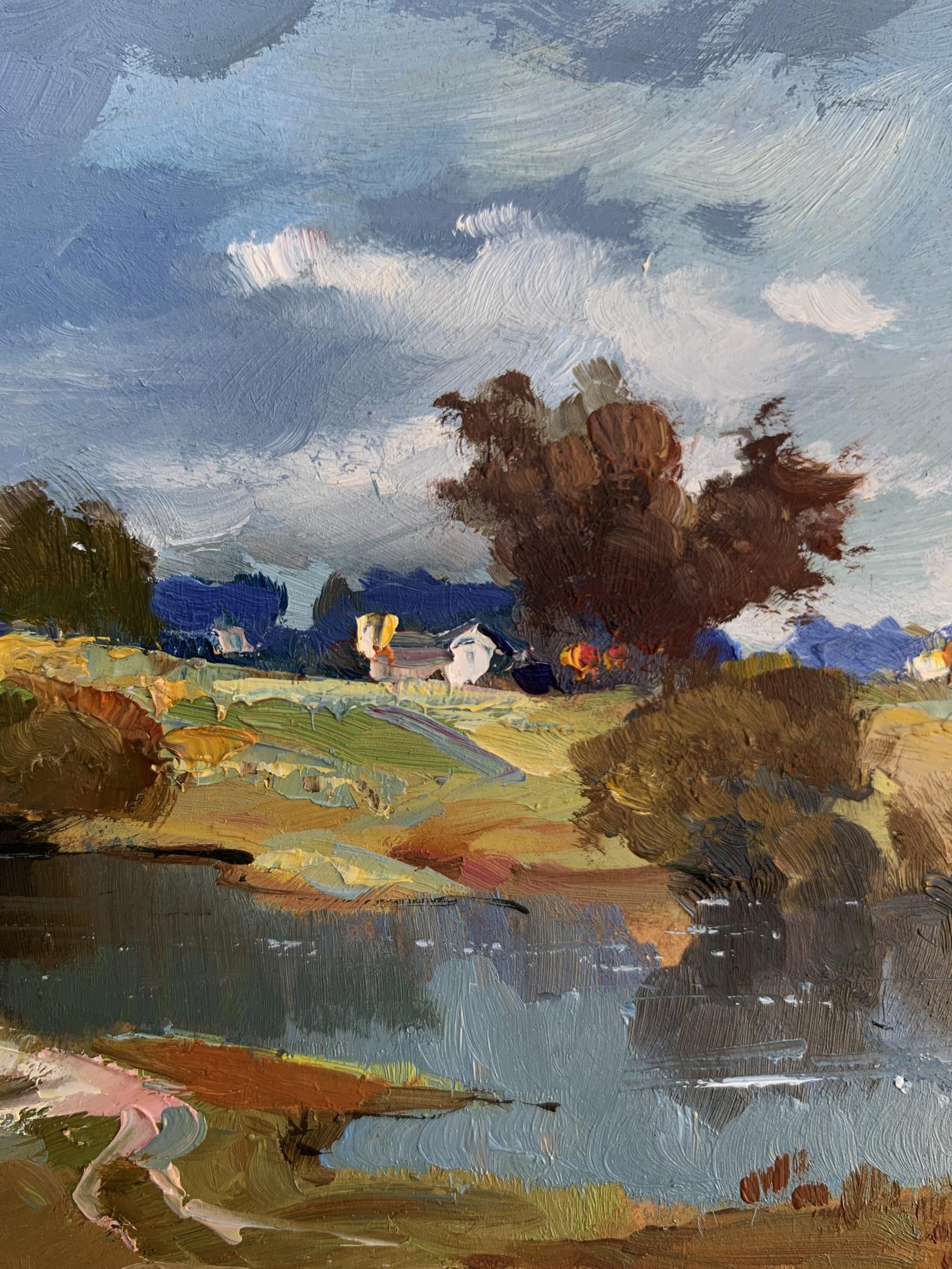 The painting "River Silence" presents a tranquil and picturesque rural landscape, highlighting the serene beauty of a quiet river surrounded by nature. Executed in oil on cardboard, the artwork captures the delicate interplay of light, water, and land, immersing the viewer in a peaceful moment where time seems to stand still. The composition emphasizes the harmony between the natural elements and human presence, subtly woven into the background.In the foreground, the calm river reflects the surrounding trees and sky with remarkable clarity, its surface interrupted only by gentle ripples. The water, painted in deep blues and soft greens, conveys a sense of depth and stillness. Along the riverbank, patches of earthy tones—browns, ochres, and muted greens—suggest a natural, unspoiled environment. A sandy curve at the edge of the water adds texture and a sense of accessibility, as if inviting the viewer to step closer.The middle ground transitions to open fields dotted with trees and shrubs, painted with loose, impressionistic strokes. The warm yellows and greens of the grass contrast with the cooler tones of the water, creating a balanced and harmonious palette. Among the fields, a small cluster of houses with white walls and colorful roofs provides a subtle but significant human presence, blending seamlessly with the natural surroundings. The houses, though distant, add warmth and a sense of life to the composition.The background features a line of trees in varying shades of green and brown, their forms softened by distance and atmospheric perspective. The sky above dominates the scene, painted in a vibrant mix of blues and whites. The dynamic brushstrokes of the clouds suggest a breezy day, adding movement and energy to the otherwise still landscape.Through "River Silence," the artist conveys a deep appreciation for the beauty of unhurried, rural life. The painting captures the soothing stillness of nature, offering the viewer a moment of reflection and tranquility. The calm river serves as a central element, symbolizing the timeless flow of life and the connection between humans and their environment.This work celebrates the harmony and simplicity of rural landscapes, emphasizing the restorative power of nature. The artist’s use of vibrant colors and expressive brushstrokes evokes feelings of peace and nostalgia, inviting the viewer to pause and appreciate the quiet beauty of the natural world. It is a tribute to the enduring allure of serene moments by the river, where life feels balanced and whole.