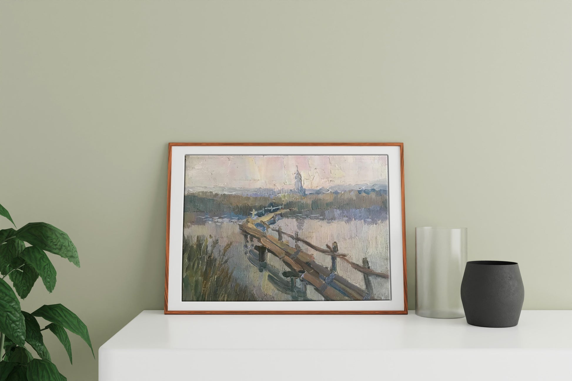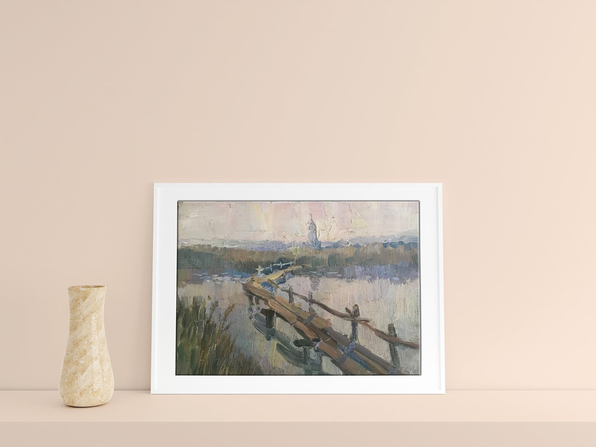 Looking for a charming addition to your home décor? Check out this beautiful oil painting, titled "Road to the village." It features a serene rural scene, with a small river winding its way through thickets of reeds, and a narrow wooden bridge leading to a village church in the distance. The soft colors and tranquil atmosphere are sure to create a sense of peace and calm in any space. Hang it in your living room or bedroom for a touch of rustic elegance, or give it as a thoughtful gift to someone special.