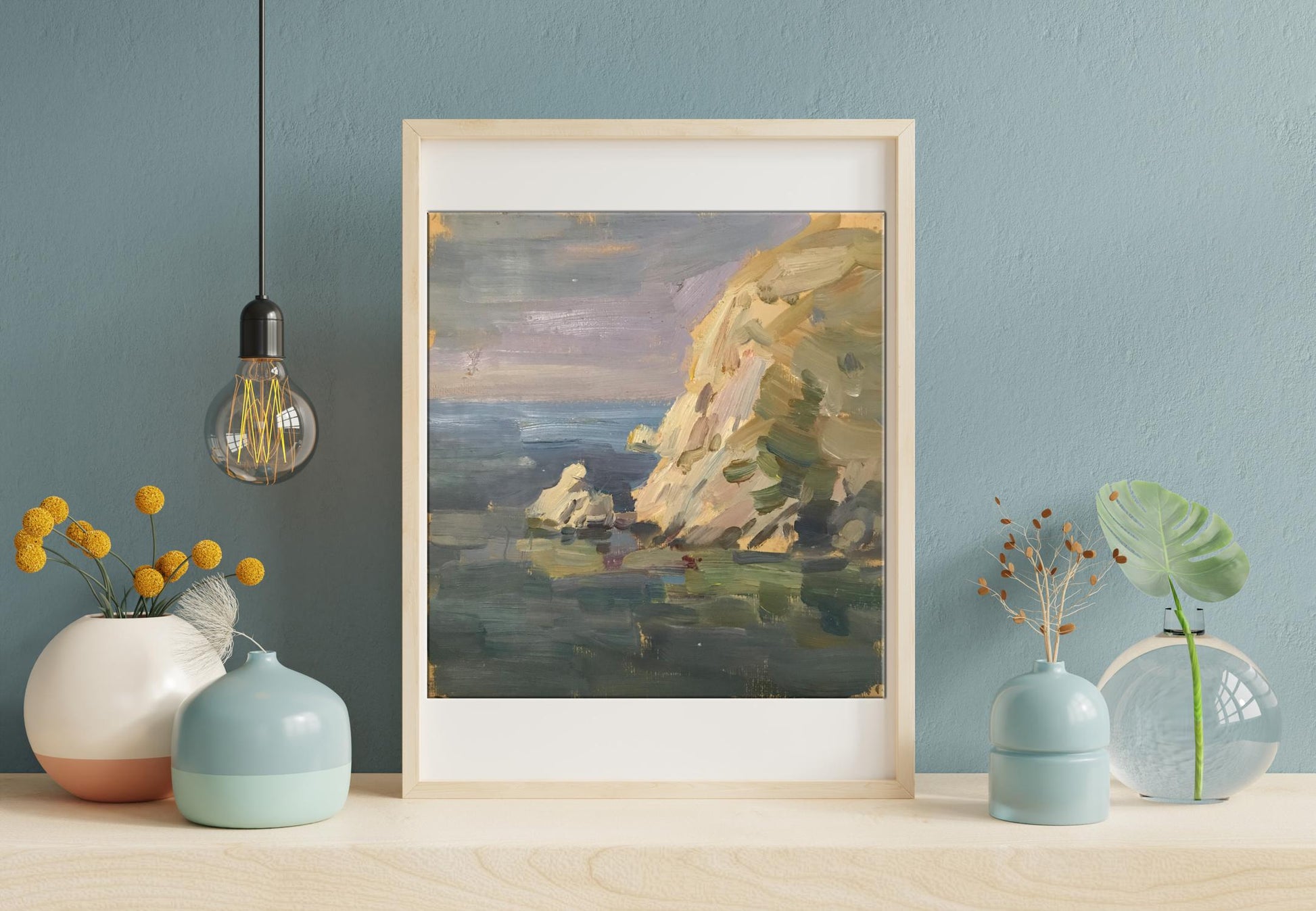 This stunning oil painting called "Rocky Coast" will take your breath away. The beautiful scene depicts the power and majesty of the sea, with high cliffs towering over the water. The colours are simply stunning, from the deep blue of the water to the bright green of the foliage on the rocks. This painting is sure to make a dramatic statement in any room. It would be perfect for a living room, dining room or even a office. If you love the ocean, this painting is a must-have for your home!