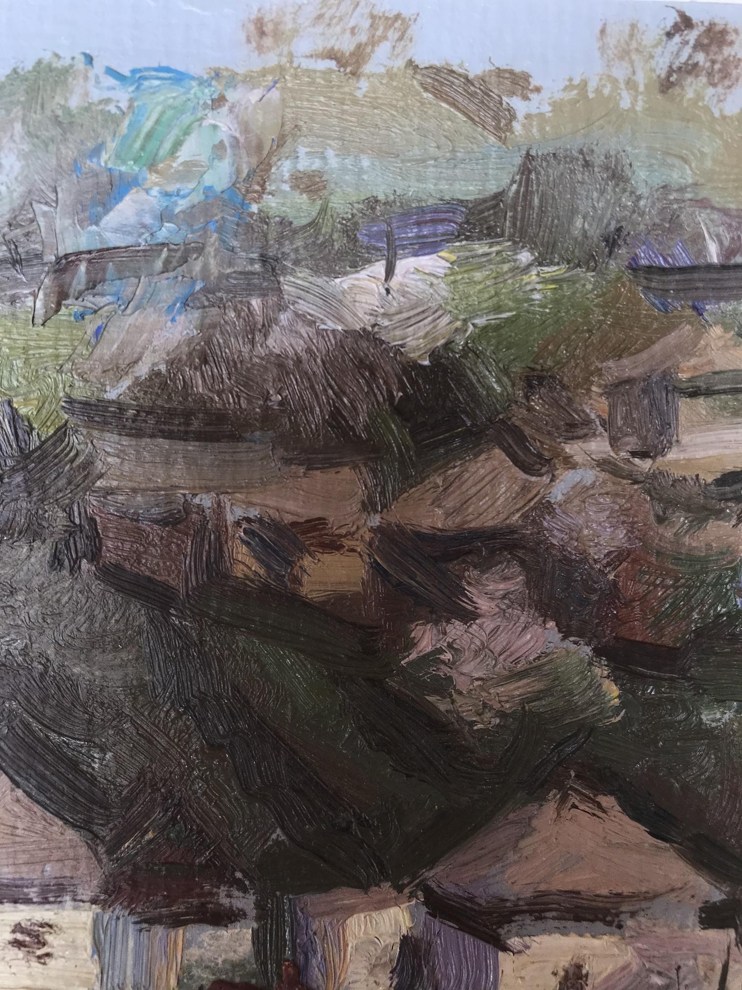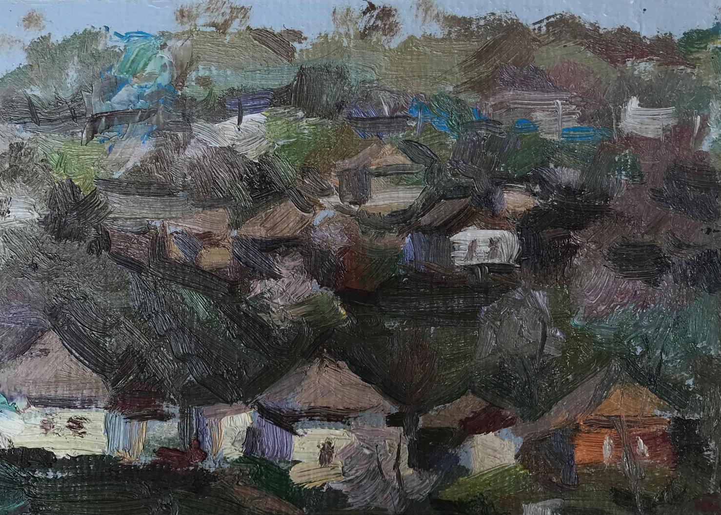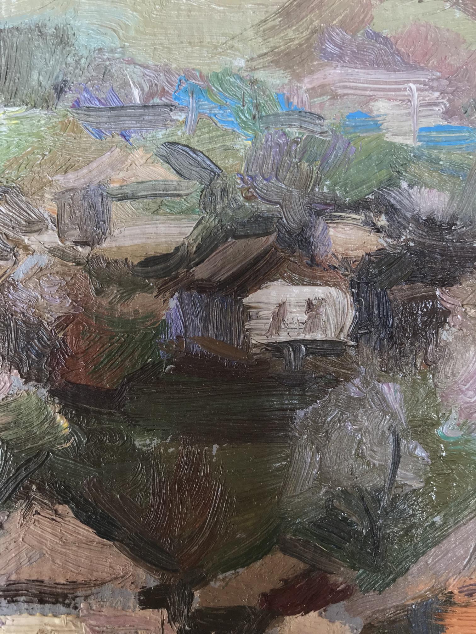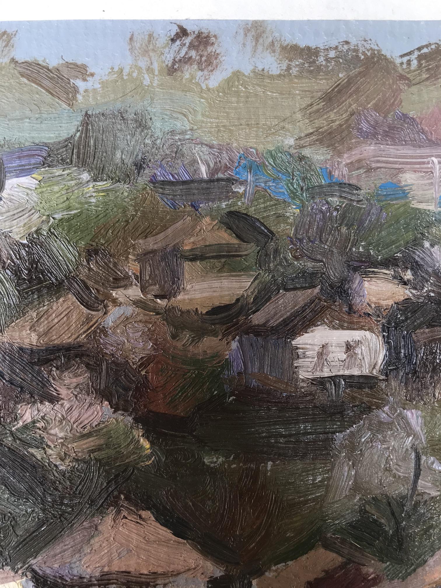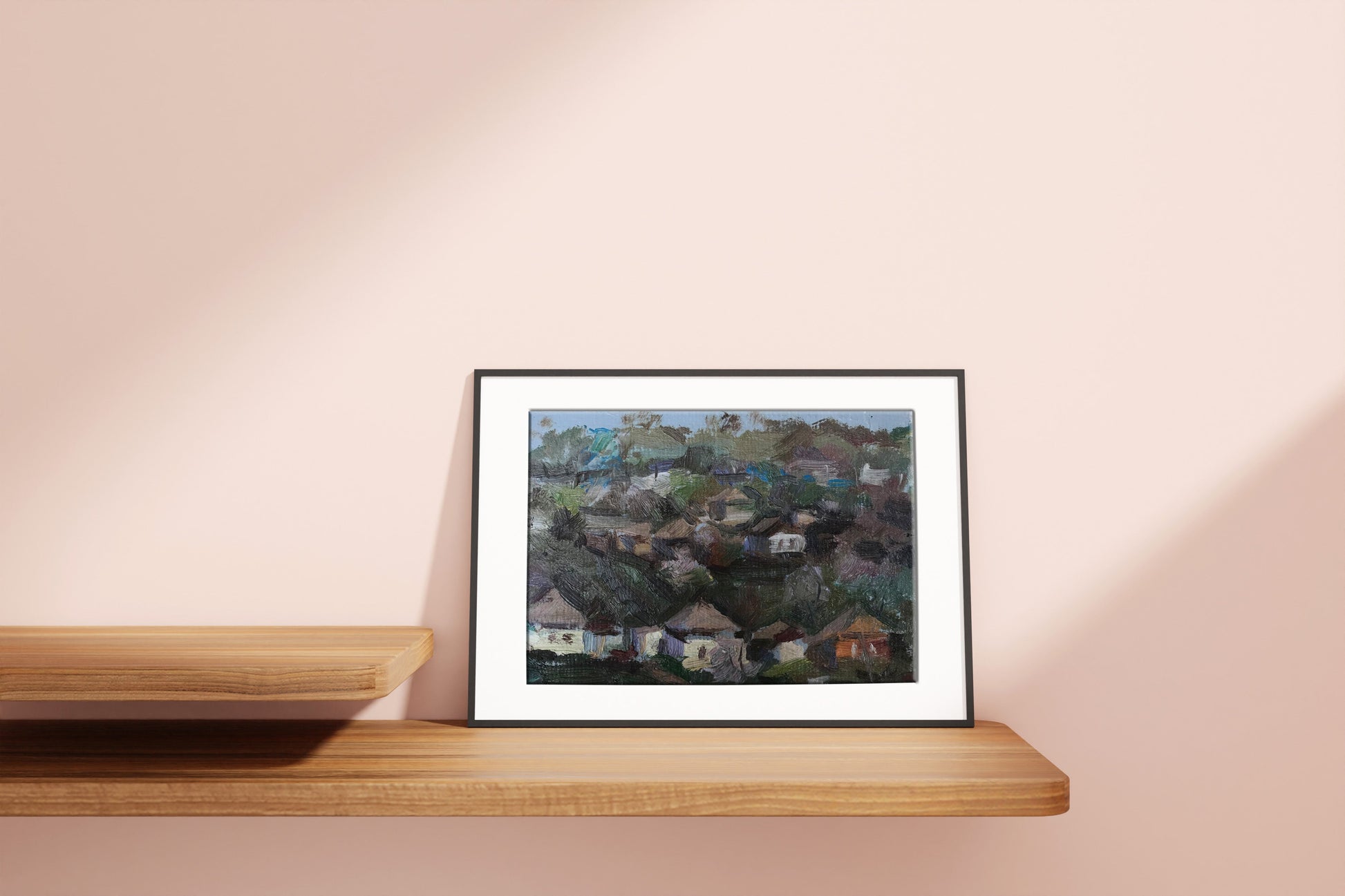 This beautiful oil painting captures a stunning view of a rural landscape. From the hill, you can see the village below with its small houses and many green trees. The colors are simply gorgeous, and the details are amazing. It's a perfect painting for any nature lover or anyone who wants to add a touch of beauty to their home.