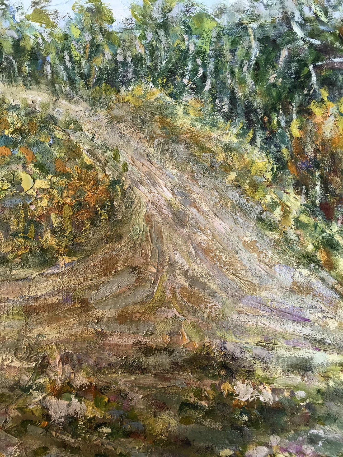 In "Rural Road," the painting vividly portrays a scenic path that draws the viewer into a verdant forest canopy. The path serves as both a literal and metaphorical invitation to explore deeper into the tranquility of the natural environment. The subtle interplay of sunlight and shadow, along with the detailed depiction of the foliage and sky, enhances the sense of immersion in this peaceful landscape.