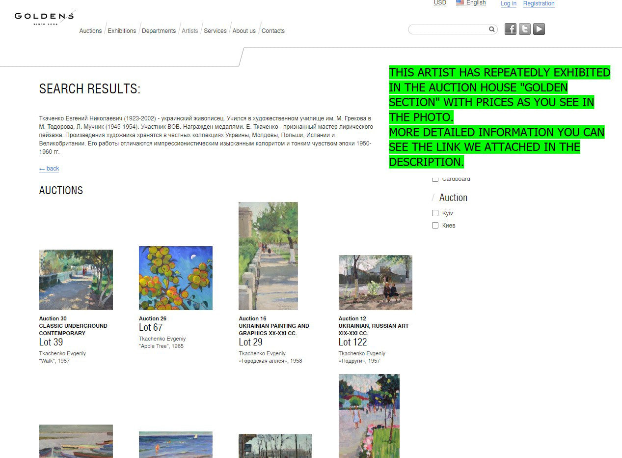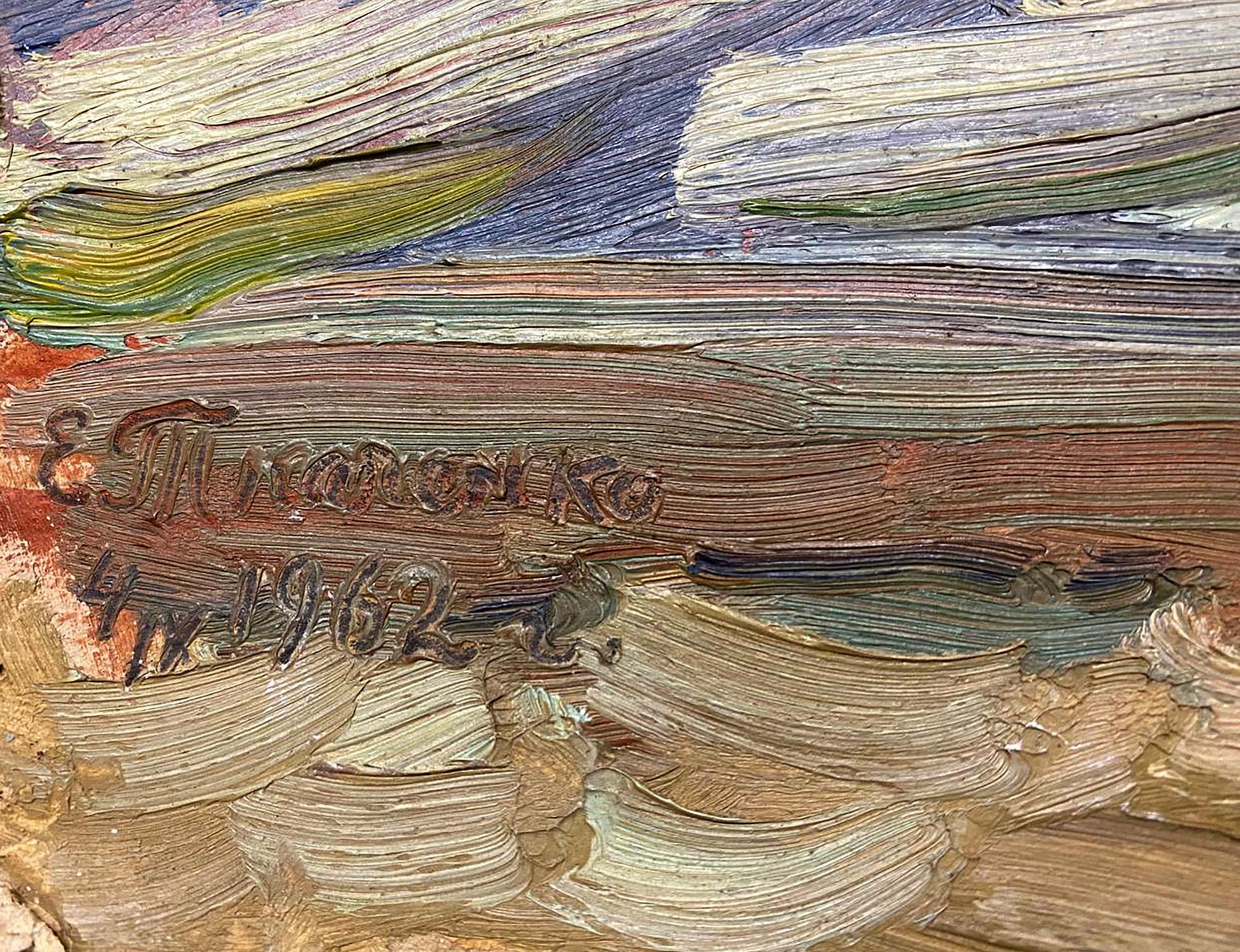 About the artists: Tkachenko Evgeny Nikolaevich (1923-2002) - Ukrainian painter. He studied at the art school. M. Grekova in M. Todorova, L. Muchnik (1945-1954). WWII participant. Awarded with medals. E. Tkachenko is a recognized master of the lyrical landscape. The artist's works are kept in private collections in Ukraine, Moldova, Poland, Spain and Great Britain. His works are notable for their impressionistic exquisite coloring and subtle feeling of the era of 1950-1960.