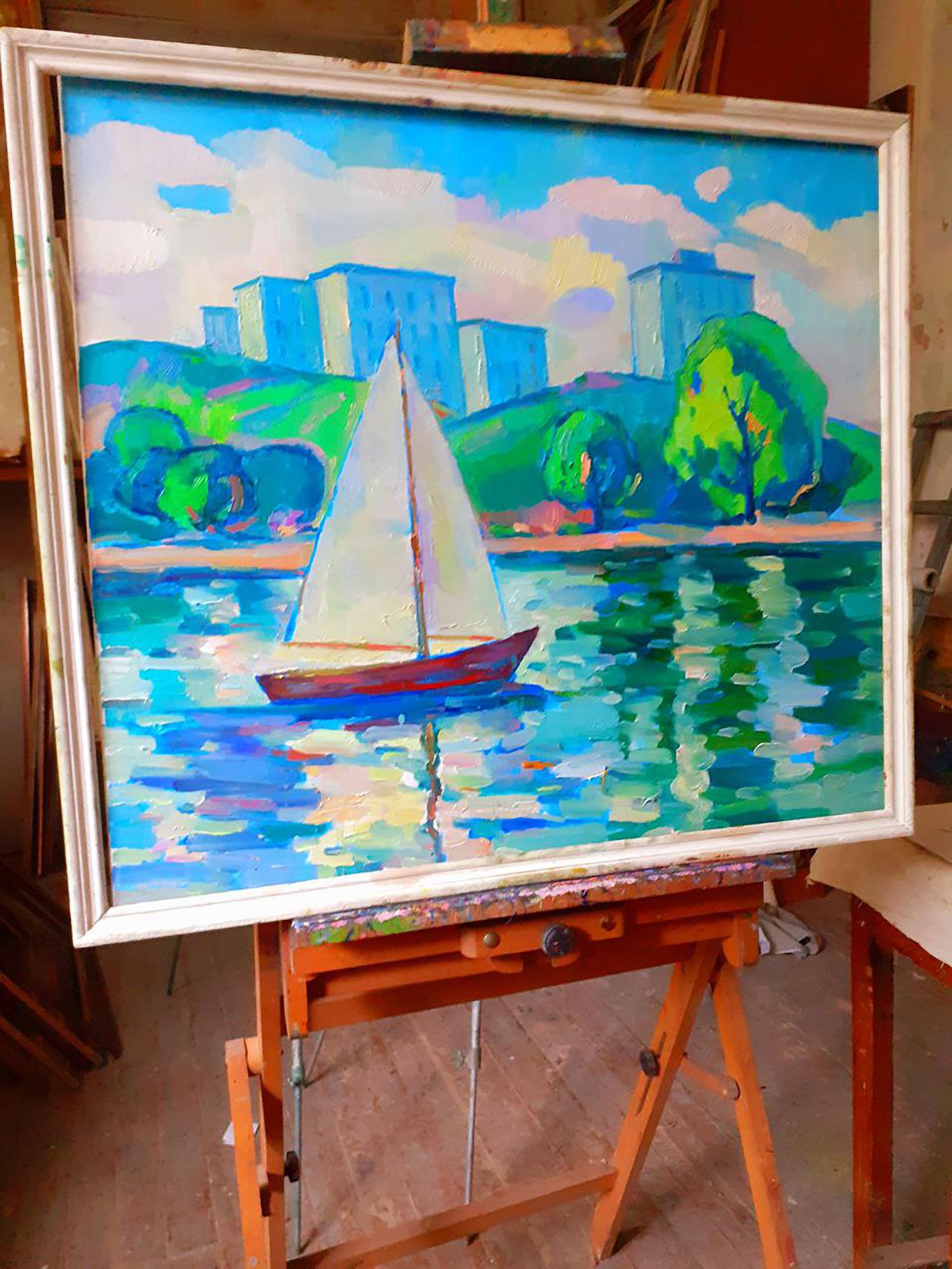 "Sails at Sea" is a vibrant and serene oil painting that captures the tranquil beauty of a sailboat gliding across the water, set against a backdrop of lush green hills and modern buildings. The composition is filled with expressive brushstrokes and a harmonious color palette, creating a peaceful and inviting scene. In the foreground, a sailboat with a tall, white sail is prominently featured, cutting through the calm waters. The boat's hull is painted in rich shades of red, contrasting beautifully with the soft white of the sail. The reflections of the boat and sail in the water are depicted with fluid, dynamic strokes, creating a shimmering effect that enhances the sense of light and movement. The midground showcases the shoreline, lined with vibrant green trees. The trees are painted with thick, textured brushstrokes in various shades of green, adding depth and dimension to the landscape. The interplay of light and shadow on the foliage gives the scene a lively and natural feel. In the background, a row of modern buildings sits atop a gently rolling green hill. The buildings are depicted in cool tones of blue and gray, with minimal detailing, allowing them to blend harmoniously into the landscape. The contrast between the natural elements and the man-made structures adds an interesting dynamic to the composition. Above, the sky is a blend of soft blues, pinks, and purples, painted with light, airy brushstrokes that suggest fluffy clouds on a sunny day. The sky's reflection in the water is rendered with similar colors, creating a cohesive and balanced composition. "Sails at Sea" celebrates the peaceful coexistence of nature and human presence. The painting’s dynamic composition and soothing colors evoke a sense of calm and relaxation, inviting viewers to imagine themselves enjoying a serene day by the water. The artist’s use of expressive brushstrokes and contrasting colors captures the interplay of light and shadow, creating a scene that is both lively and tranquil. The sailboat, as the focal point of the painting, symbolizes freedom and adventure, while the surrounding landscape and buildings emphasize the harmony between nature and urban life. The painting invites viewers to appreciate the beauty of everyday moments and the tranquility of being near the water. This oil painting masterfully combines vibrant colors, dynamic brushstrokes, and a harmonious composition to create a captivating and serene scene. "Sails at Sea" captures the viewer’s attention with its bold visual impact and invites them to immerse themselves in the tranquility and beauty of a peaceful day by the water. It is a delightful and uplifting piece that resonates with the joy and calm of life near the sea.