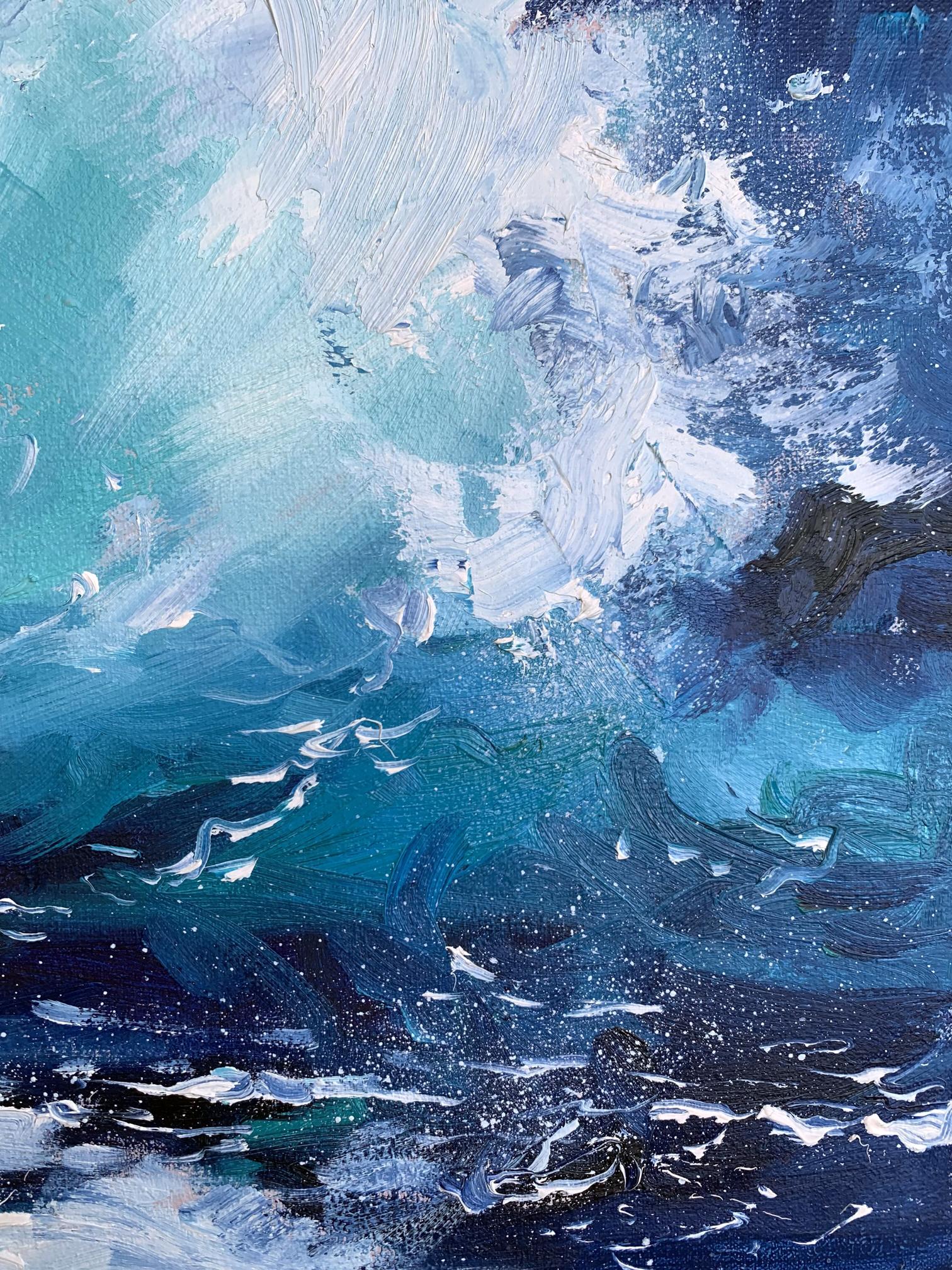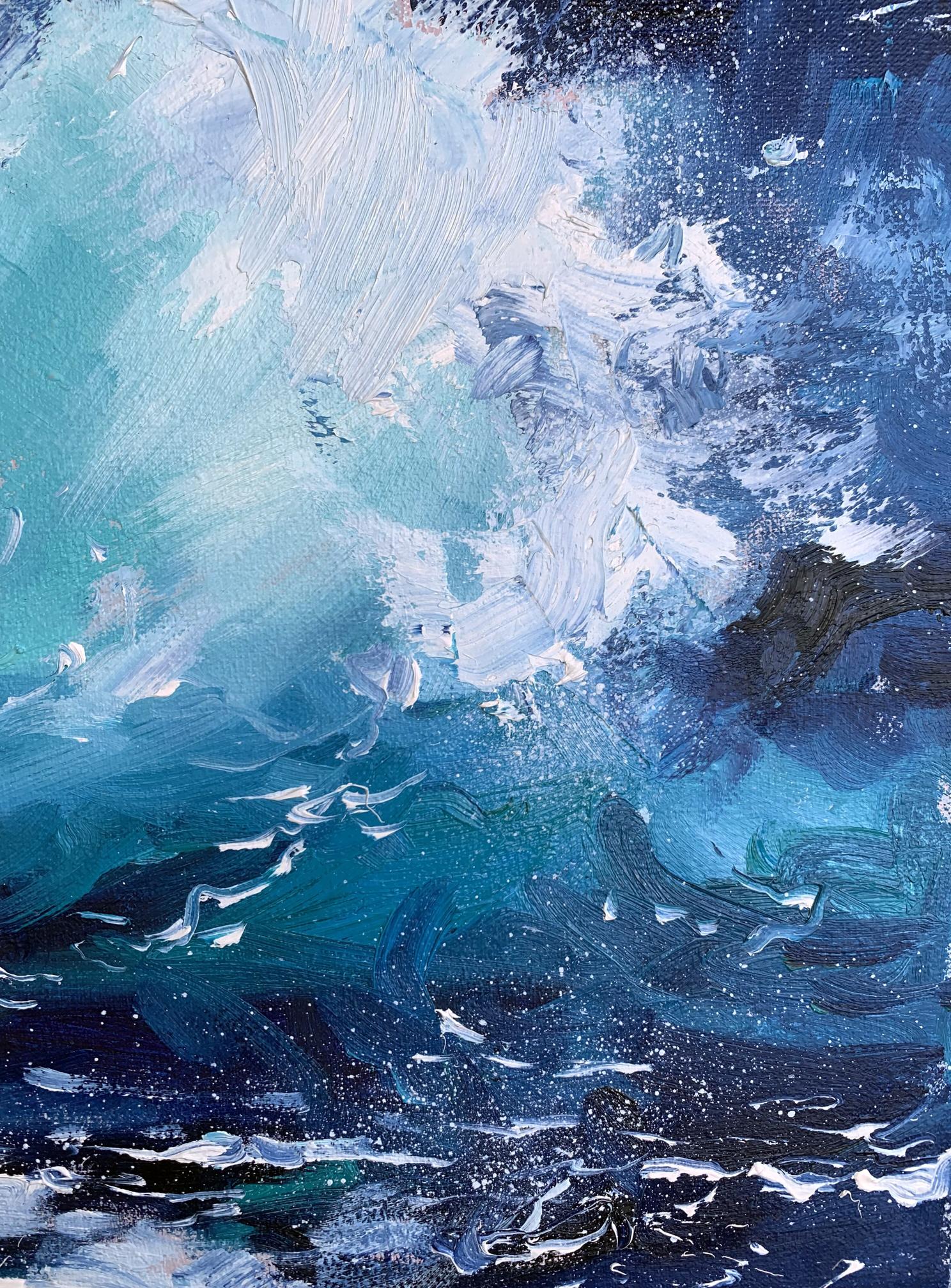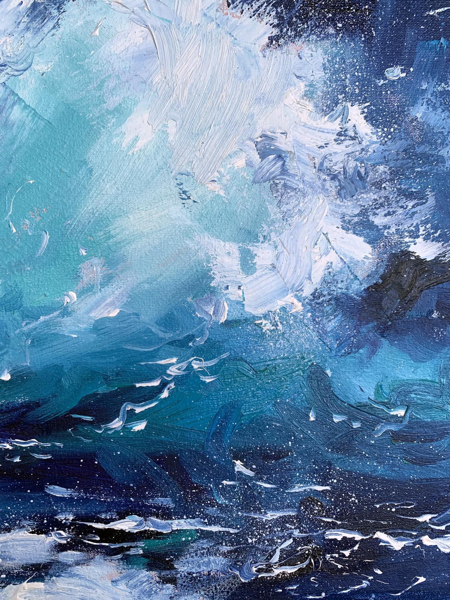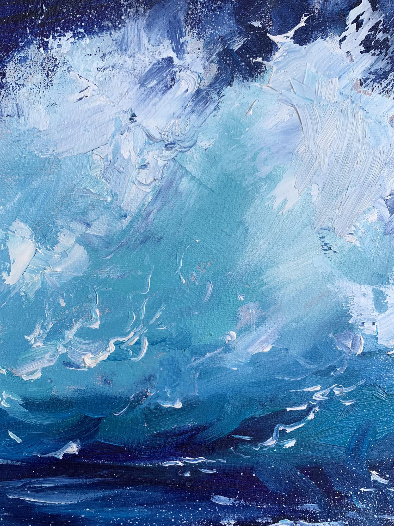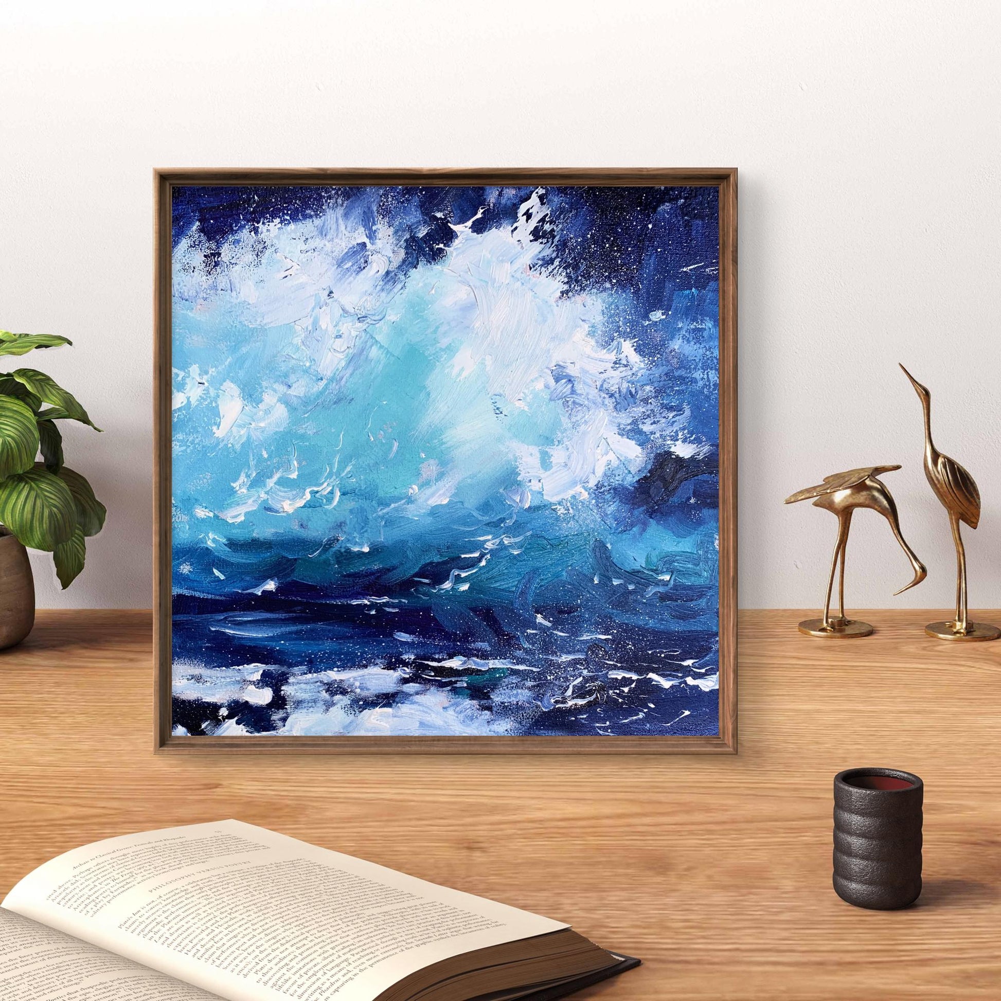 "Sea Wavy Breeze" is an evocative oil painting that masterfully captures the dynamic energy and serene beauty of the ocean. The artist employs a rich palette of blues and whites, creating a vivid representation of the sea under the influence of a gentle breeze. The brushstrokes convey the movement of the waves and the interaction of light and water, immersing the viewer in the coastal atmosphere. The painting predominantly features various shades of blue, ranging from deep navy to light turquoise. The use of white highlights and foamy textures adds depth and realism to the waves. The artist employs a combination of broad, sweeping strokes and finer, detailed brushwork to depict the different layers and textures of the ocean. The composition is dominated by the powerful, rolling waves that occupy most of the canvas. The waves are painted with a sense of motion, capturing the moment they crest and break. The background gradually transitions from dark blues at the top, representing the deep sea and sky, to lighter blues and whites at the bottom, where the waves meet the shore. The central element of the painting is the ocean waves, depicted with swirling, energetic brushstrokes. The artist has skillfully captured the movement and power of the water, giving a sense of the continuous ebb and flow of the sea. The white foam and spray of the waves are highlighted with lighter tones, creating a stark contrast against the darker blue water. These details add realism and texture, emphasizing the dynamic nature of the ocean. The interplay of light and shadow is beautifully rendered, with the lighter areas suggesting the reflection of sunlight on the water's surface. The darker areas hint at the depths and the mystery of the sea. The background is painted with softer, more diffuse strokes, creating a gradient that enhances the sense of depth and distance. The transition from dark to light blues evokes the vastness of the ocean and the sky. The mood of "Sea Wavy Breeze" is both invigorating and calming. The painting captures the natural rhythm and energy of the sea, while the gentle colors and flowing forms evoke a sense of peace and tranquility. It invites the viewer to experience the refreshing and soothing qualities of the ocean breeze. "Sea Wavy Breeze" can be interpreted as a celebration of the beauty and power of the natural world. The painting evokes a sense of freedom and connection to nature, highlighting the ever-changing and dynamic character of the sea. It serves as a reminder of the ocean's vastness and the serene moments that can be found within its continuous movement. The artist's use of color, texture, and composition effectively brings the seascape to life, making "Sea Wavy Breeze" a captivating and emotive piece. The painting not only portrays the physical beauty of the ocean but also conveys its mood and atmosphere, offering viewers a moment of escape and reflection.