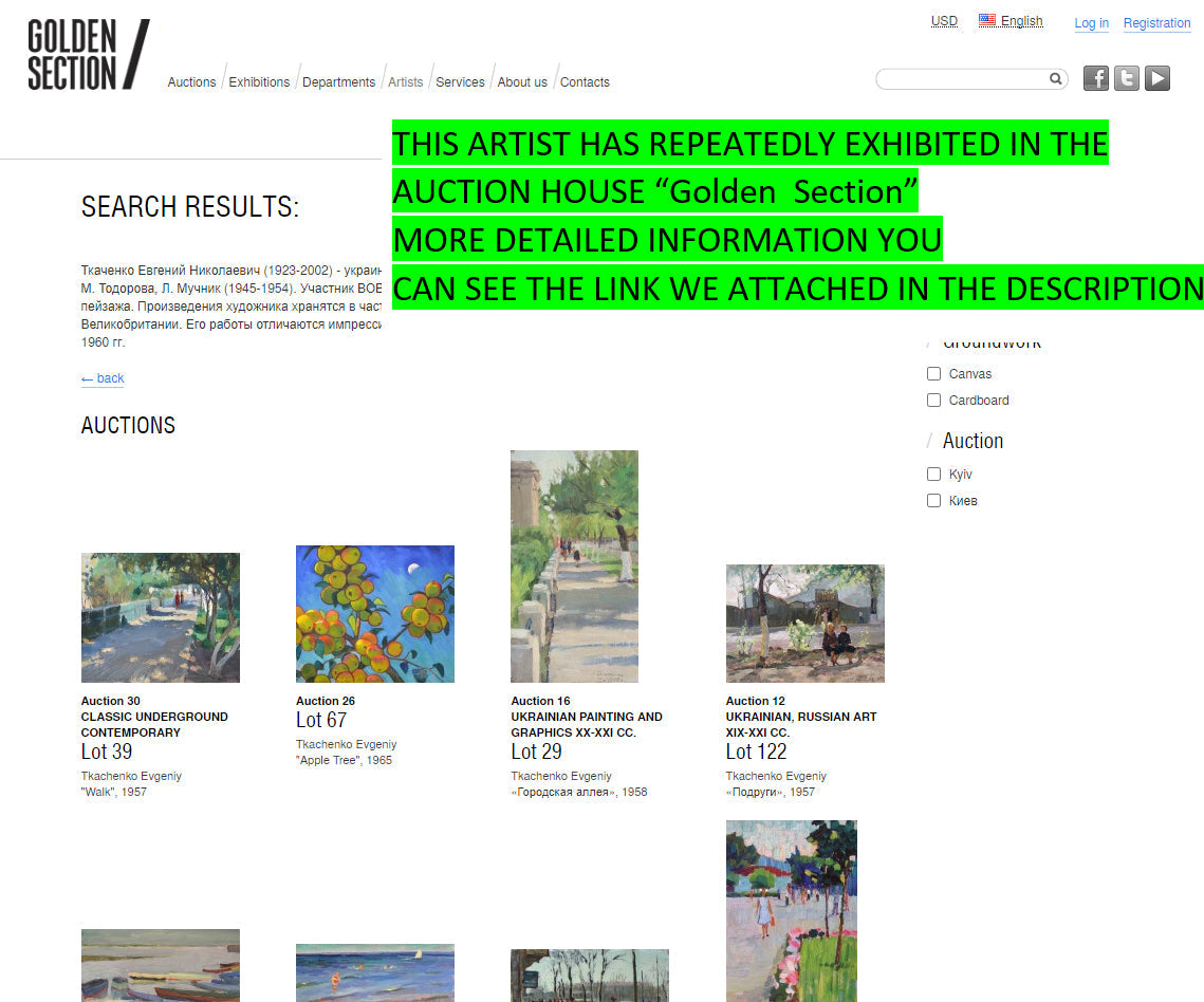 About the artists: Tkachenko Evgeniy Nikolaevich (1923-2002) - Ukrainian painter. Studied at the Art College named after M. Grekov, M. Todorova, L. Muchnik (1945-1954). Participant of the Second World War. Awarded with medals. E. Tkachenko is a recognized master of the lyrical landscape. The artist's works are kept in private collections in Ukraine, Moldova, Poland, Spain and Great Britain. His works are distinguished by an impressionistic refined color and a subtle sense of the 1950-1960 era.