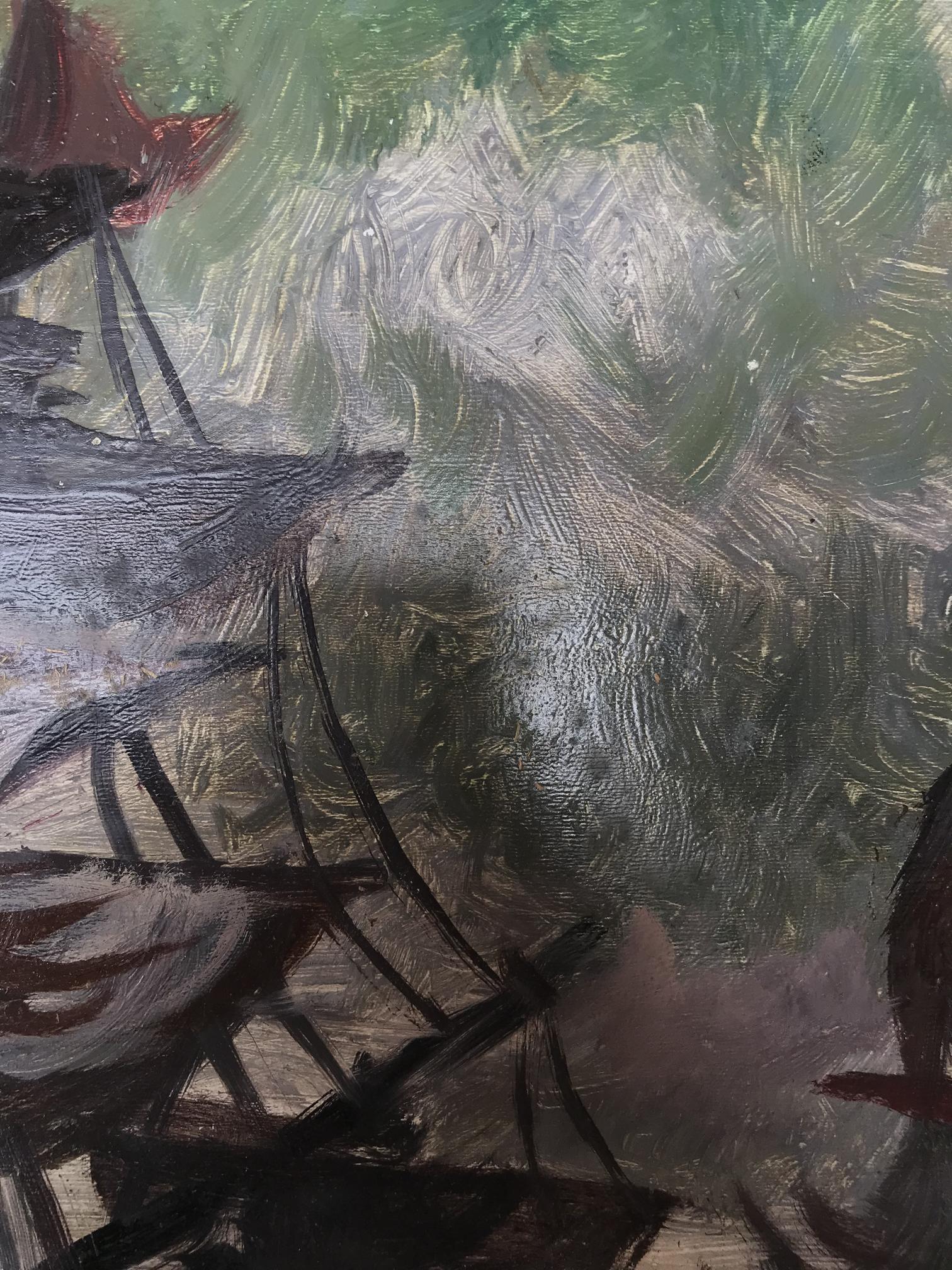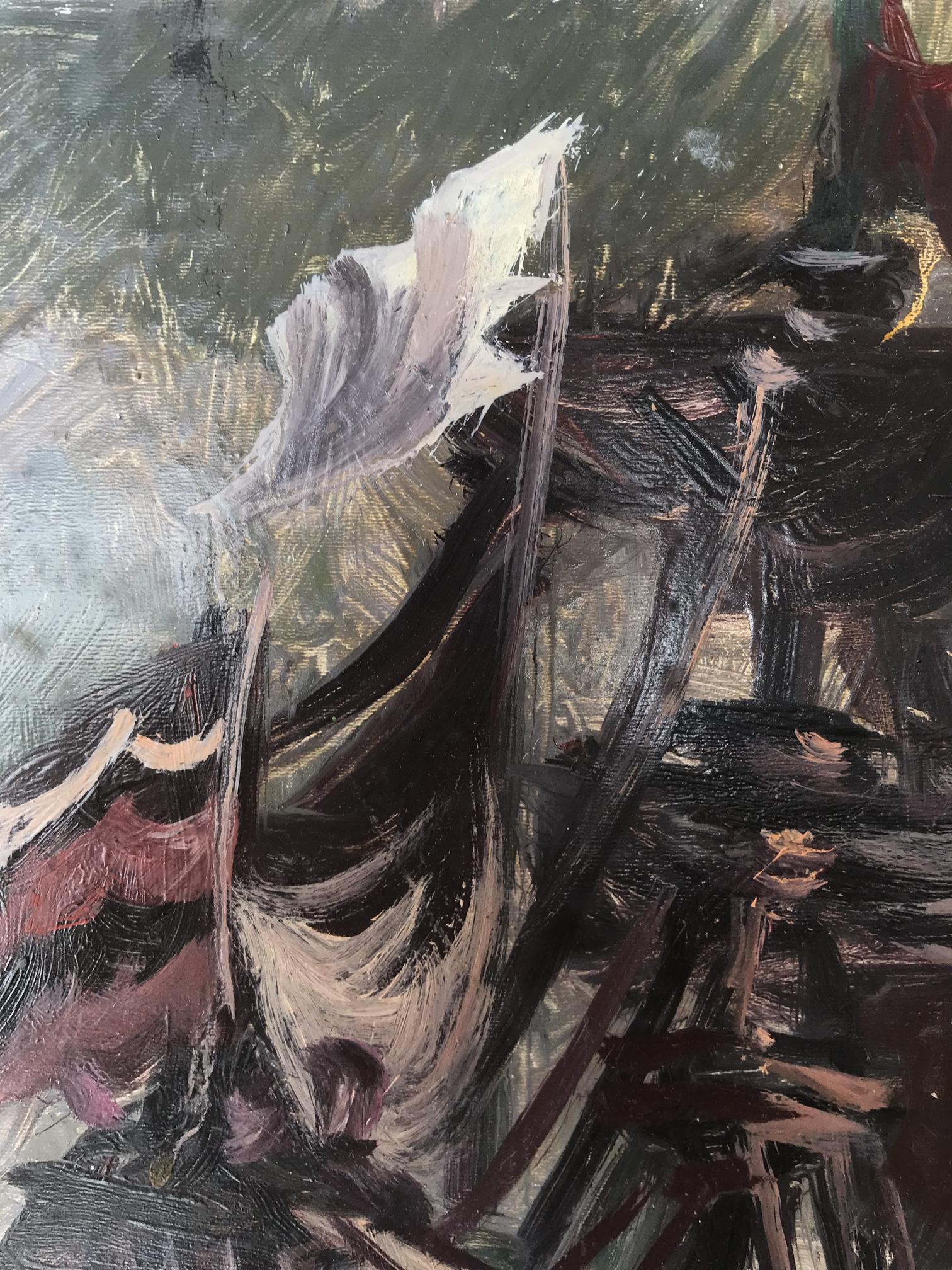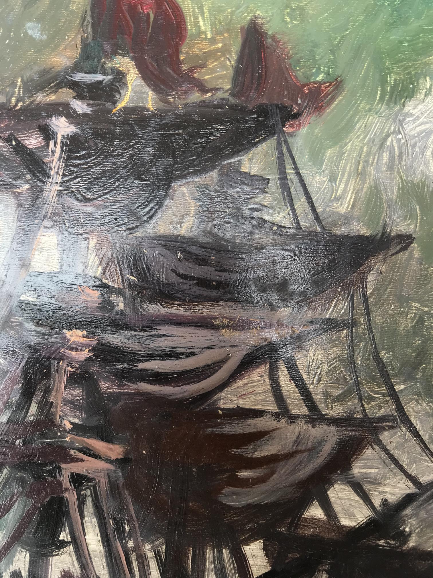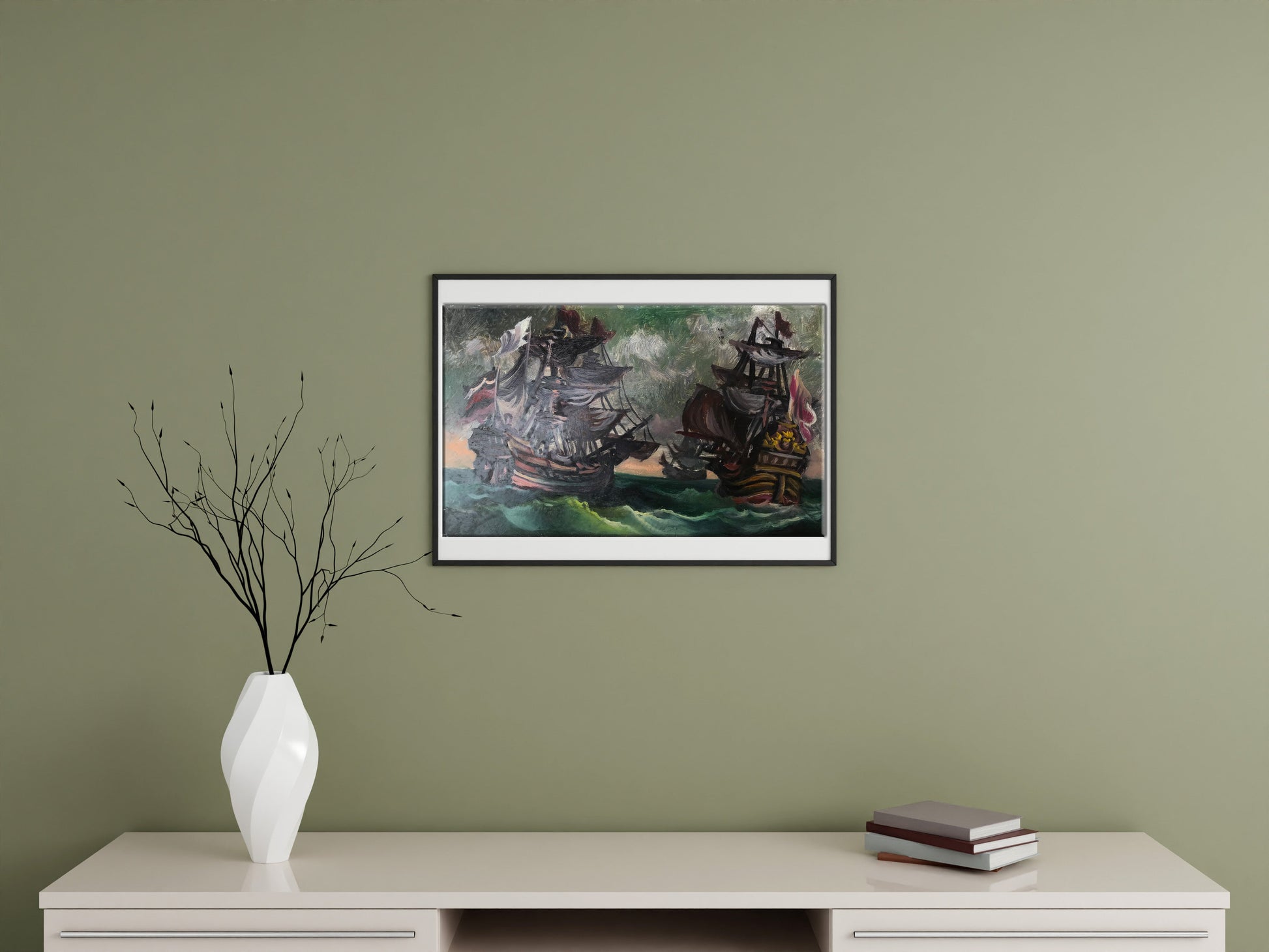 This oil painting depicts a raging sea, with stormy skies and medieval sailboats struggling against the waves. It's a dark and powerful image that evokes feelings of awe and respect. The painting is executed with skilled brushwork, and the atmospheric effects are truly stunning. The artist has managed to capture the feeling of a wild and dangerous sea, which is sure to impress anyone who sees it. This is a truly impressive work of art, and would make a great addition to any collection.