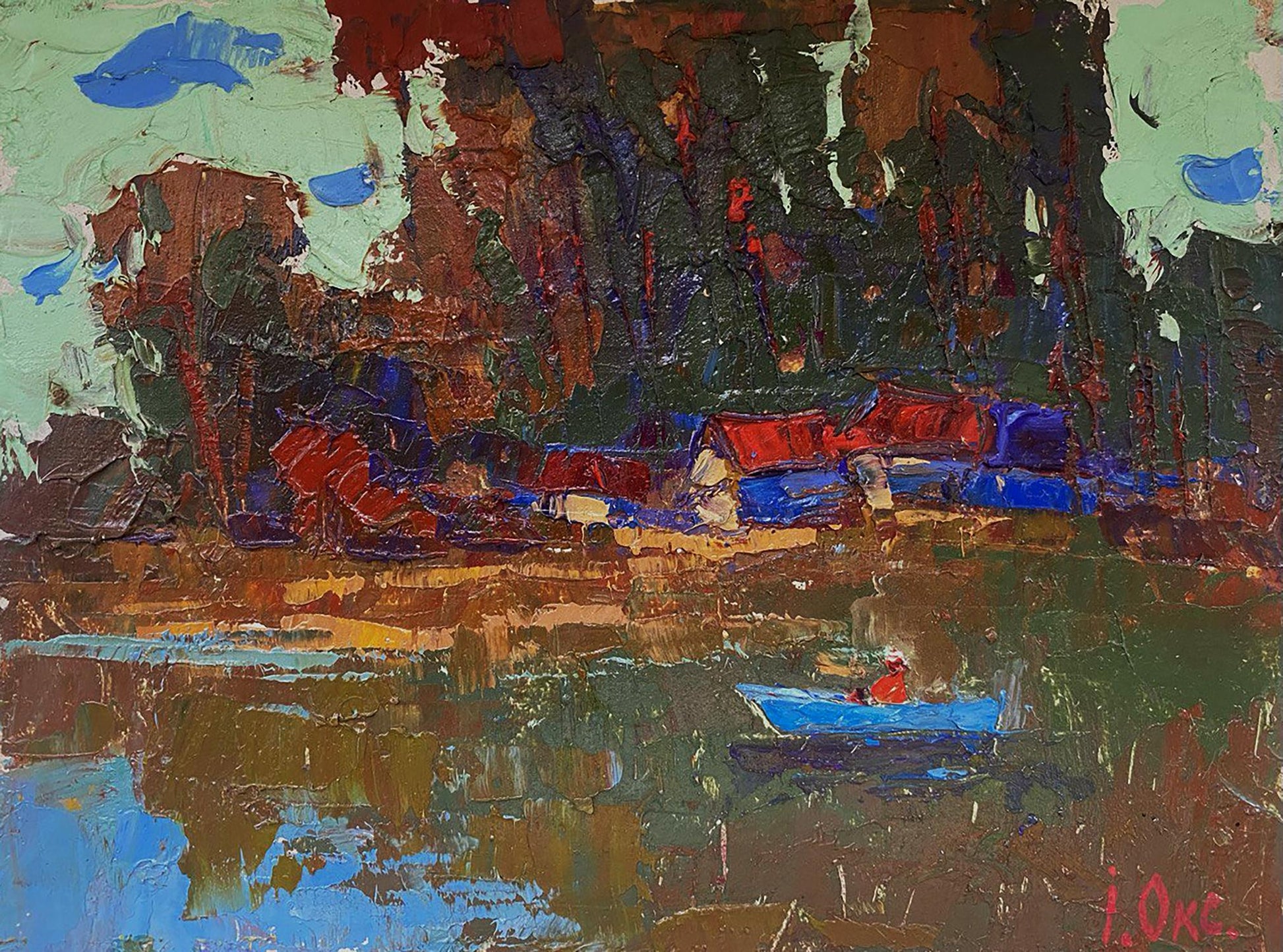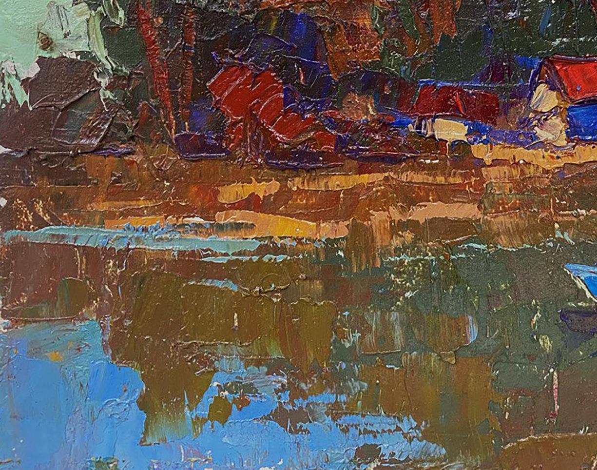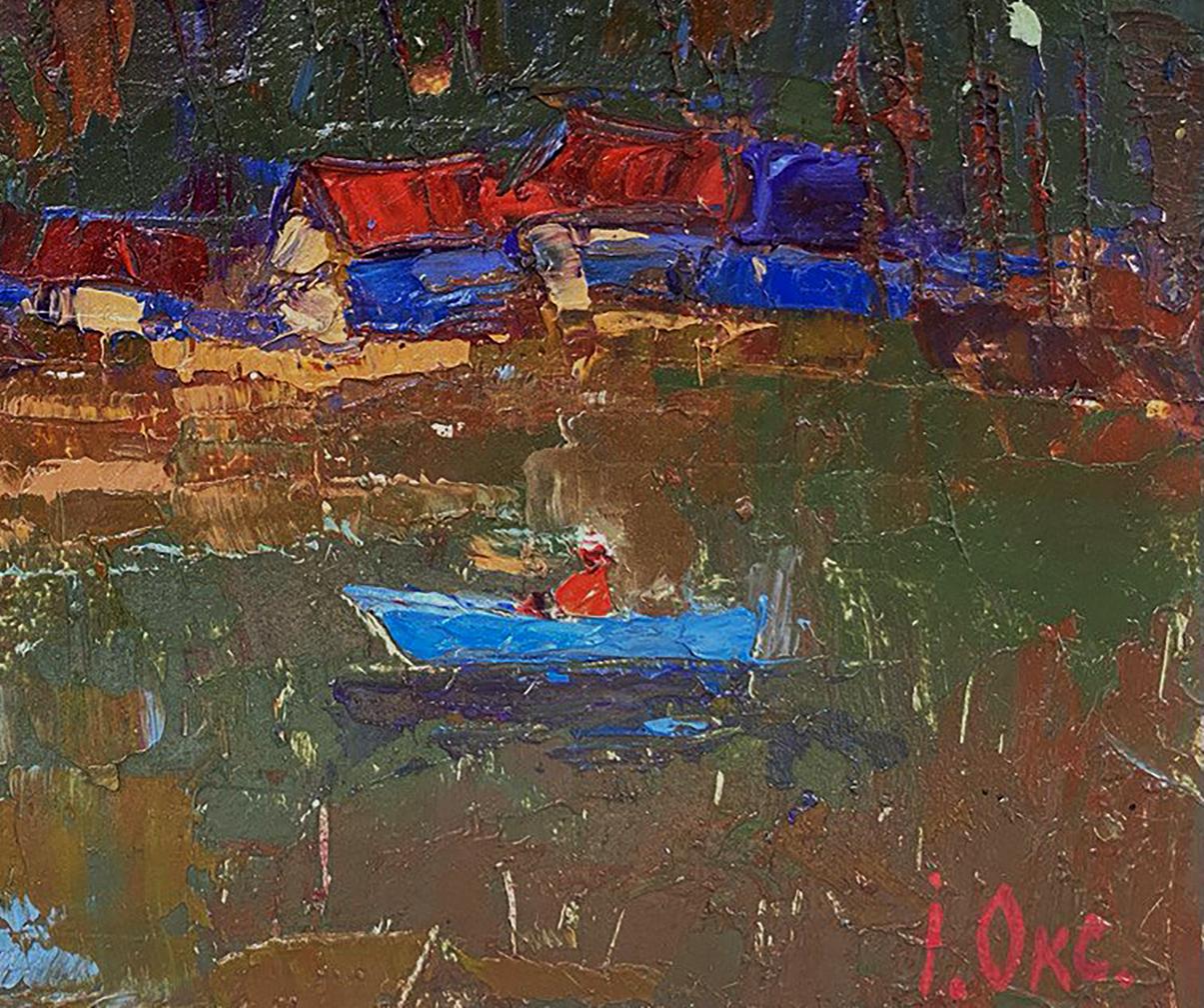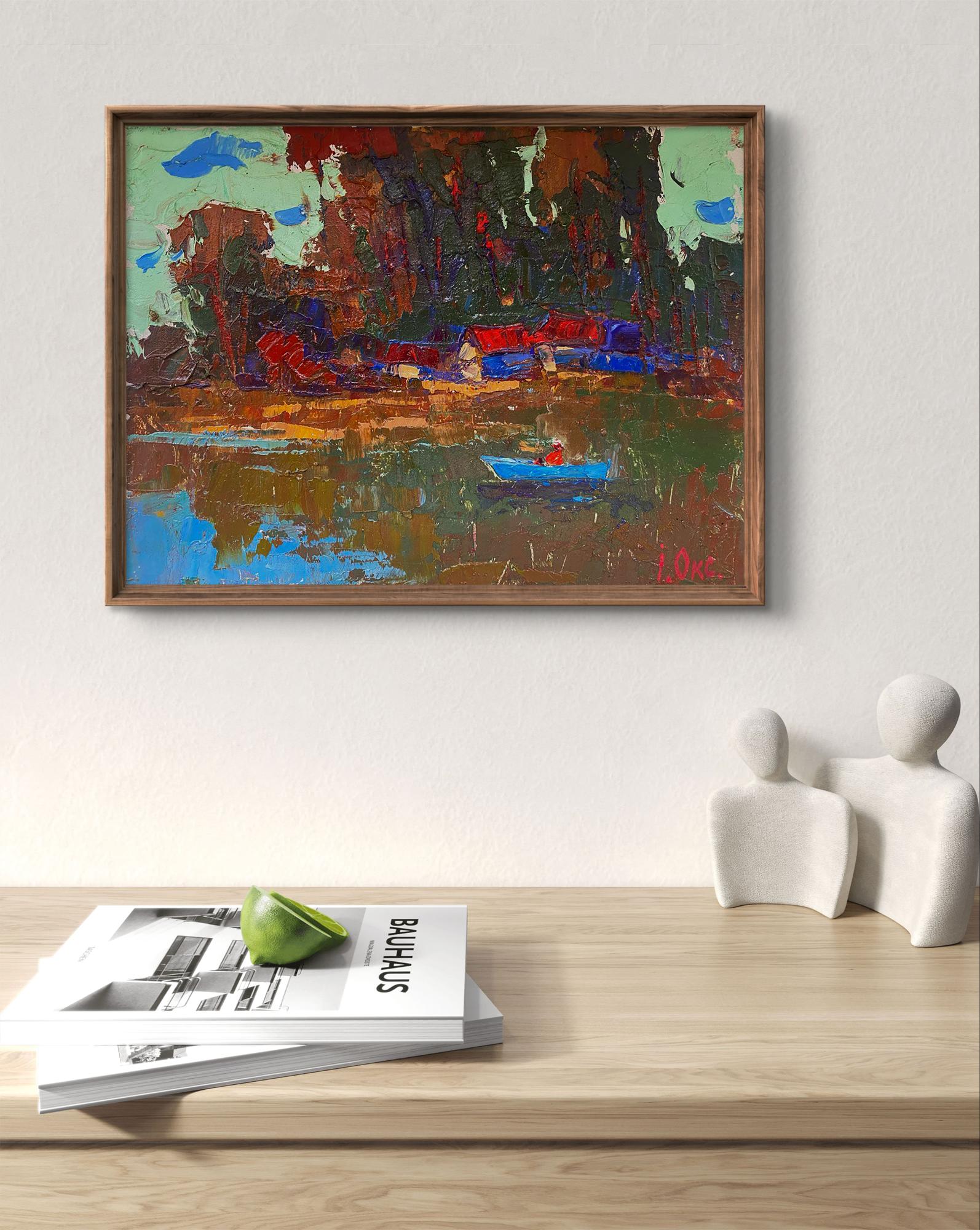 The painting titled "Silence Over the Pond" captures a tranquil rural scene where a small pond reflects the surrounding landscape of rustic houses and dense forest. The composition evokes a sense of peace and stillness, inviting the viewer to immerse themselves in the quiet beauty of nature. The artist uses thick, textured brushstrokes and a rich, earthy color palette to bring life and depth to this serene moment, highlighting the harmony between water, land, and human presence. The foreground features a calm pond, painted with a combination of deep browns, greens, and blues. The water surface is textured with thick, layered brushstrokes, creating a sense of reflection and movement. The darker tones suggest that the pond is in a shaded area, adding a sense of mystery and depth. At the center of the pond, a small boat floats peacefully. The boat is painted in bright blue, with a lone figure wearing a red jacket and white hat. This splash of color immediately draws the viewer’s eye, symbolizing human connection with nature. The figure appears to be rowing or sitting in contemplation, adding a personal, meditative element to the scene. In the middle ground, a row of village houses with bright red roofs stands out against the darker tones of the landscape. The houses are painted in bold red, blue, and beige, creating a vivid contrast with the natural surroundings. These houses symbolize shelter and community, adding warmth and life to the otherwise quiet, natural setting. Behind the houses, a wooden fence can be seen running along the edge of the pond, reinforcing the boundary between the human-built environment and the wild forest beyond. The background is dominated by a dense forest, painted with rich shades of dark green, brown, and deep red. The trees rise high into the sky, creating a sense of depth and enclosure, as if the village and pond are nestled in a secluded, peaceful corner of the world. The thick, textured brushstrokes used for the trees give them a sculptural, three-dimensional quality, making the forest feel lush and impenetrable. Above the forest, the sky is painted in soft turquoise and light blue, with hints of white clouds scattered across it. The sky's cool tones contrast with the warm, earthy colors of the land and water, creating a sense of balance and harmony within the composition. "Silence Over the Pond" is a beautifully textured and evocative painting that captures the peaceful charm of rural life. Through its use of rich colors, dynamic brushstrokes, and thoughtful composition, the artwork invites viewers to experience a moment of calm and contemplation, appreciating the harmony between humans and nature. The painting celebrates stillness, solitude, and the timeless beauty of the natural world, encouraging the viewer to reflect on their own connection to the environment and the importance of quiet moments in life.