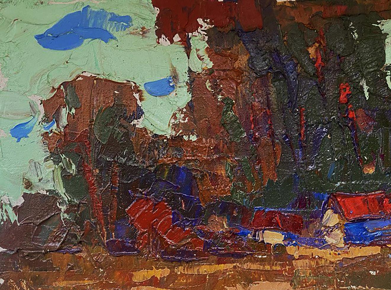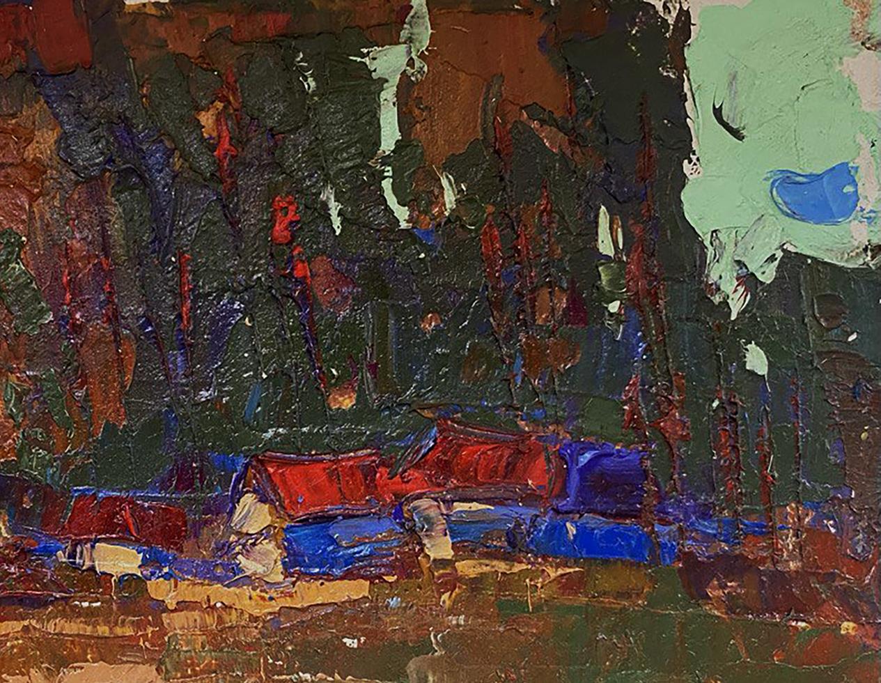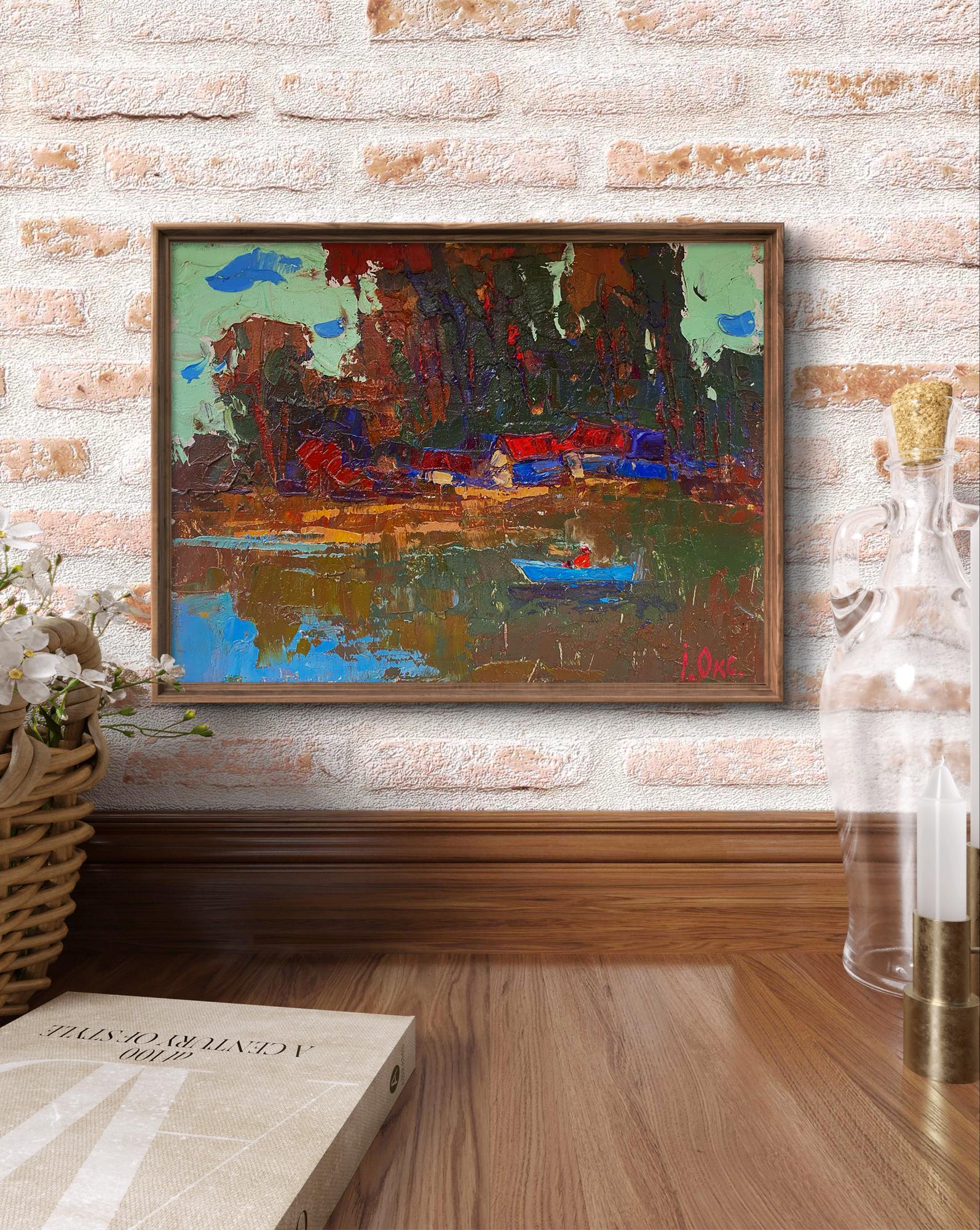 The painting titled "Silence Over the Pond" captures a tranquil rural scene where a small pond reflects the surrounding landscape of rustic houses and dense forest. The composition evokes a sense of peace and stillness, inviting the viewer to immerse themselves in the quiet beauty of nature. The artist uses thick, textured brushstrokes and a rich, earthy color palette to bring life and depth to this serene moment, highlighting the harmony between water, land, and human presence. The foreground features a calm pond, painted with a combination of deep browns, greens, and blues. The water surface is textured with thick, layered brushstrokes, creating a sense of reflection and movement. The darker tones suggest that the pond is in a shaded area, adding a sense of mystery and depth. At the center of the pond, a small boat floats peacefully. The boat is painted in bright blue, with a lone figure wearing a red jacket and white hat. This splash of color immediately draws the viewer’s eye, symbolizing human connection with nature. The figure appears to be rowing or sitting in contemplation, adding a personal, meditative element to the scene. In the middle ground, a row of village houses with bright red roofs stands out against the darker tones of the landscape. The houses are painted in bold red, blue, and beige, creating a vivid contrast with the natural surroundings. These houses symbolize shelter and community, adding warmth and life to the otherwise quiet, natural setting. Behind the houses, a wooden fence can be seen running along the edge of the pond, reinforcing the boundary between the human-built environment and the wild forest beyond. The background is dominated by a dense forest, painted with rich shades of dark green, brown, and deep red. The trees rise high into the sky, creating a sense of depth and enclosure, as if the village and pond are nestled in a secluded, peaceful corner of the world. The thick, textured brushstrokes used for the trees give them a sculptural, three-dimensional quality, making the forest feel lush and impenetrable. Above the forest, the sky is painted in soft turquoise and light blue, with hints of white clouds scattered across it. The sky's cool tones contrast with the warm, earthy colors of the land and water, creating a sense of balance and harmony within the composition. "Silence Over the Pond" is a beautifully textured and evocative painting that captures the peaceful charm of rural life. Through its use of rich colors, dynamic brushstrokes, and thoughtful composition, the artwork invites viewers to experience a moment of calm and contemplation, appreciating the harmony between humans and nature. The painting celebrates stillness, solitude, and the timeless beauty of the natural world, encouraging the viewer to reflect on their own connection to the environment and the importance of quiet moments in life.