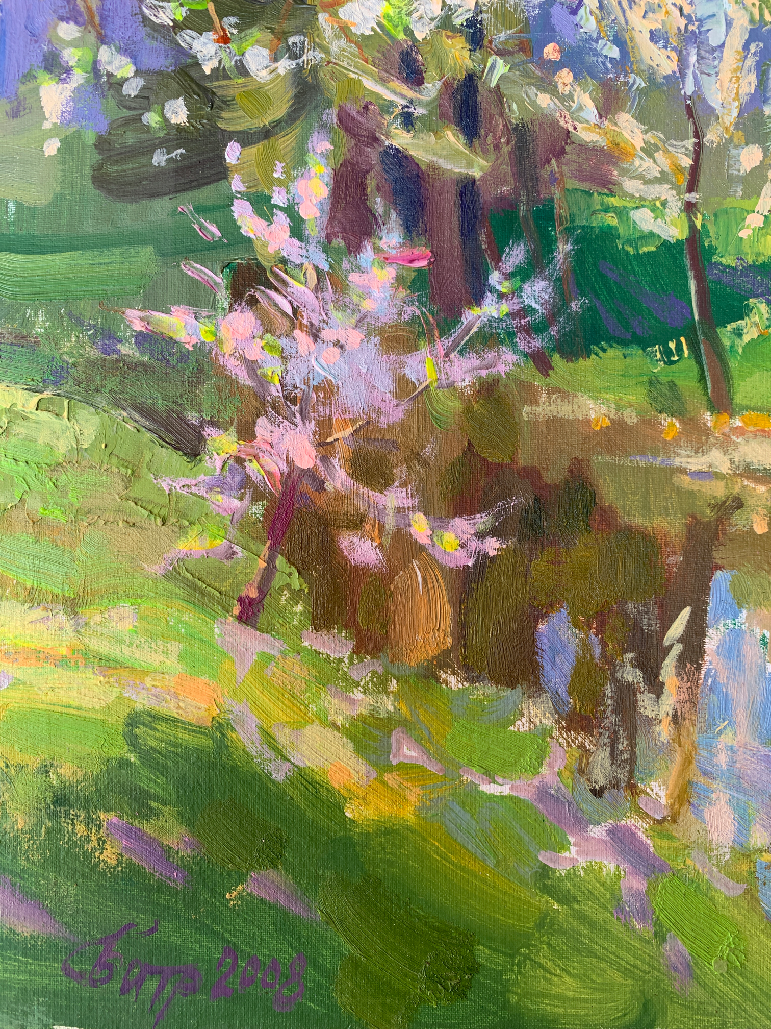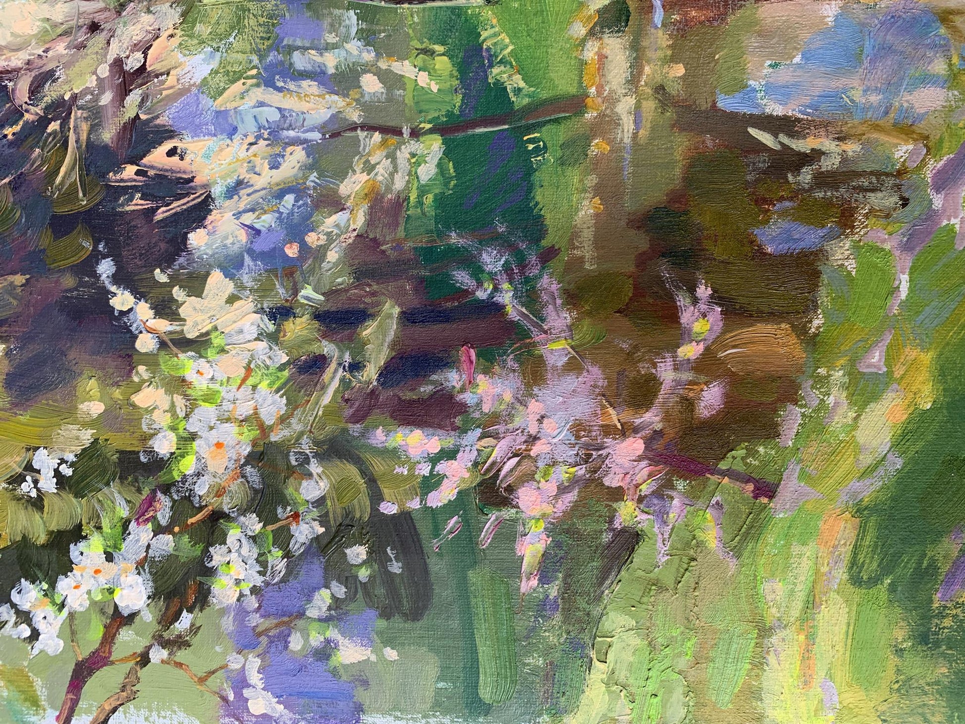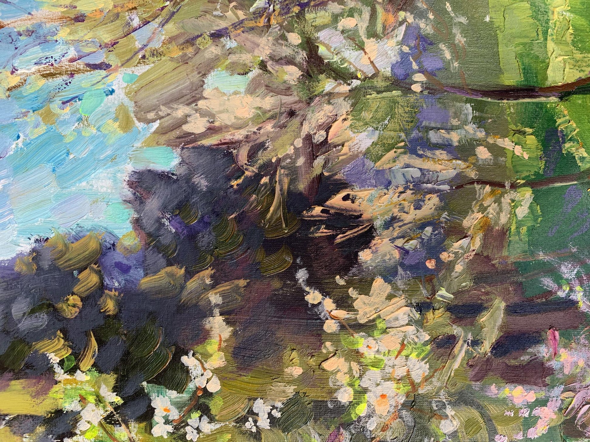 This beautiful oil painting is the perfect way to bring the beauty of spring into your home. The lovely green glade and stream are accented by flowering trees and a sunny day, creating a peaceful and inviting scene. The artist has captured the essence of springtime with this stunning work of art, making it a wonderful addition to any room.