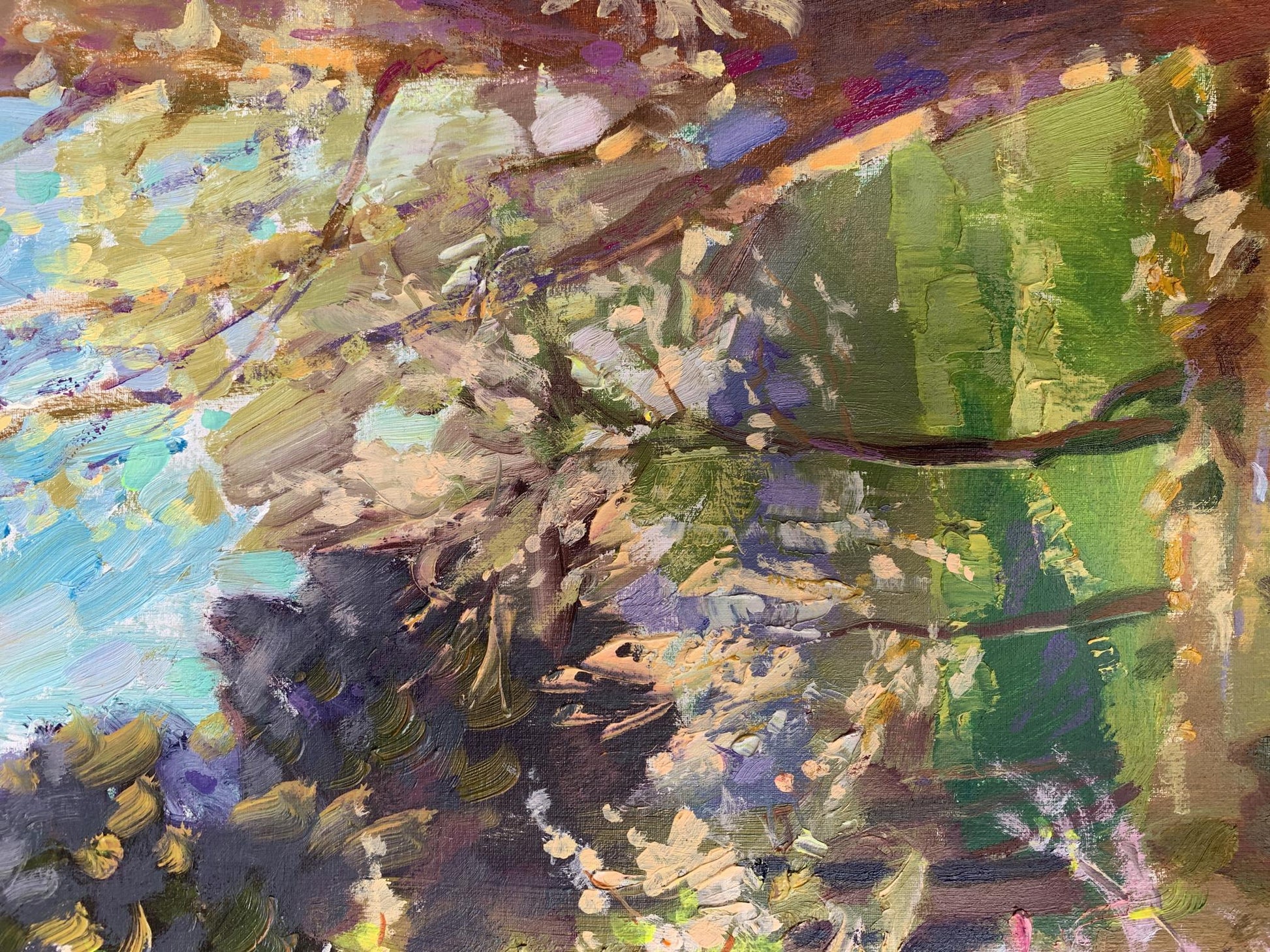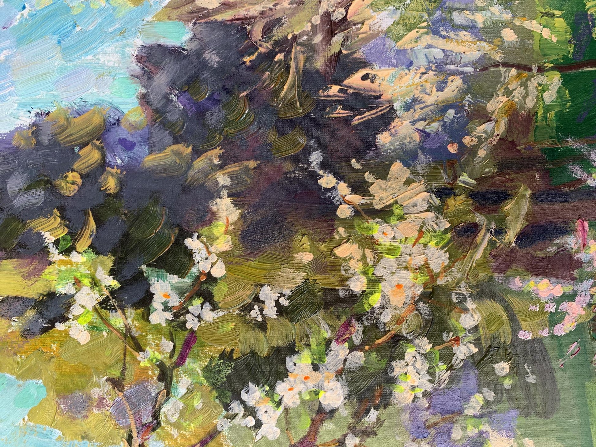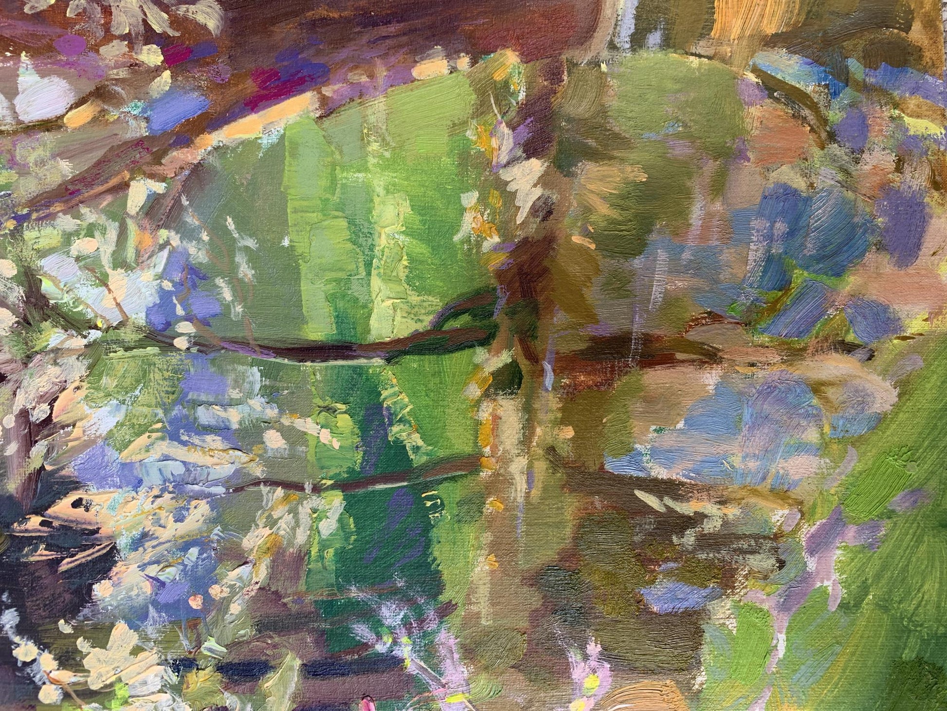 This beautiful oil painting is the perfect way to bring the beauty of spring into your home. The lovely green glade and stream are accented by flowering trees and a sunny day, creating a peaceful and inviting scene. The artist has captured the essence of springtime with this stunning work of art, making it a wonderful addition to any room.