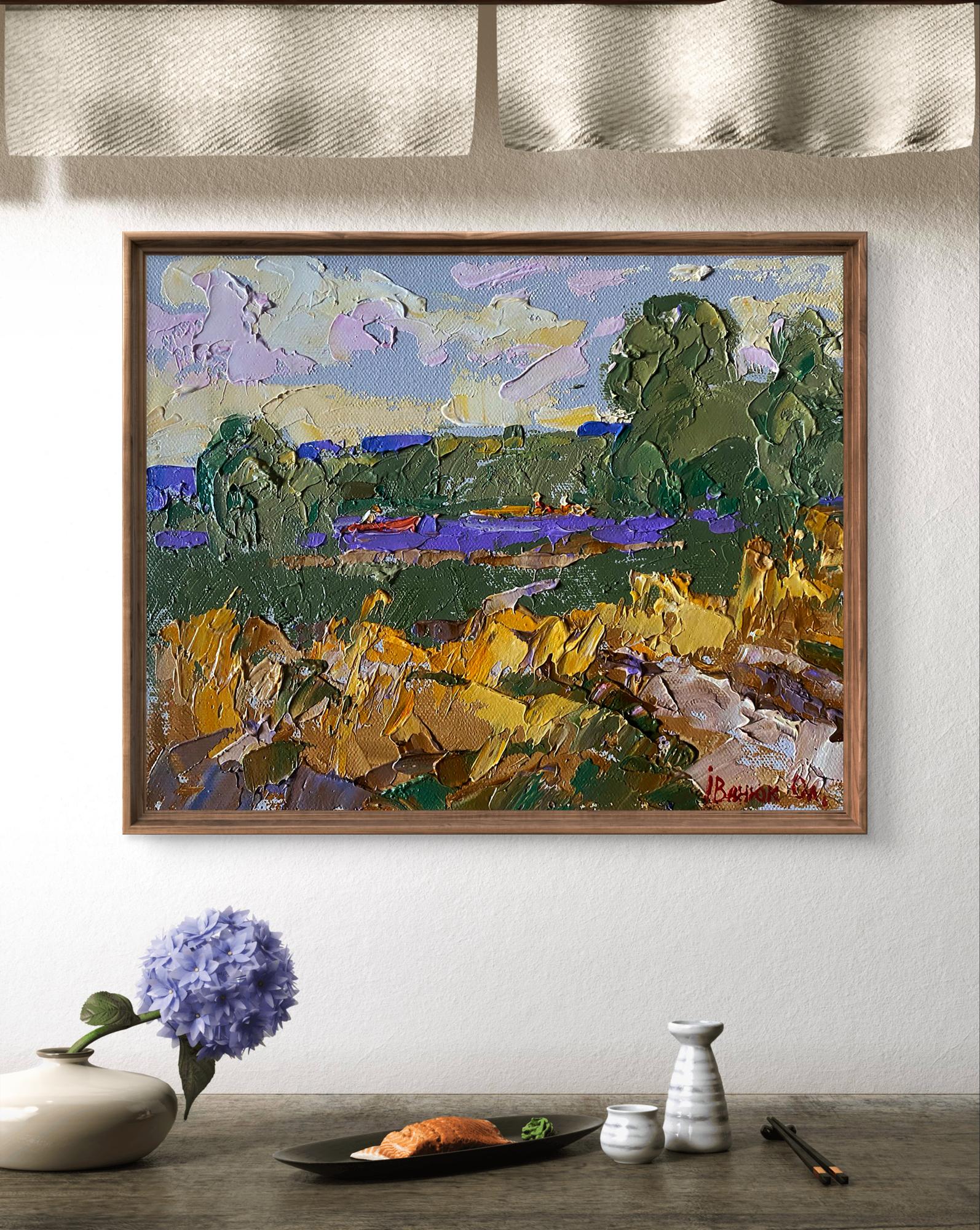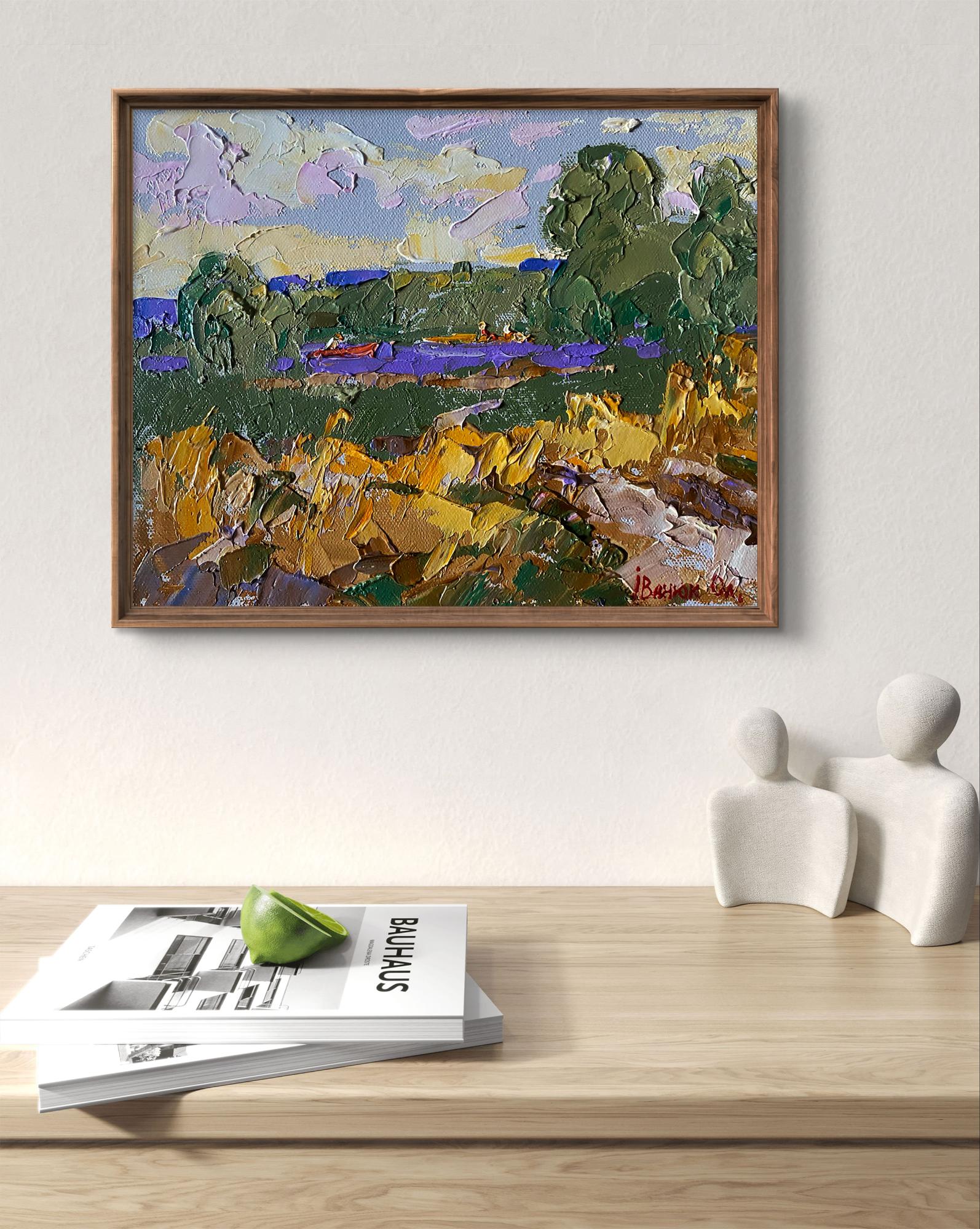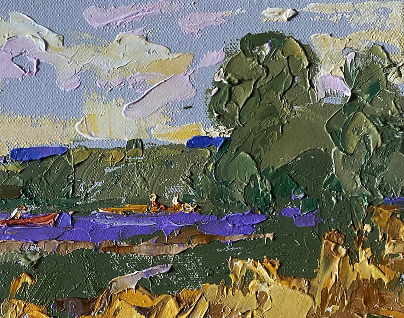 The painting "Small River" captures the serene beauty of a peaceful countryside scene, where a narrow river winds through lush green fields and golden meadows. The calm water reflects hues of blue and purple, while bright patches of sunlight illuminate the landscape, giving it a warm and inviting atmosphere. In the distance, a small red boat with two figures leisurely glides along the river, adding a human touch to the otherwise natural landscape. The thick impasto technique used by the artist brings texture and depth to the painting, making the foliage, water, and rocks appear almost three-dimensional. The brushstrokes are bold and expressive, capturing the vitality of nature and the play of light on the riverbanks. The painting evokes a sense of calm and tranquility, inviting the viewer to immerse themselves in the quiet charm of rural life. The bright sky, painted with soft pastel tones of pink, lavender, and cream, suggests a clear summer day, while the gently flowing river brings a feeling of peaceful movement to the scene. The composition is balanced, with the river and boat acting as the central focus, framed by trees and grassy fields on either side. The color palette is a mix of earthy greens and warm yellows, contrasted by vivid purple accents in the river and sky. The bold colors and dynamic strokes add a vibrant energy to the otherwise quiet landscape. "Small River" is a charming landscape painting that celebrates the simple beauty of nature and the peacefulness of rural life. The bold textures, rich colors, and dynamic composition make it a captivating piece that evokes feelings of calm, contentment, and connection with the natural world. The painting invites viewers to pause, reflect, and appreciate the beauty of a quiet day by the river.