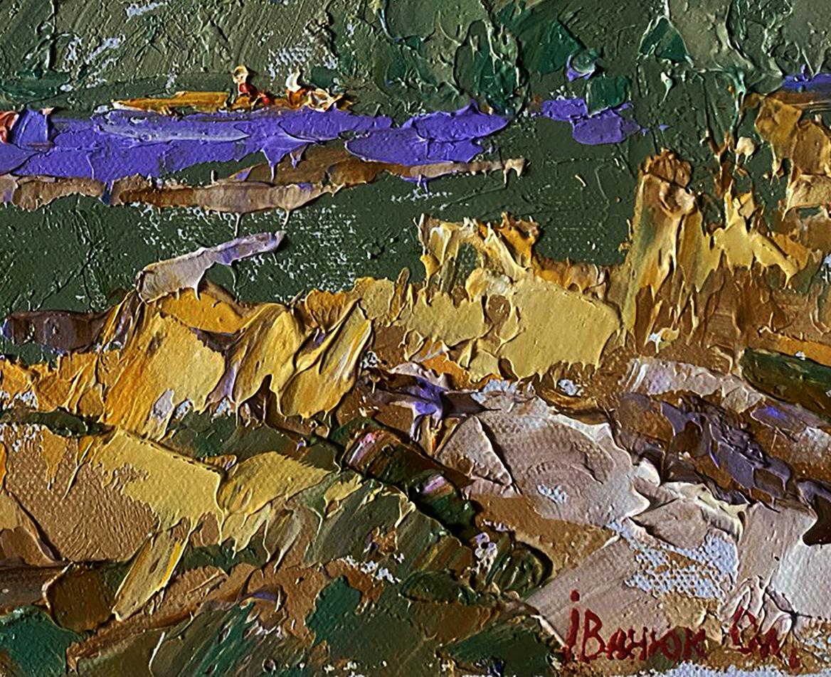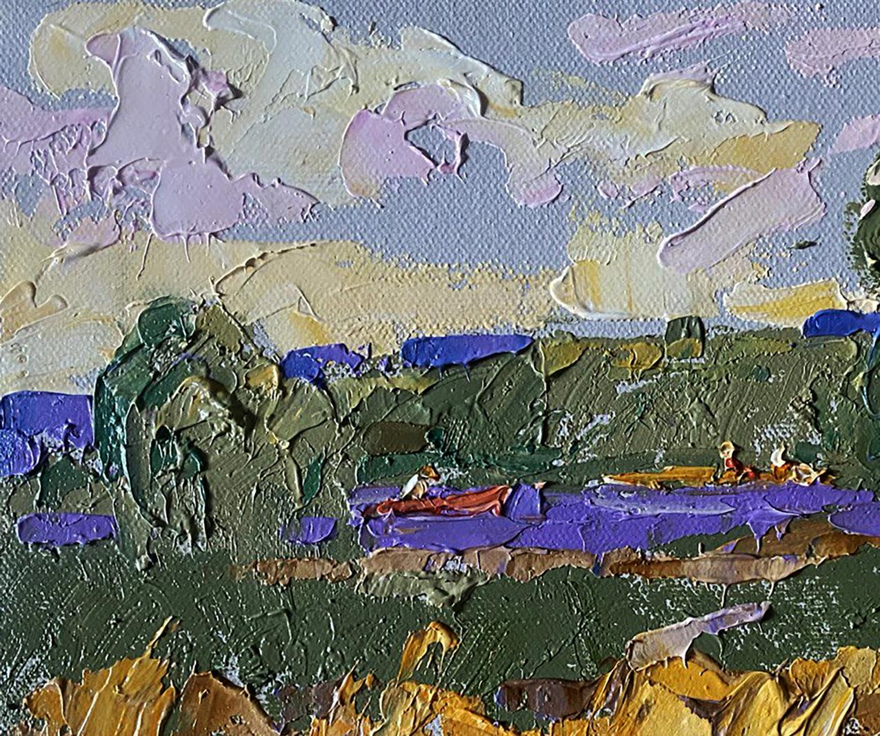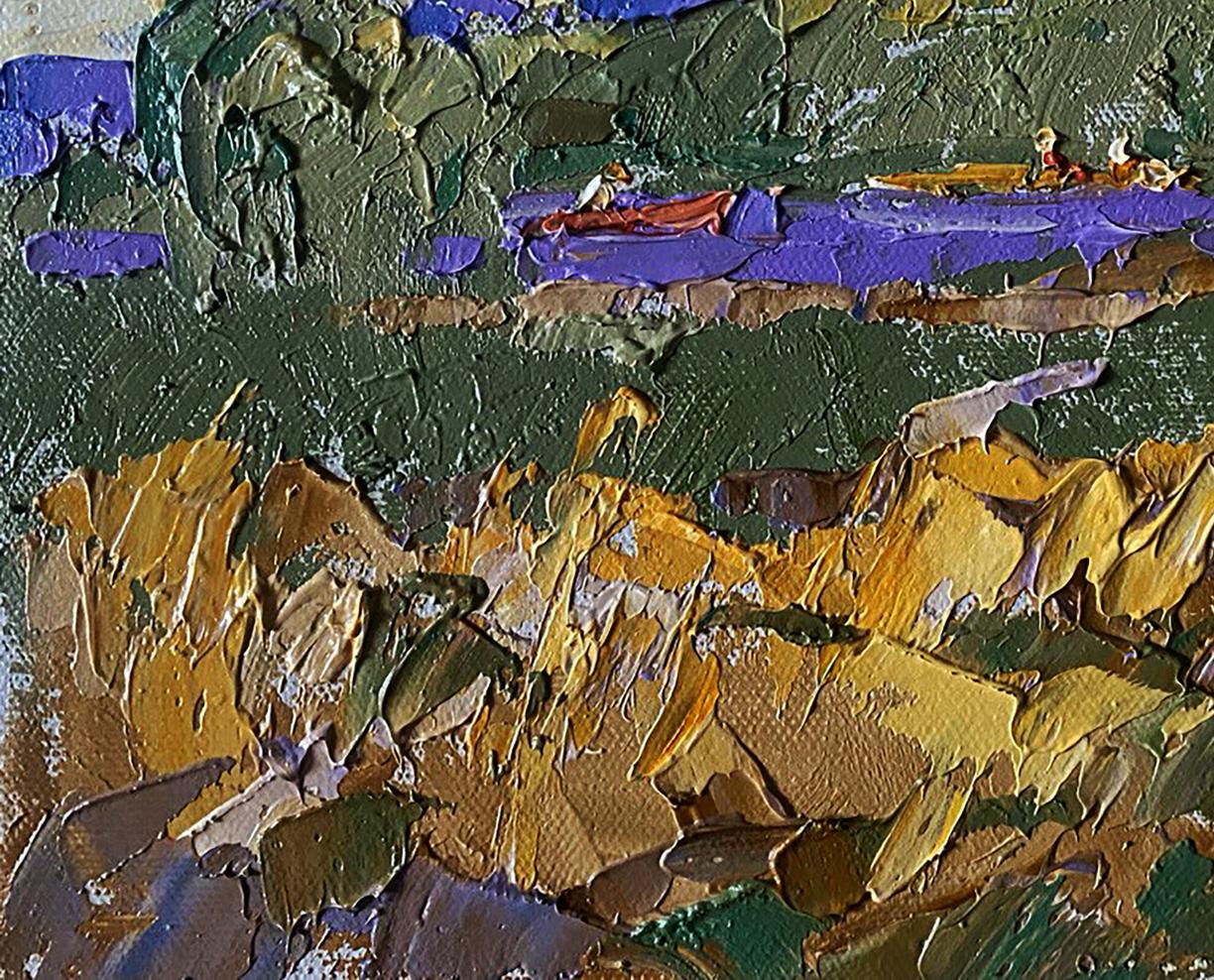 The painting "Small River" captures the serene beauty of a peaceful countryside scene, where a narrow river winds through lush green fields and golden meadows. The calm water reflects hues of blue and purple, while bright patches of sunlight illuminate the landscape, giving it a warm and inviting atmosphere. In the distance, a small red boat with two figures leisurely glides along the river, adding a human touch to the otherwise natural landscape. The thick impasto technique used by the artist brings texture and depth to the painting, making the foliage, water, and rocks appear almost three-dimensional. The brushstrokes are bold and expressive, capturing the vitality of nature and the play of light on the riverbanks. The painting evokes a sense of calm and tranquility, inviting the viewer to immerse themselves in the quiet charm of rural life. The bright sky, painted with soft pastel tones of pink, lavender, and cream, suggests a clear summer day, while the gently flowing river brings a feeling of peaceful movement to the scene. The composition is balanced, with the river and boat acting as the central focus, framed by trees and grassy fields on either side. The color palette is a mix of earthy greens and warm yellows, contrasted by vivid purple accents in the river and sky. The bold colors and dynamic strokes add a vibrant energy to the otherwise quiet landscape. "Small River" is a charming landscape painting that celebrates the simple beauty of nature and the peacefulness of rural life. The bold textures, rich colors, and dynamic composition make it a captivating piece that evokes feelings of calm, contentment, and connection with the natural world. The painting invites viewers to pause, reflect, and appreciate the beauty of a quiet day by the river.