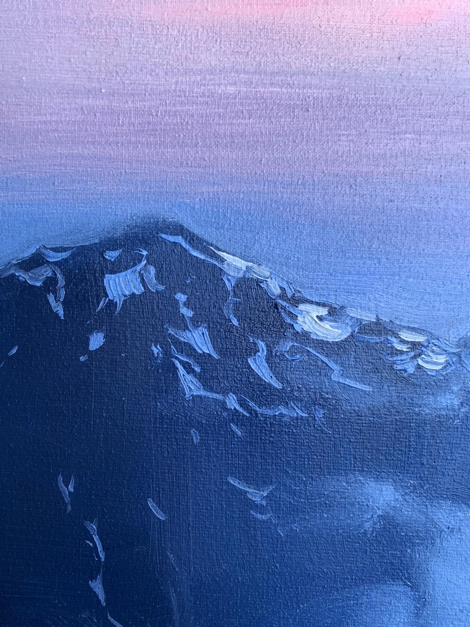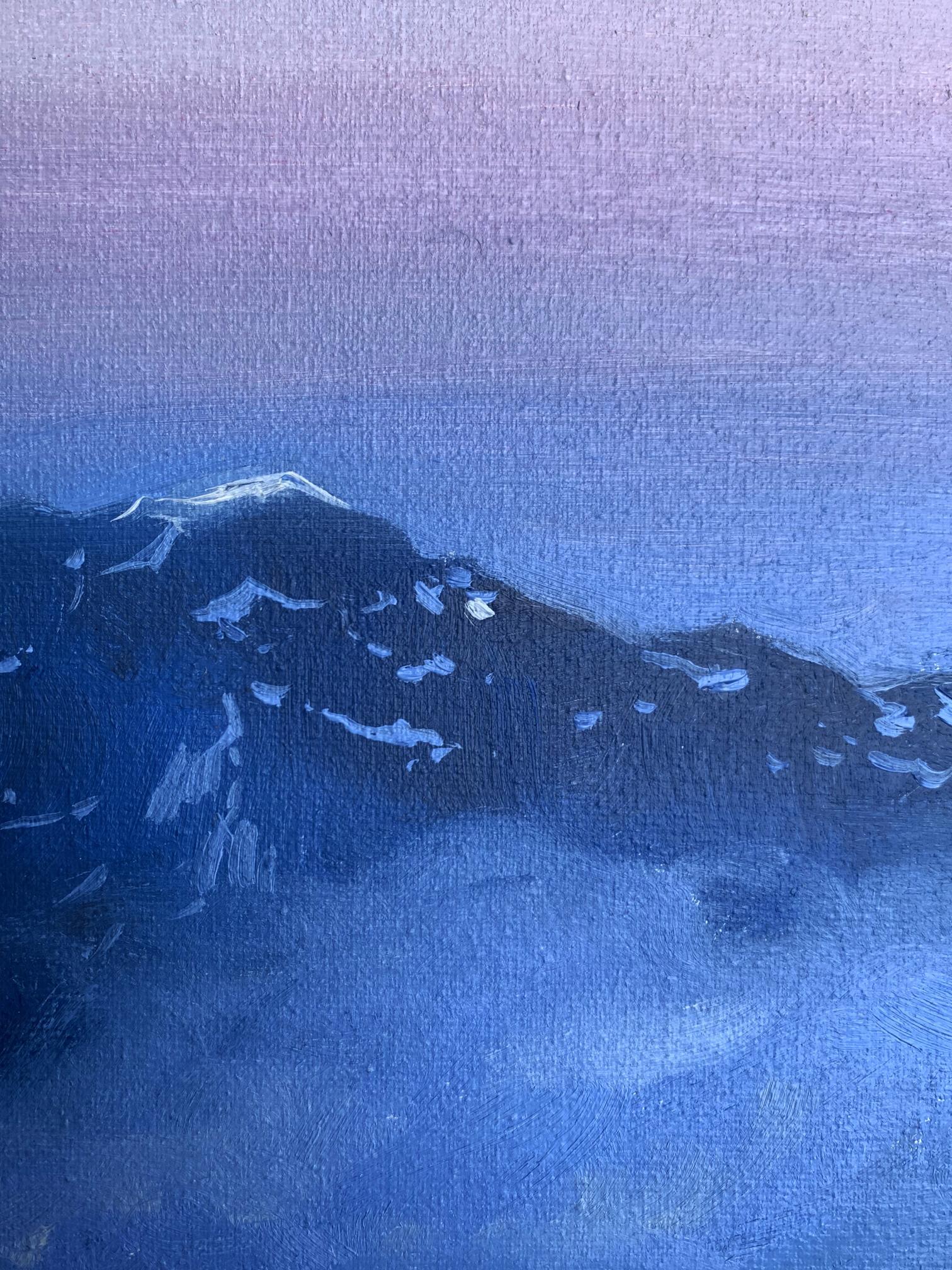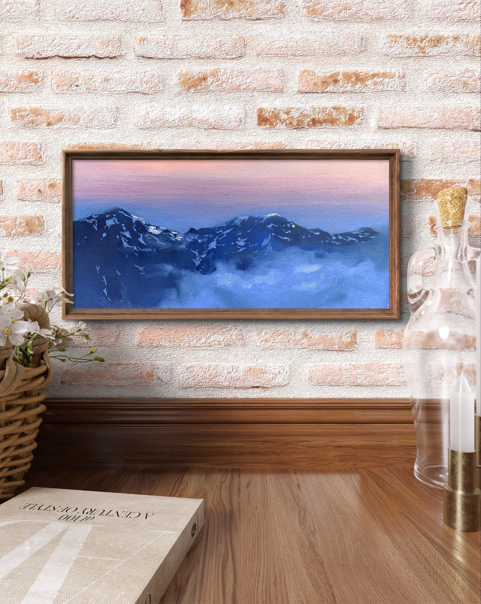 "Snowy Mountains" is a breathtaking oil painting that captures the serene beauty and majesty of snow-covered peaks at twilight. The artist's use of color and light creates a sense of tranquility and awe, inviting the viewer to immerse themselves in the quiet grandeur of the mountainous landscape. The artist employs a harmonious palette of cool blues and purples, contrasted with touches of warm pinks and oranges in the sky. These colors blend seamlessly to convey the ethereal quality of twilight over the mountains. The use of oil paints allows for rich textures and depth, particularly in the rendering of the snow and the sky. The composition is horizontally oriented, emphasizing the expansive nature of the mountain range. The horizon line is placed high in the frame, allowing the mountains to dominate the scene. The snow-capped peaks are the focal point of the painting. The artist skillfully captures the rugged texture and form of the mountains using a combination of smooth and impasto techniques. The snow on the peaks is depicted with bright, crisp whites, contrasting sharply with the deep, shadowy blues of the rocky surfaces. The sky above the mountains transitions from a soft, warm glow of sunset to the cool, dusky blues of early night. The gradient of colors creates a sense of depth and atmosphere, enhancing the overall mood of the painting. The artist's delicate brushwork captures the subtle variations in color and light, adding to the realistic yet dreamlike quality of the scene. At the base of the mountains, a layer of mist or low-lying clouds adds an element of mystery and softness to the composition. The mist is painted with gentle, sweeping strokes, blending seamlessly with the darker tones of the mountains and the lighter tones of the sky. The snow-covered peaks are the central feature, symbolizing purity, tranquility, and the timeless beauty of nature. The transition from day to night in the sky adds a dynamic element to the painting, capturing a fleeting yet profound moment of natural beauty. The mist at the base of the mountains adds depth and a sense of mystery, enhancing the overall atmosphere of the painting. The mood of "Snowy Mountains" is one of peaceful solitude and quiet majesty. The cool, calming colors and the serene composition evoke a sense of stillness and reflection. This painting invites the viewer to pause and appreciate the untouched beauty of the natural world. "Snowy Mountains" can be interpreted as a celebration of the timeless and unchanging beauty of nature. The painting captures a moment of tranquility and majesty, reminding viewers of the power and serenity that can be found in the natural landscape. The artist's skillful use of color, light, and texture brings this mountain scene to life, making "Snowy Mountains" a captivating and evocative piece that resonates with viewers on a deeply emotional level.