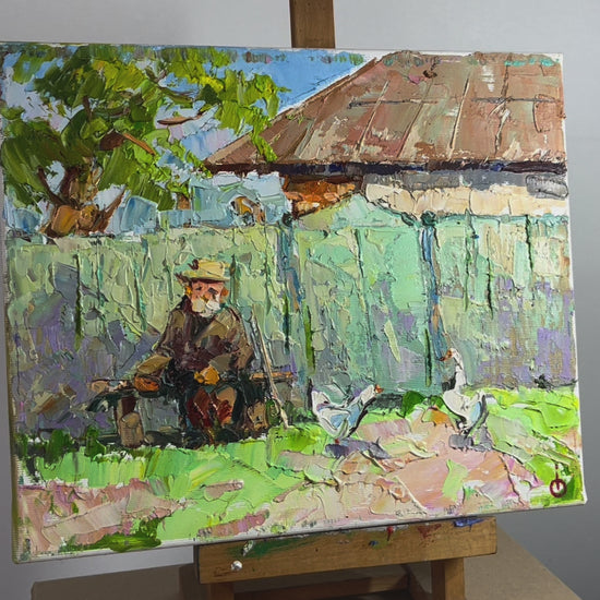To the right, two white geese are painted with brisk, lively strokes, symbolizing the reawakening of nature. Their animated presence contrasts with the stillness of the seated man, adding dynamism to the composition. Behind the figure, a softly colored wooden fence and the backdrop of a rustic homestead suggest a secluded and intimate countryside life.
