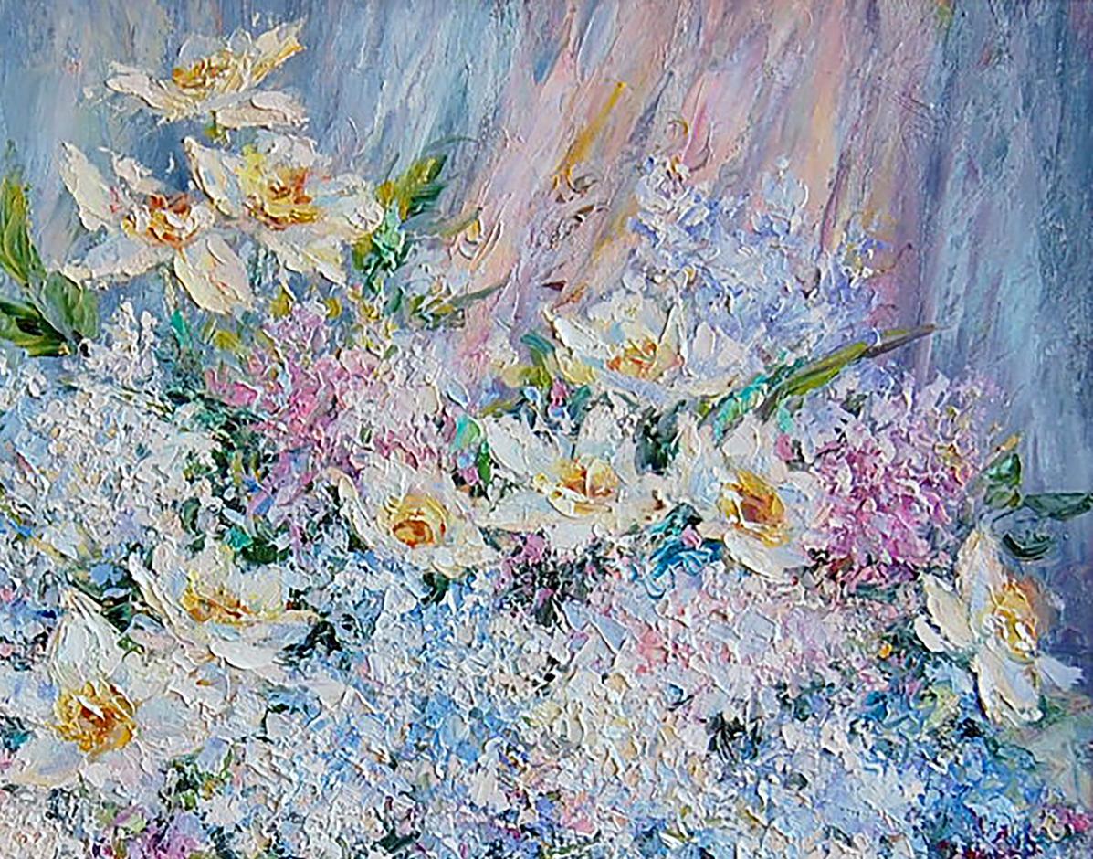 In "Spring Bouquet," Ukrainian artist Olga Artim captures the beauty of spring’s renewal with a vibrant arrangement of lilacs and daffodils. The soft blues, purples, and pinks create a sense of freshness, making this artwork an exquisite representation of new beginnings. Artim’s textured brushstrokes and impressionistic technique bring the bouquet to life, evoking the gentle movement of the flowers as they bask in the spring sunlight. Overflowing from the vase, the flowers symbolize the abundance and vitality of the season, making it a perfect addition to any Collection of Still lifes or Collection of Painting with Flowers.