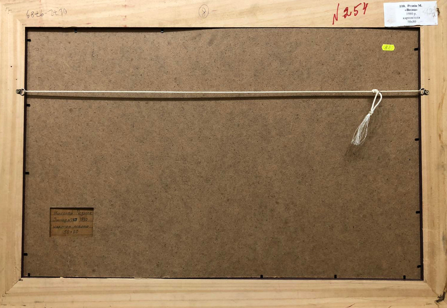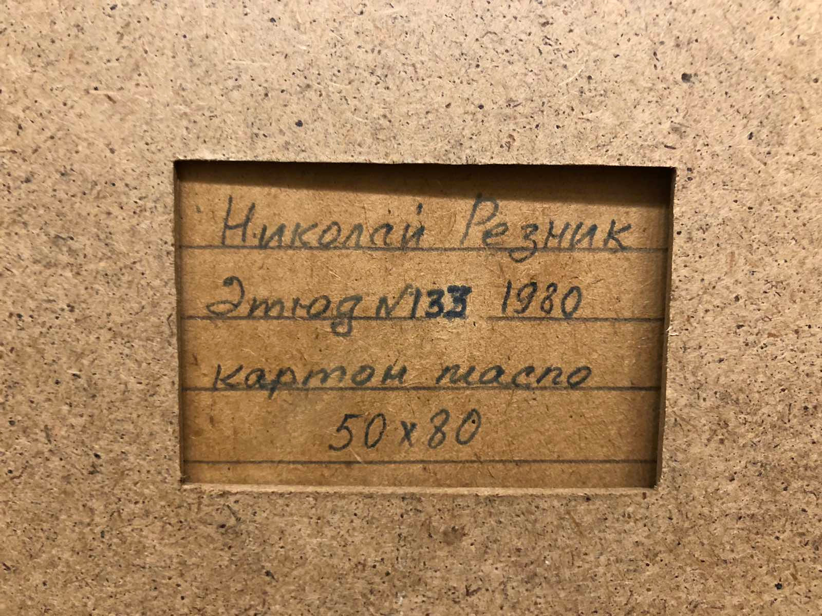 About the artists: Mykola Reznik (1929-2001) - artist of cinema, painter. Born in Litki village, Kiev region. He graduated from Lviv Institute of Applied and Decorative Arts (1955). He worked at Dovzhenko film studio. Artist of films " High price" (1957), "Grigoriy Skovoroda" (1958), "Stone Cross" and others. Participant of numerous exhibitions. He lived and worked in Kyiv.