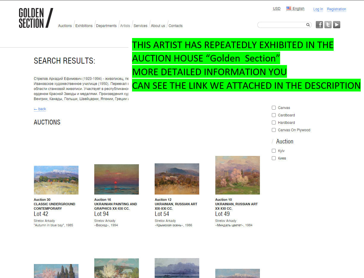 About the artists: Strelov Arkady Efimovich (1923-1994) - painter, landscape painter. Born in the village of Shukhra, Ivanovo region, Russia. Graduated from the Ivanovo Art School (1950). Moved to Yalta (1950). Member of the USSR Union of Artists (since 1961). Participant of the Second World War. Works in the field of easel painting. Participates in republican, all-union and international exhibitions (since 1957). He was awarded the Order of the Red Star and medals. The artist's works are kept in museums in Ukraine and private collections in Hungary, Canada, Poland, Switzerland, Japan, Greece and the USA.
