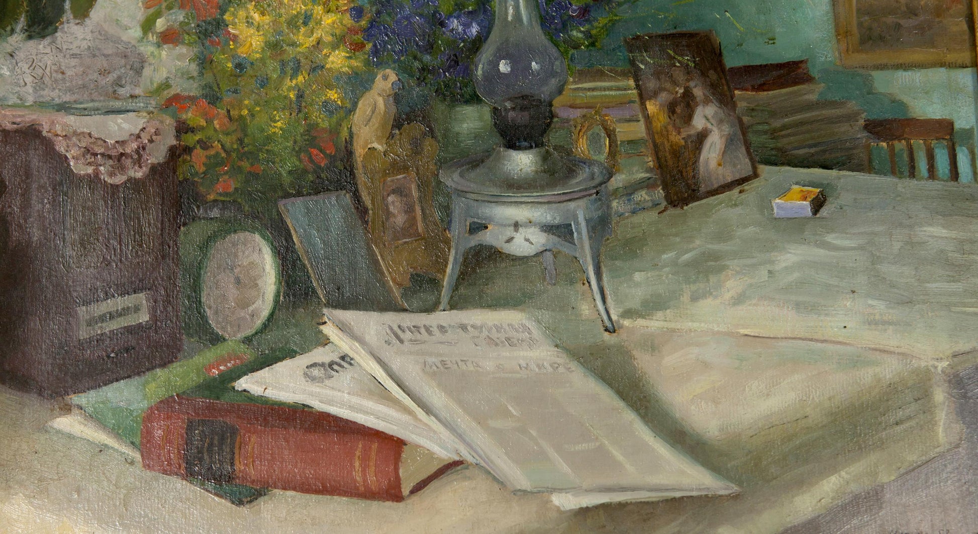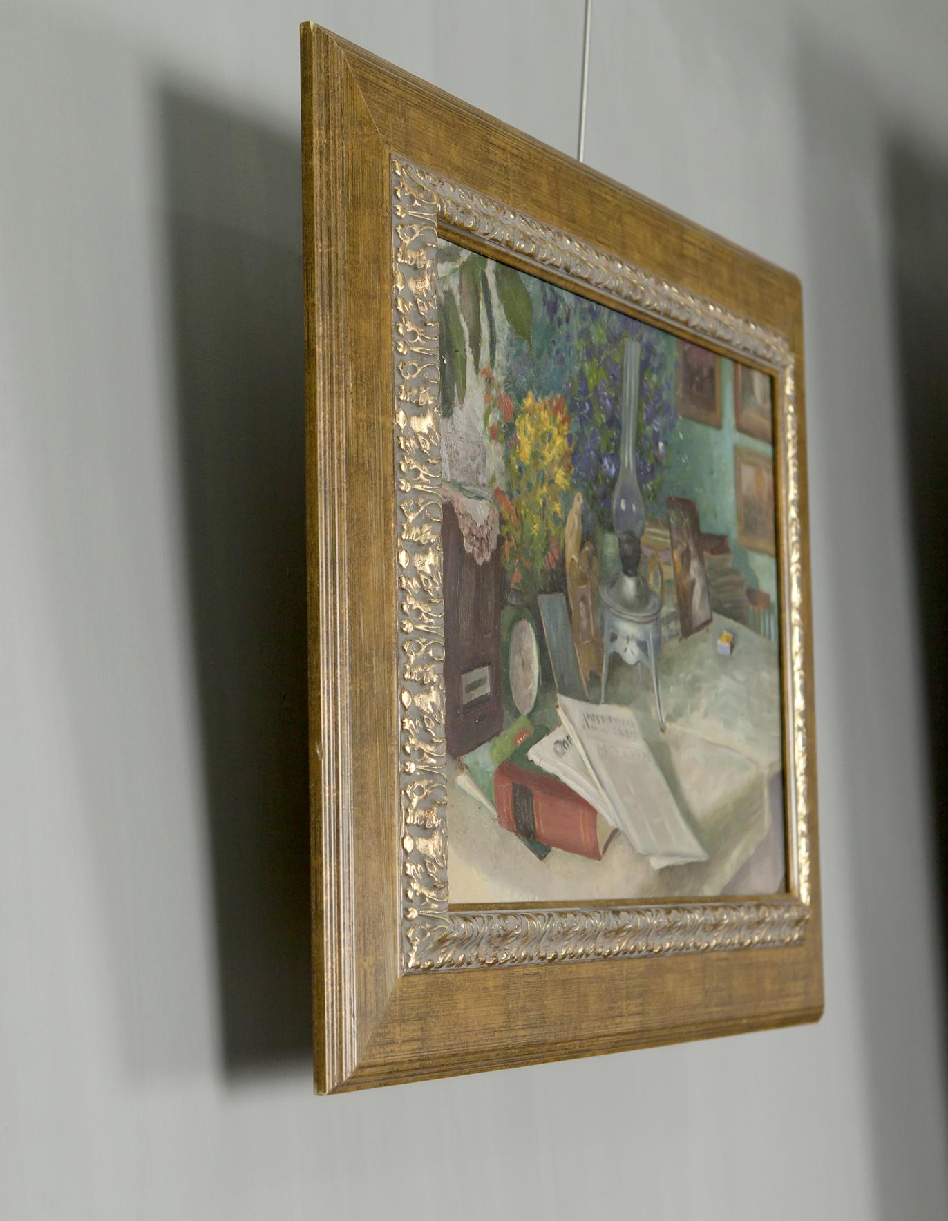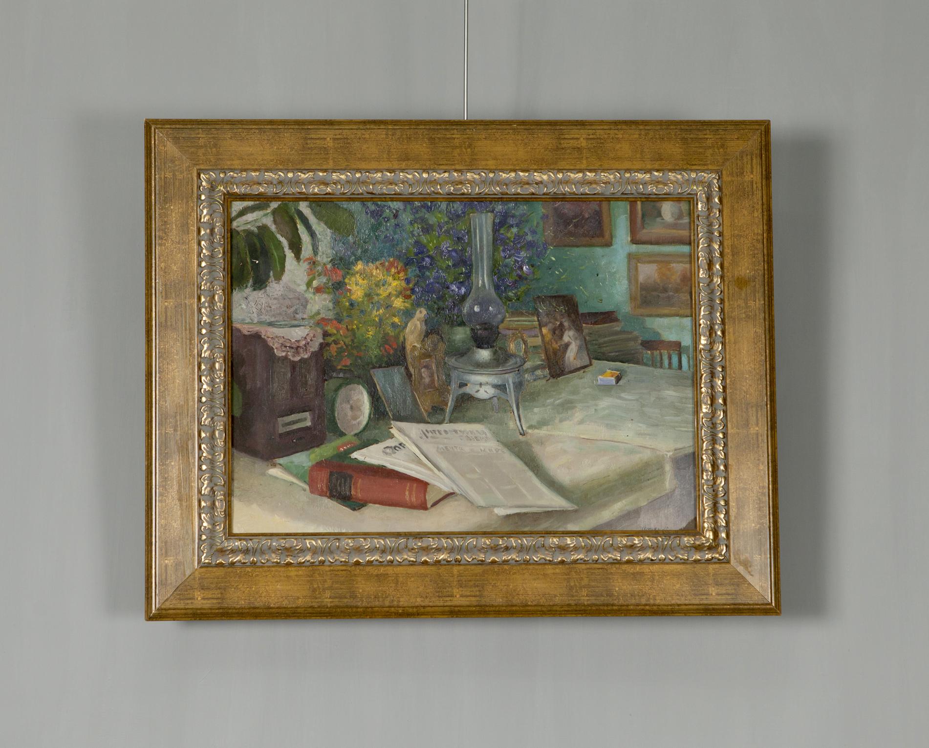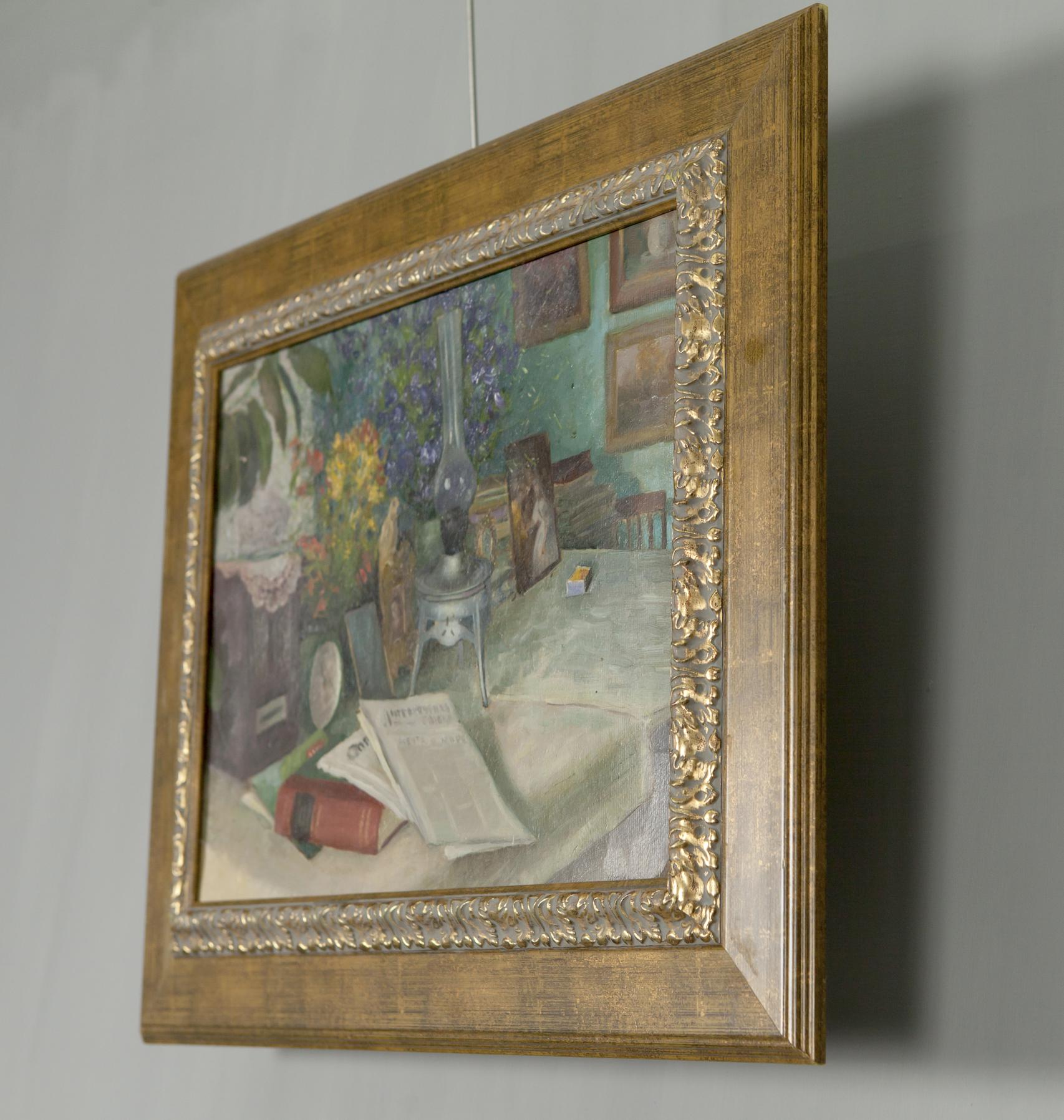 Oil Painting Still Life / Painting with Books Food Drink Flowers on the Table