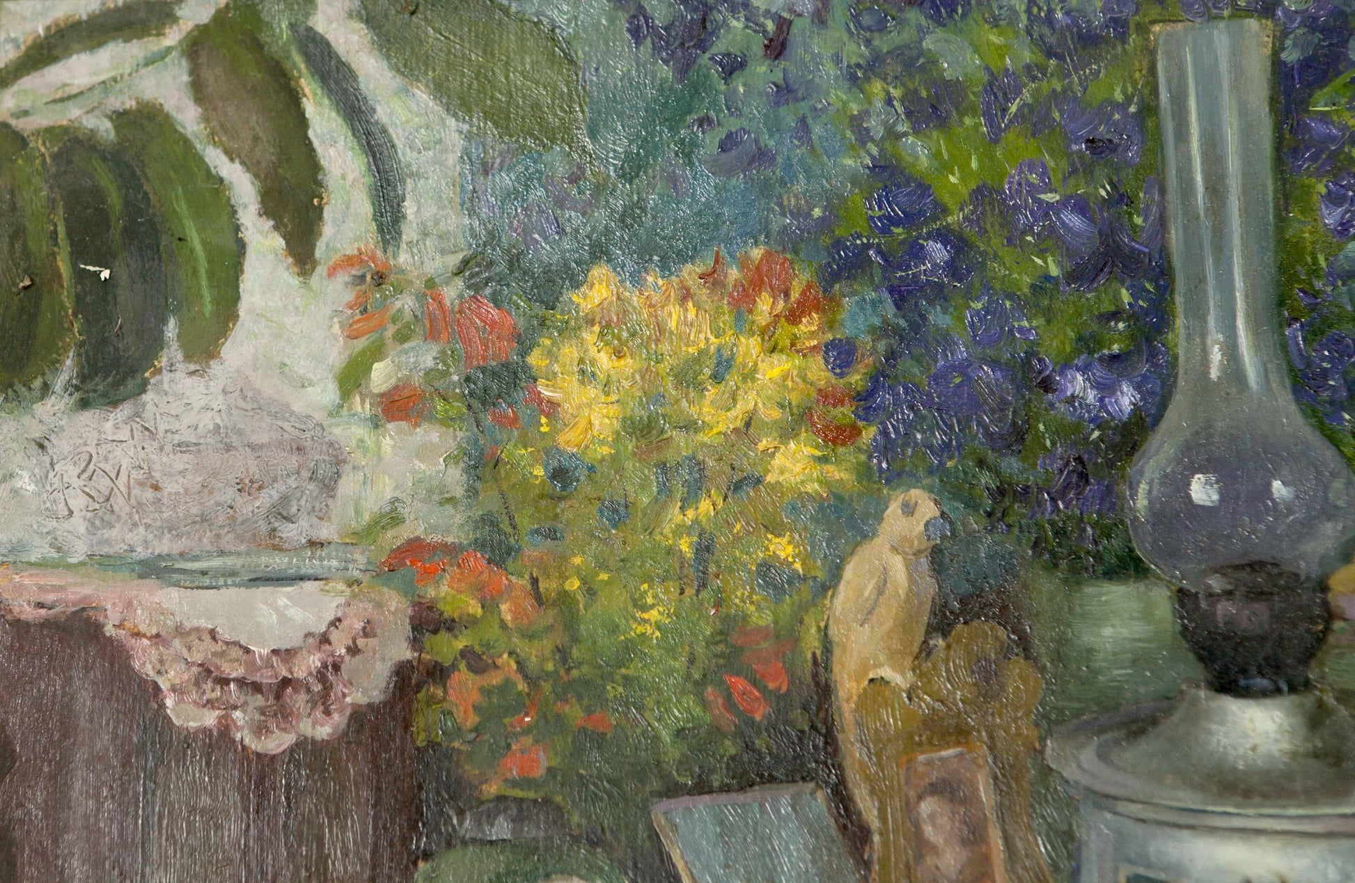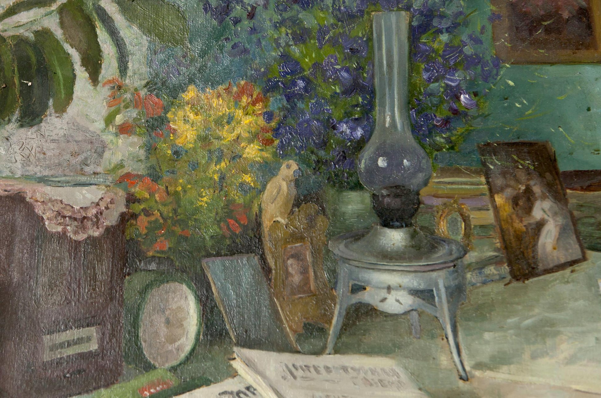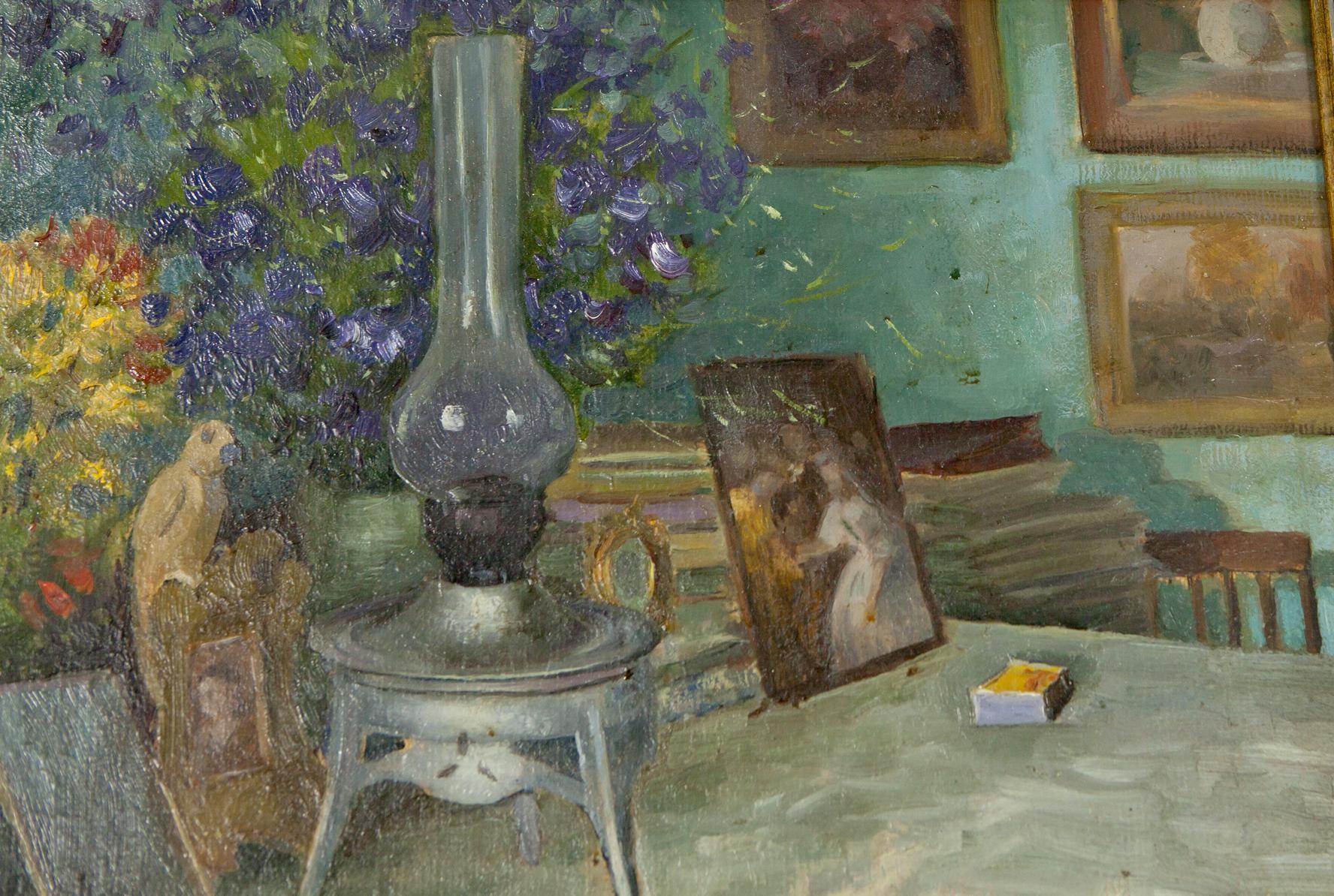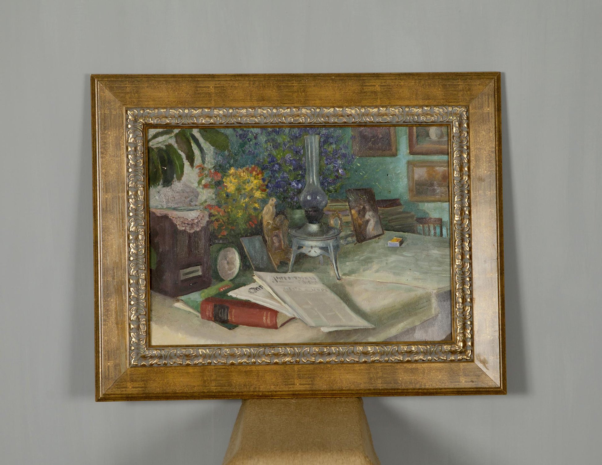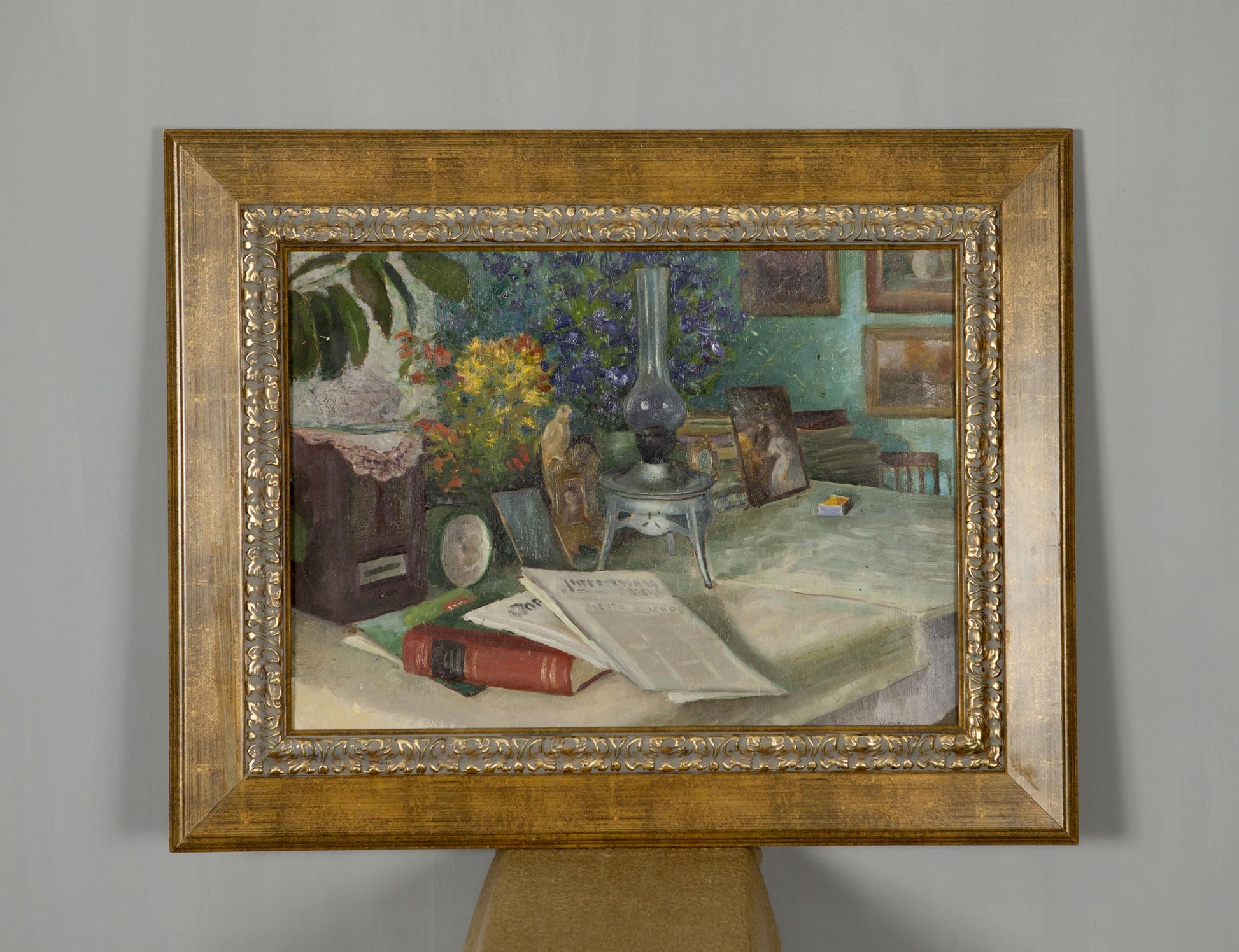 Oil Painting Still Life / Painting with Books Food Drink Flowers on the Table