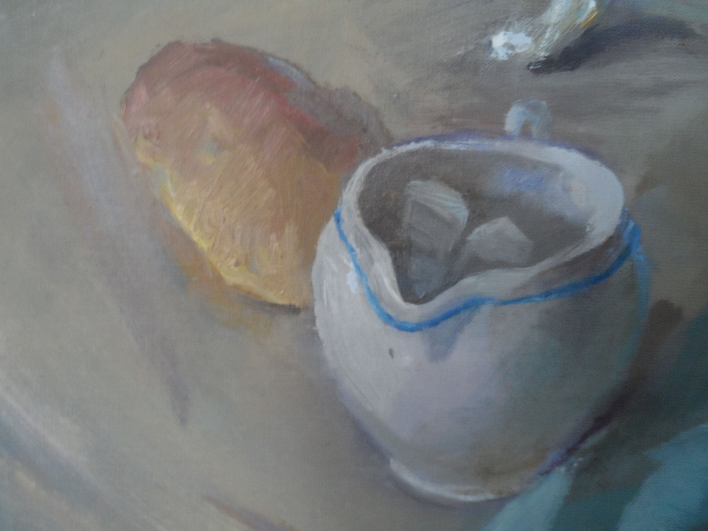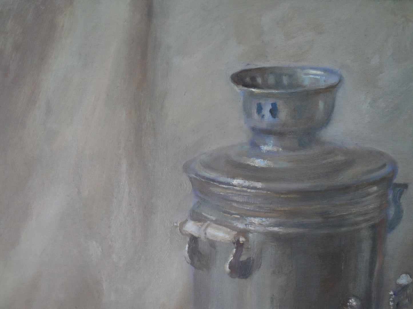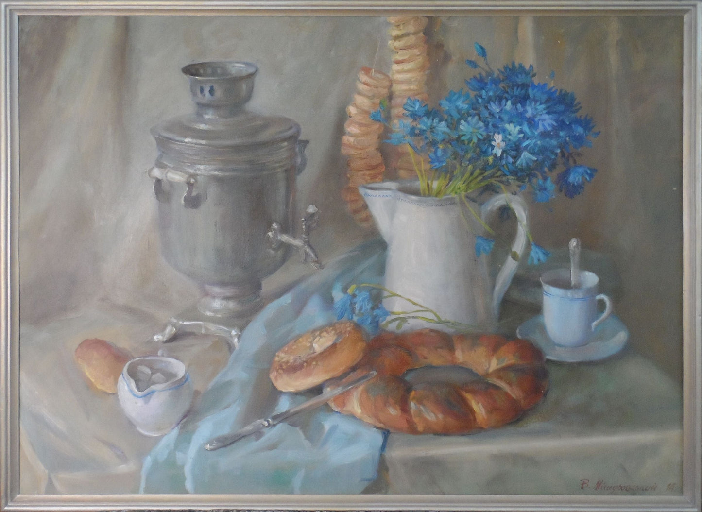 In this painting, Myshurovsky masterfully employs soft, muted colors to create a serene atmosphere, while the vivid blue cornflowers provide a striking contrast that adds vibrancy to the composition. The scene includes a metallic samovar, a jug of cornflowers, a stack of bagels, and a mug of tea, all carefully laid out on a draped table. The detailed rendering of these items not only showcases Myshurovsky's skill in capturing texture and mood but also reflects a deep appreciation for the craftsmanship and heritage reflected in the objects depicted.