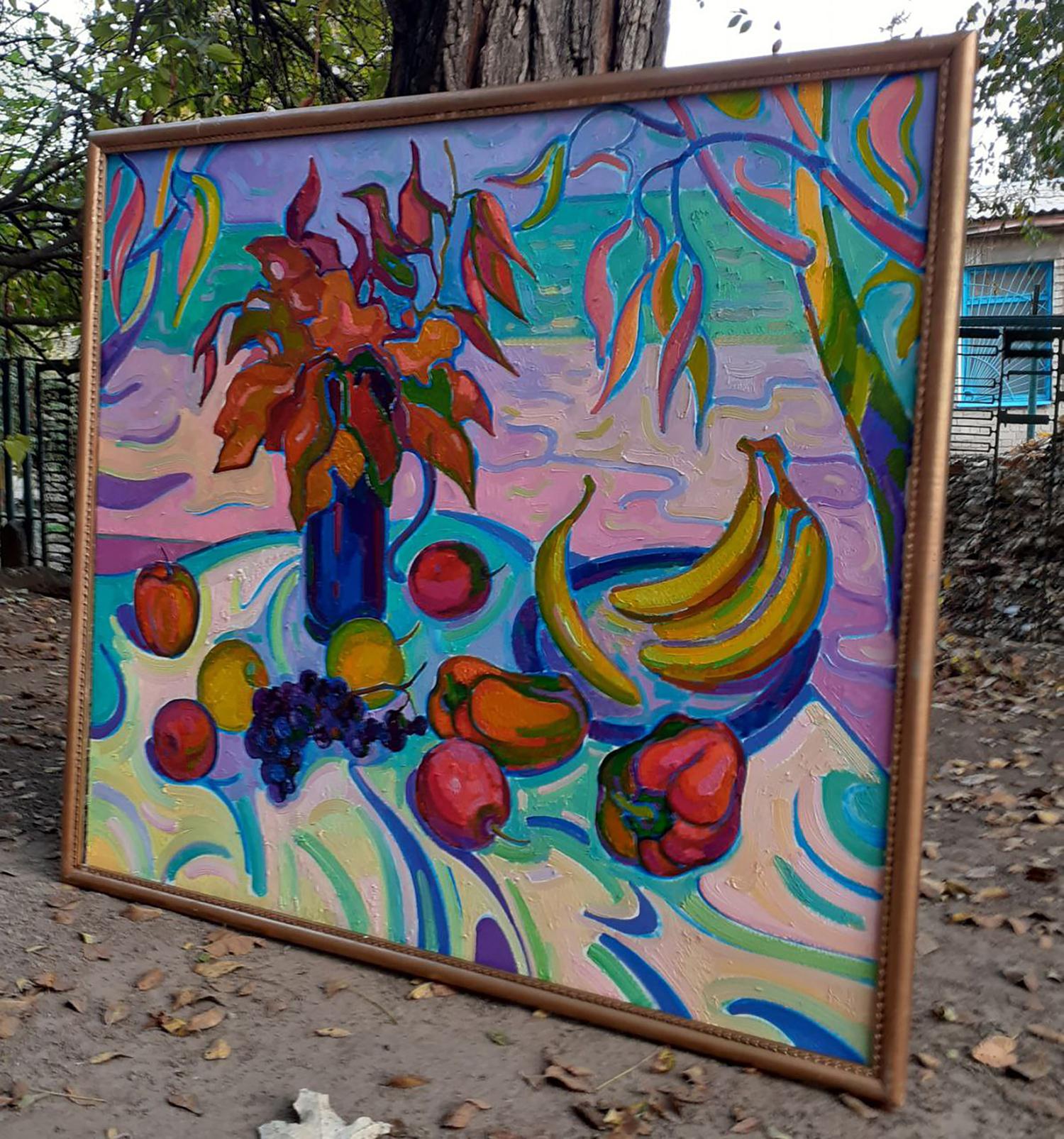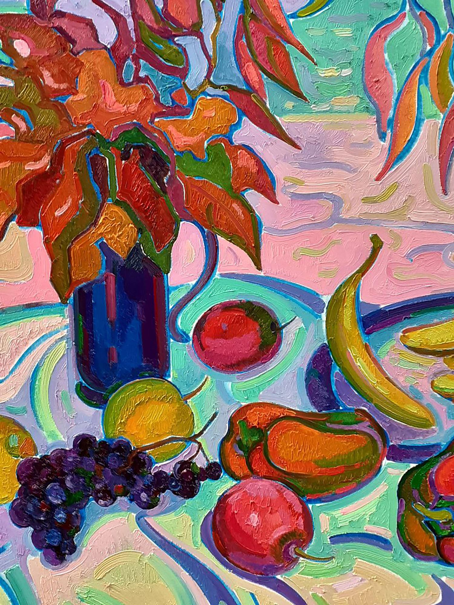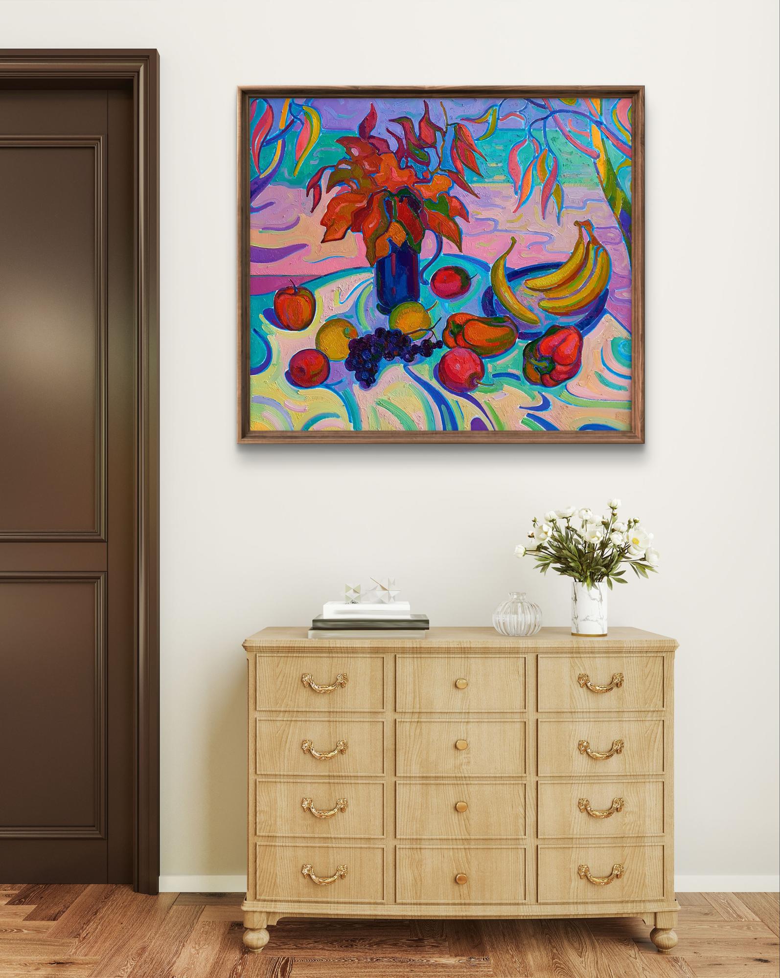 "Still Life with Dry Leaves and Fruits" is a vibrant and expressive oil painting that captures the essence of autumn through a rich and dynamic use of color and form. The composition is an explosion of hues, drawing the viewer into a world where nature's bounty is celebrated with a joyful and almost surreal intensity. At the center of the painting, a dark blue vase holds a striking arrangement of dry leaves. The leaves, painted in warm shades of red, orange, and green, fan outwards, creating a dramatic focal point. Their textures and colors suggest the crispness and richness of the autumn season. Surrounding the vase is an abundant display of fruits. To the left, several apples and a cluster of dark purple grapes are depicted with bold, energetic brushstrokes. The apples, in shades of red and yellow, and the grapes, with their deep, rich tones, add a sense of freshness and vitality to the scene. On the right side of the composition, a bunch of bananas sits on a blue plate, their bright yellow contrasting beautifully with the surrounding colors. Near the bananas, two vibrant red peppers and a couple of peaches add further variety to the still life, their rounded forms and vivid colors enhancing the overall composition. The background and tablecloth are painted in swirling patterns of purples, pinks, blues, and greens, creating a sense of movement and fluidity. These colors and patterns not only unify the composition but also evoke a whimsical, almost dreamlike atmosphere. The interplay of light and shadow, achieved through the use of bold, expressive brushstrokes and a dynamic color palette, adds depth and dimension to the painting. The artist's technique of layering colors and creating textured surfaces gives the work a tactile quality that invites closer inspection. "Still Life with Dry Leaves and Fruits" can be interpreted as a celebration of nature's beauty and abundance. The use of vibrant colors and dynamic composition suggests a sense of joy and exuberance, while the presence of dry leaves and autumnal tones hints at the changing seasons and the passage of time. The painting invites viewers to appreciate the simple pleasures of life and the natural world's richness. The juxtaposition of fresh fruits with dry leaves may also symbolize the cycle of life and the coexistence of growth and decay. This oil painting is a masterful blend of vibrant color, dynamic composition, and expressive brushwork. "Still Life with Dry Leaves and Fruits" captures the viewer's attention with its joyful celebration of autumn and nature's bounty. The artist's ability to convey movement, texture, and emotion through color and form makes this work a striking and memorable piece that resonates with viewers on both a visual and emotional level.