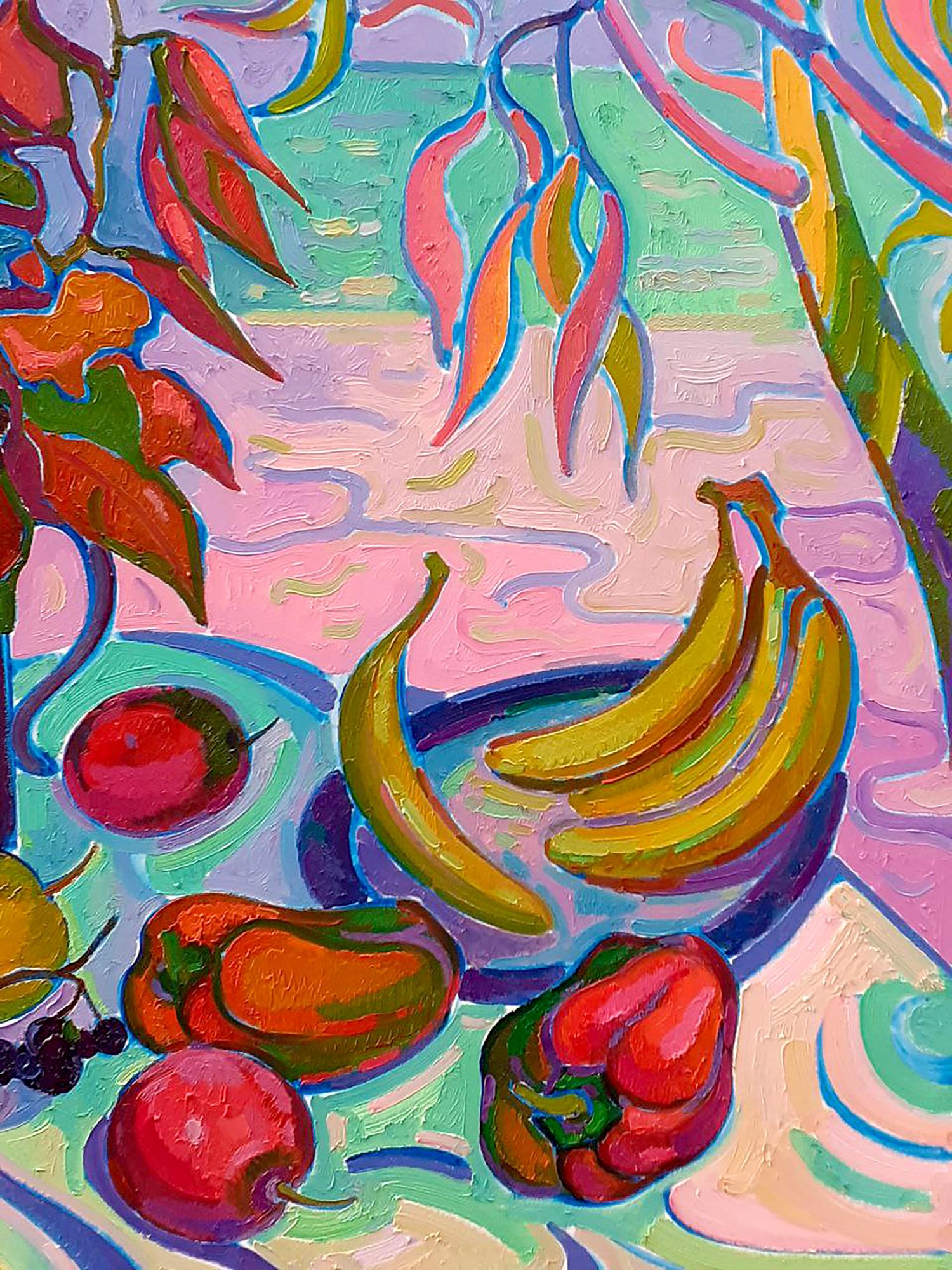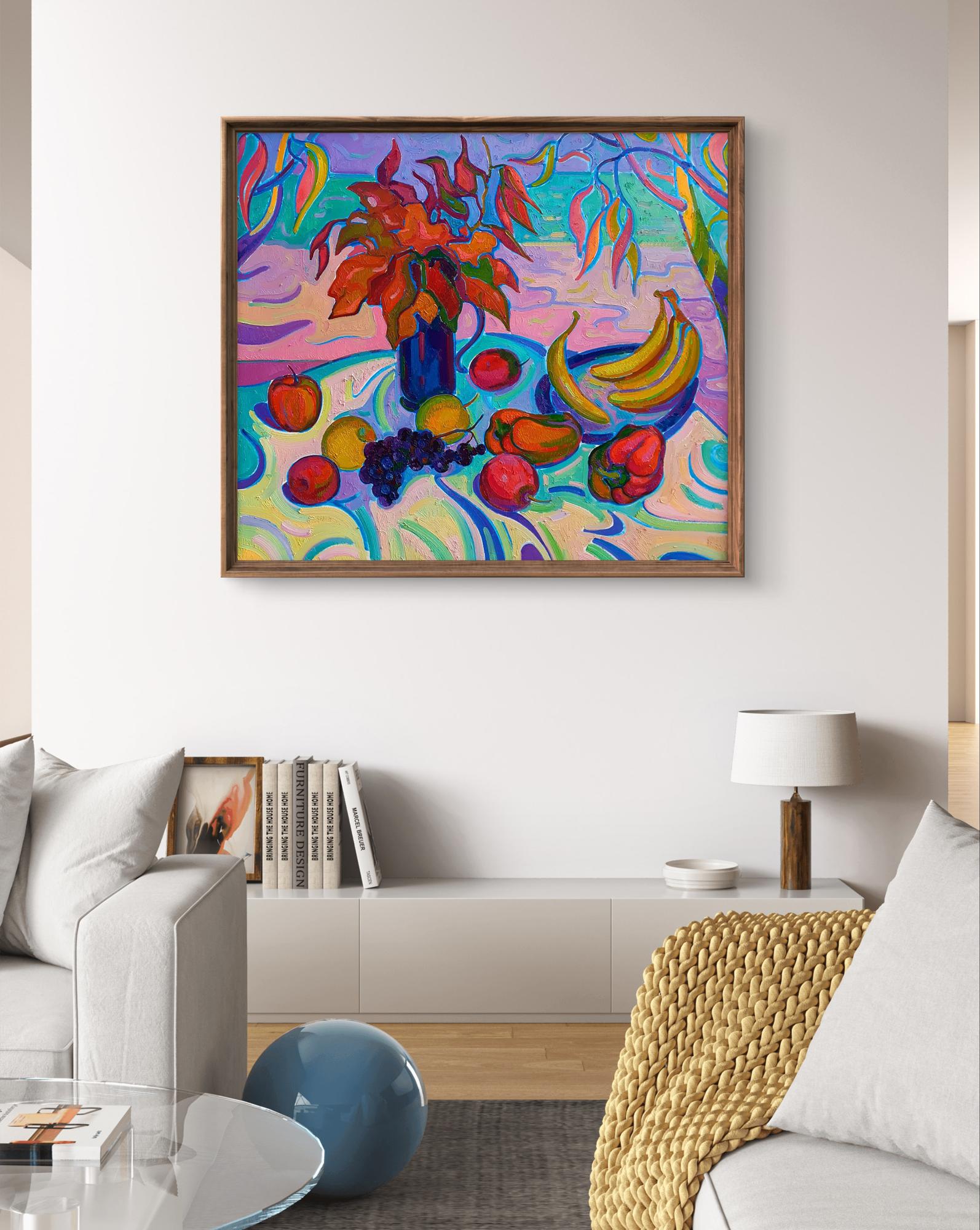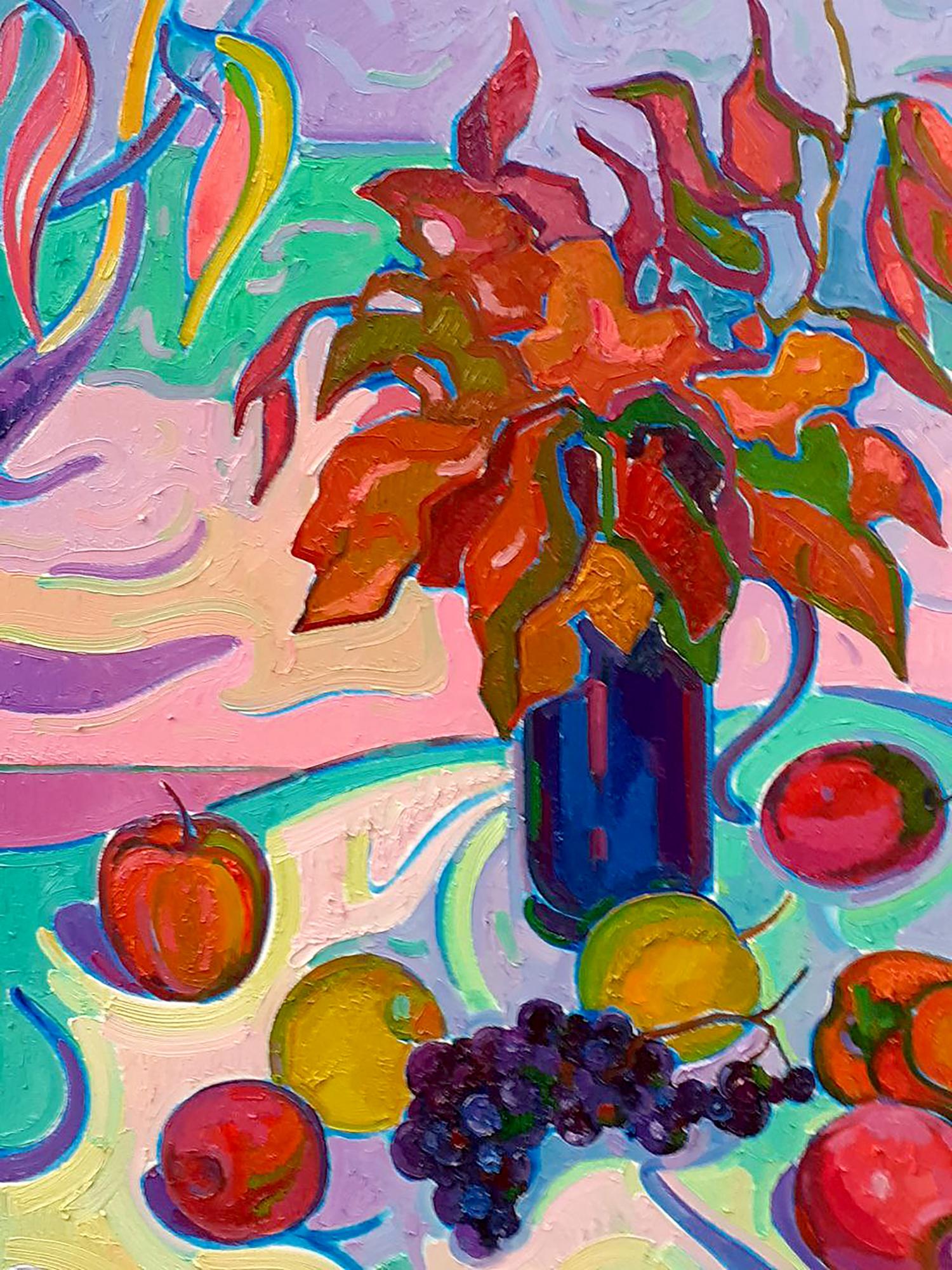"Still Life with Dry Leaves and Fruits" is a vibrant and expressive oil painting that captures the essence of autumn through a rich and dynamic use of color and form. The composition is an explosion of hues, drawing the viewer into a world where nature's bounty is celebrated with a joyful and almost surreal intensity. At the center of the painting, a dark blue vase holds a striking arrangement of dry leaves. The leaves, painted in warm shades of red, orange, and green, fan outwards, creating a dramatic focal point. Their textures and colors suggest the crispness and richness of the autumn season. Surrounding the vase is an abundant display of fruits. To the left, several apples and a cluster of dark purple grapes are depicted with bold, energetic brushstrokes. The apples, in shades of red and yellow, and the grapes, with their deep, rich tones, add a sense of freshness and vitality to the scene. On the right side of the composition, a bunch of bananas sits on a blue plate, their bright yellow contrasting beautifully with the surrounding colors. Near the bananas, two vibrant red peppers and a couple of peaches add further variety to the still life, their rounded forms and vivid colors enhancing the overall composition. The background and tablecloth are painted in swirling patterns of purples, pinks, blues, and greens, creating a sense of movement and fluidity. These colors and patterns not only unify the composition but also evoke a whimsical, almost dreamlike atmosphere. The interplay of light and shadow, achieved through the use of bold, expressive brushstrokes and a dynamic color palette, adds depth and dimension to the painting. The artist's technique of layering colors and creating textured surfaces gives the work a tactile quality that invites closer inspection. "Still Life with Dry Leaves and Fruits" can be interpreted as a celebration of nature's beauty and abundance. The use of vibrant colors and dynamic composition suggests a sense of joy and exuberance, while the presence of dry leaves and autumnal tones hints at the changing seasons and the passage of time. The painting invites viewers to appreciate the simple pleasures of life and the natural world's richness. The juxtaposition of fresh fruits with dry leaves may also symbolize the cycle of life and the coexistence of growth and decay. This oil painting is a masterful blend of vibrant color, dynamic composition, and expressive brushwork. "Still Life with Dry Leaves and Fruits" captures the viewer's attention with its joyful celebration of autumn and nature's bounty. The artist's ability to convey movement, texture, and emotion through color and form makes this work a striking and memorable piece that resonates with viewers on both a visual and emotional level.