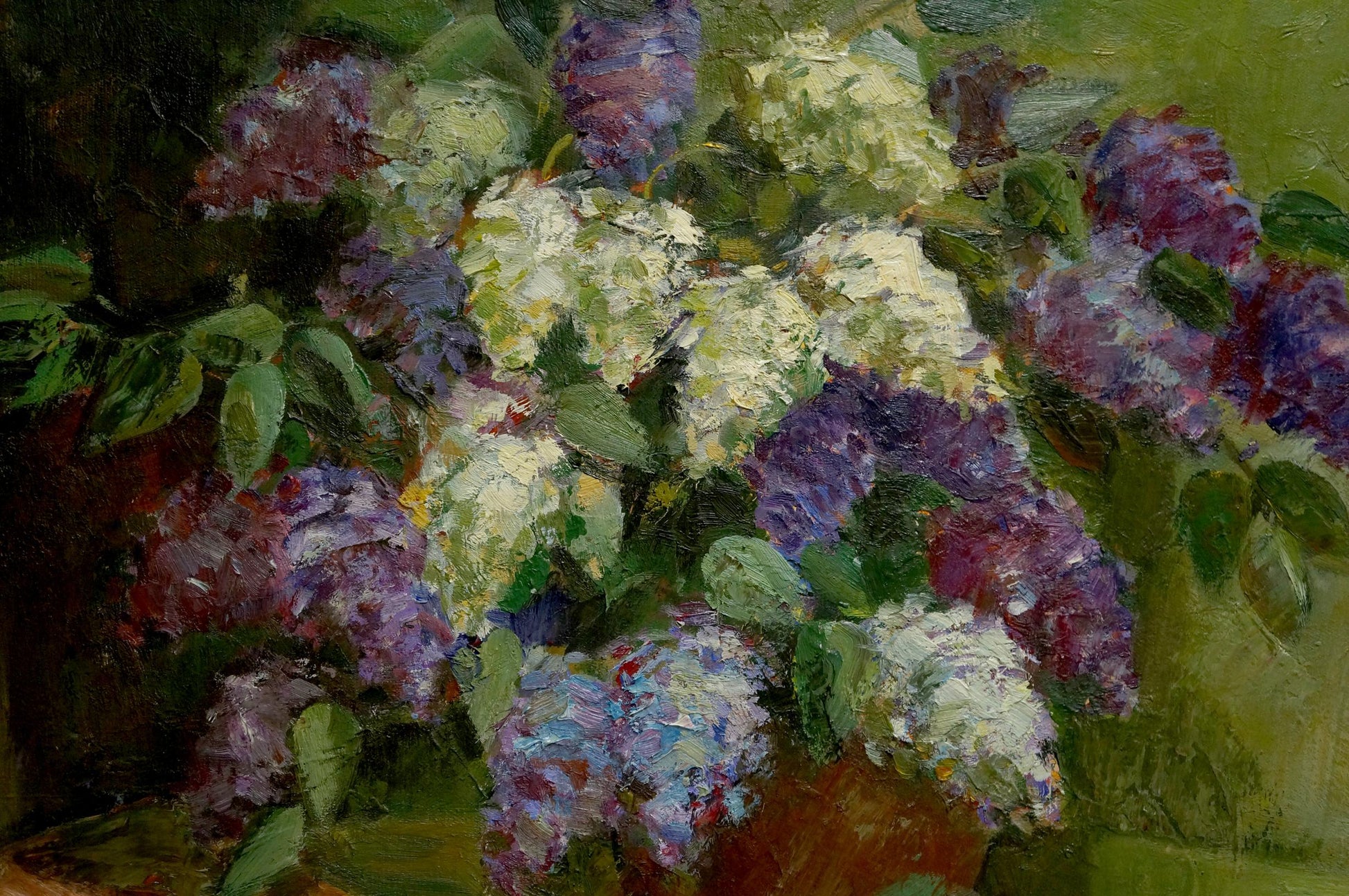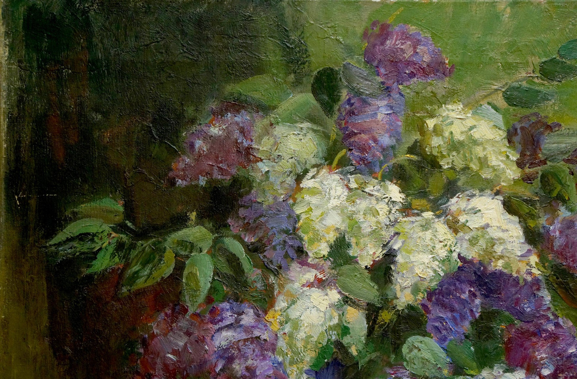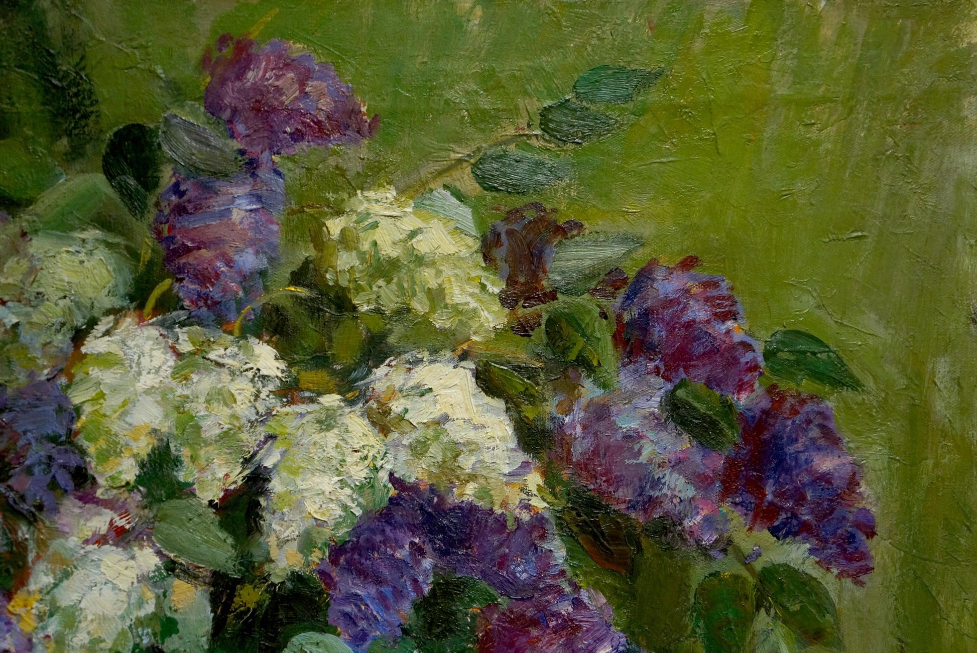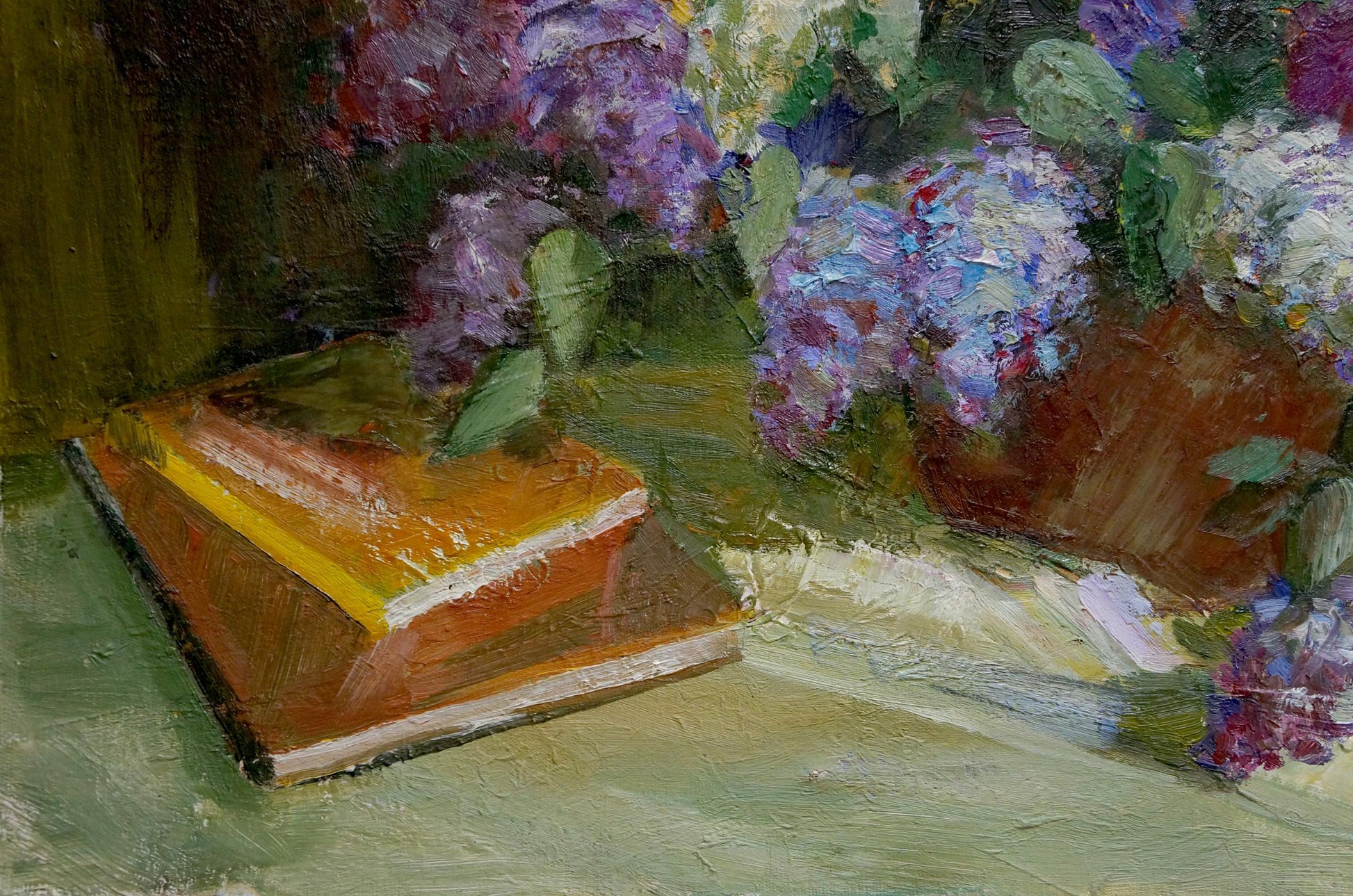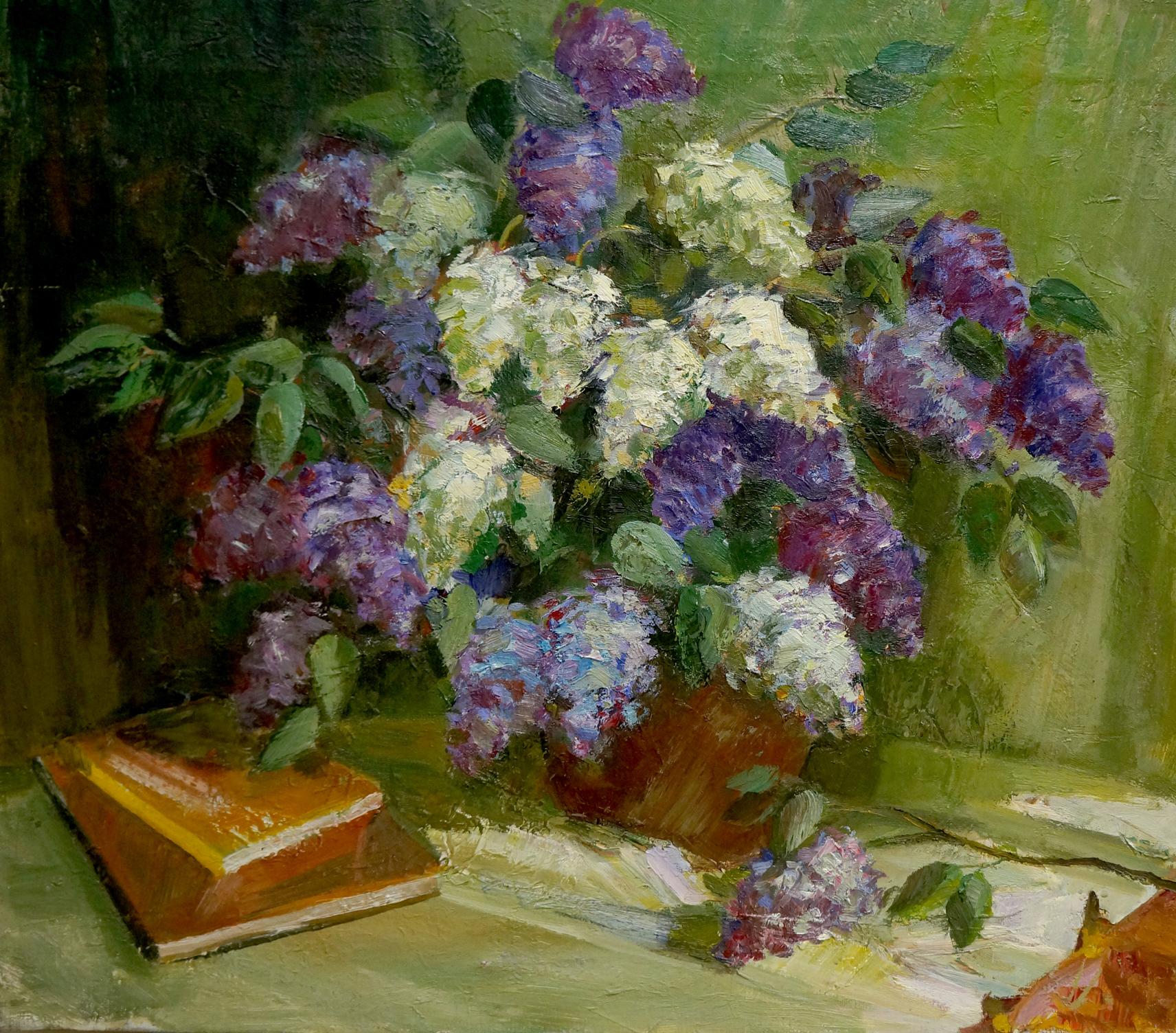 Oil painting Still life with lilacs and notebooks Unknown artist