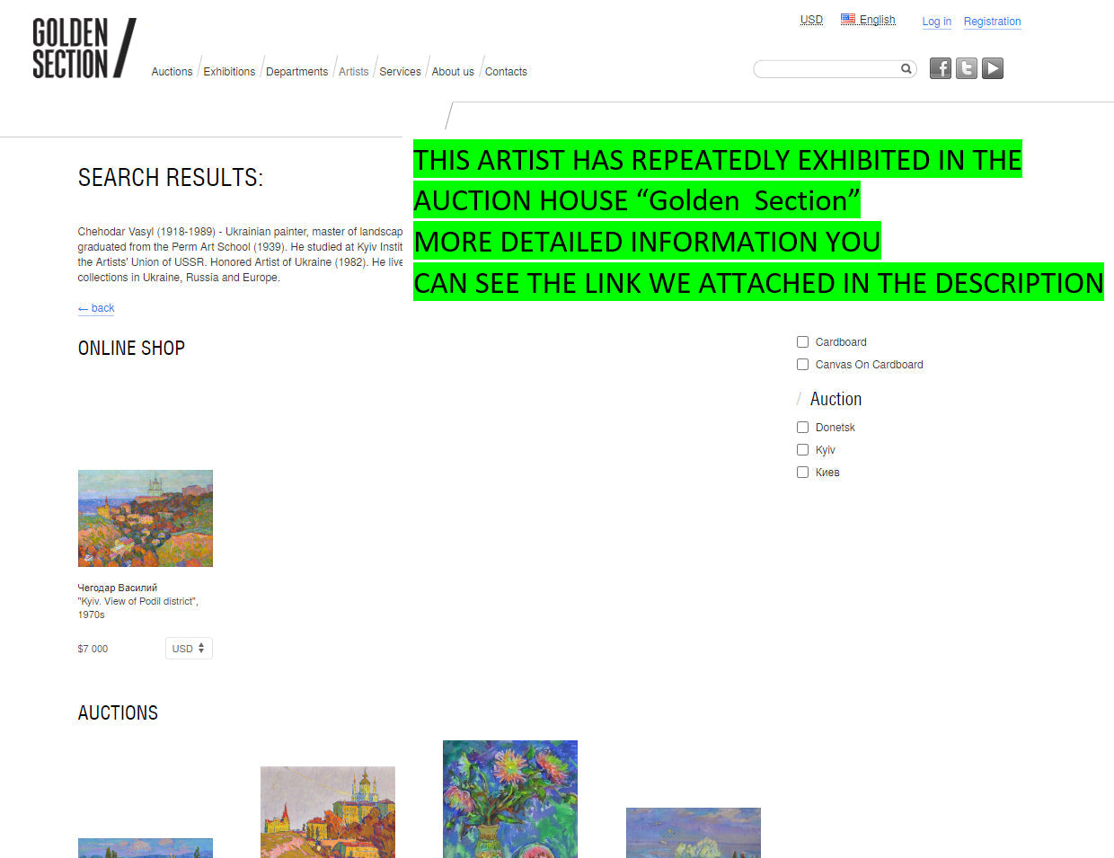 About the artists: Chehodar Vasyl (1918-1989) - Ukrainian painter, master of landscape and still life. Born in Krasnyi Yar, Odessa region. He graduated from the Perm Art School (1939). He studied at Kyiv Institute of Art (S. Grigoriev, F. Mikheev, Ye Shuya). A member of the Artists' Union of USSR. Honored Artist of Ukraine (1982). He lived and worked in Kyiv. Works of the artist are in private collections in Ukraine, Russia and Europe.