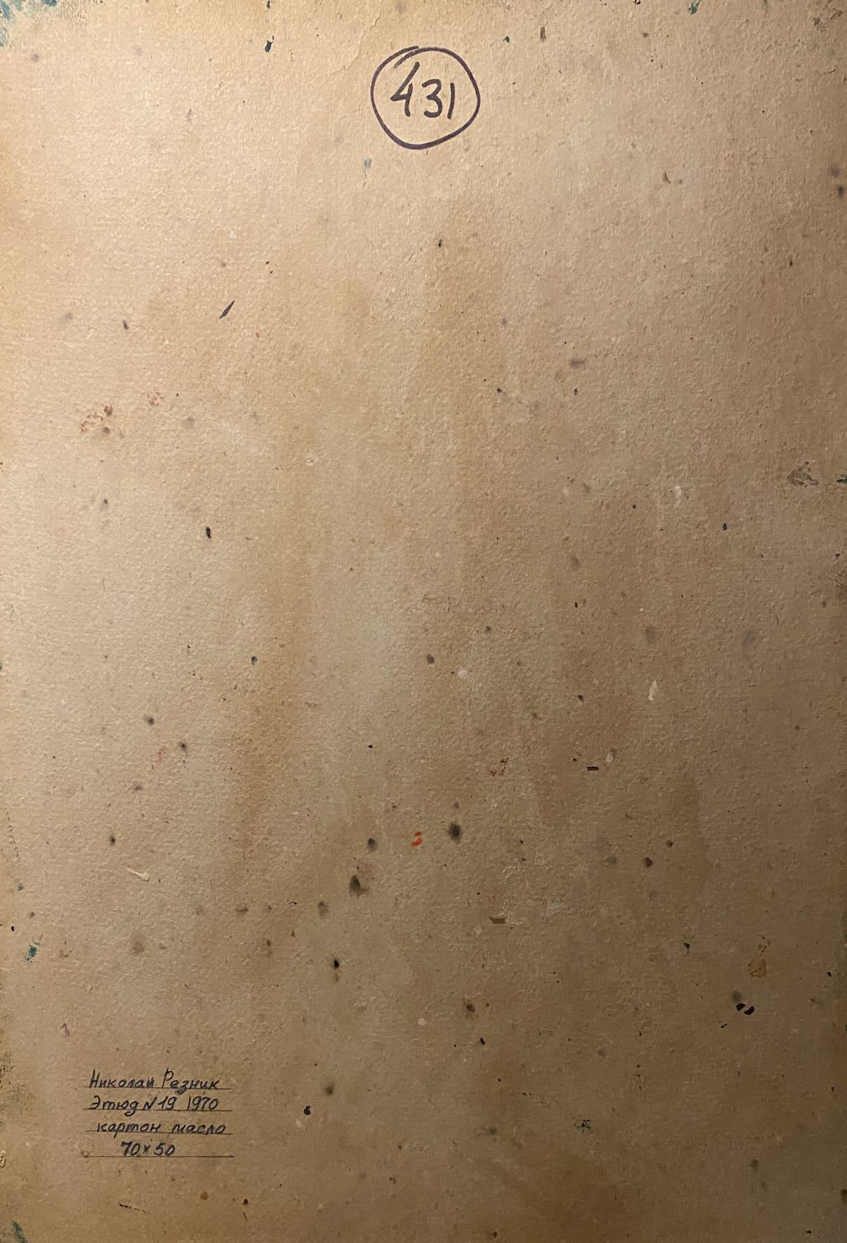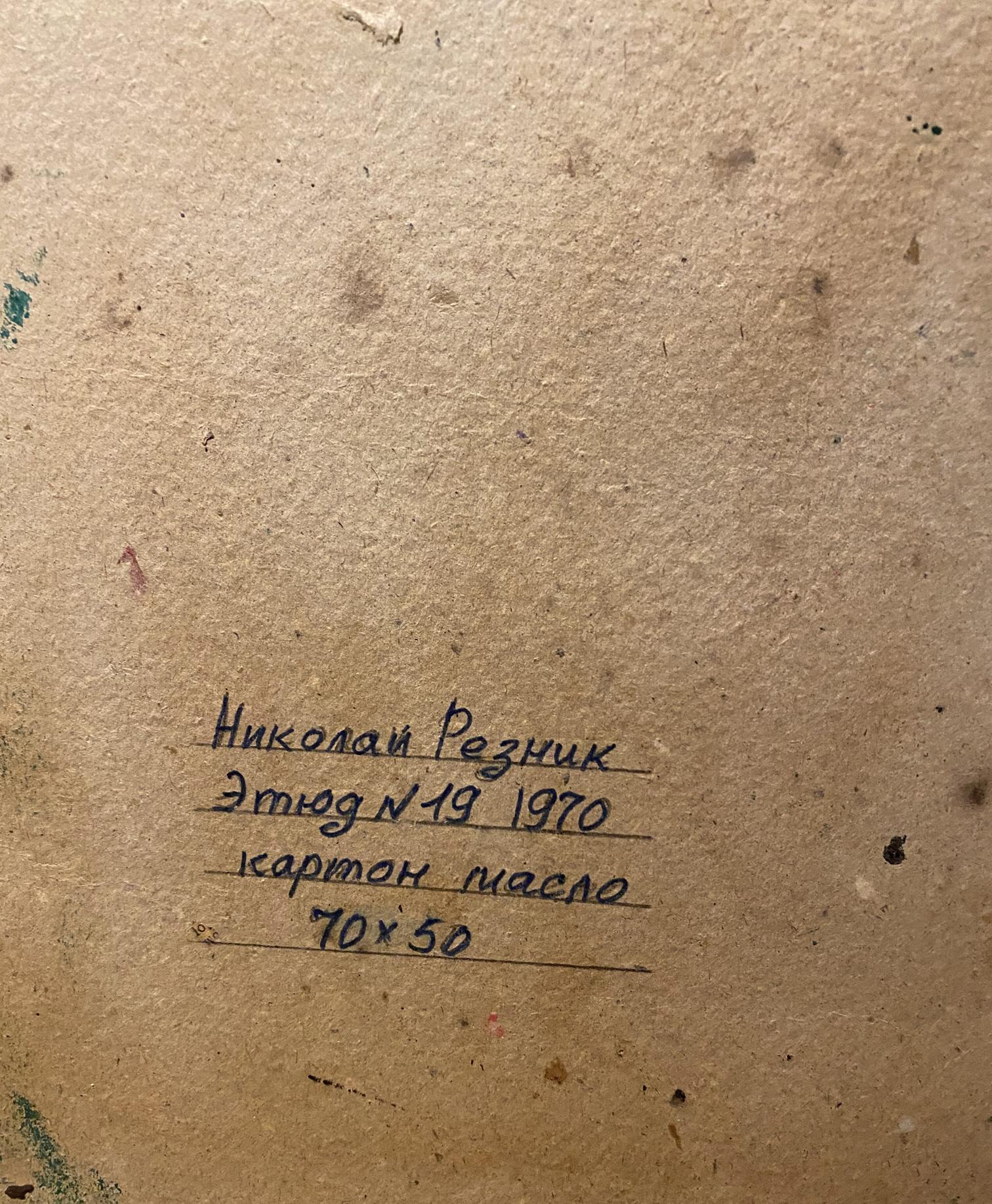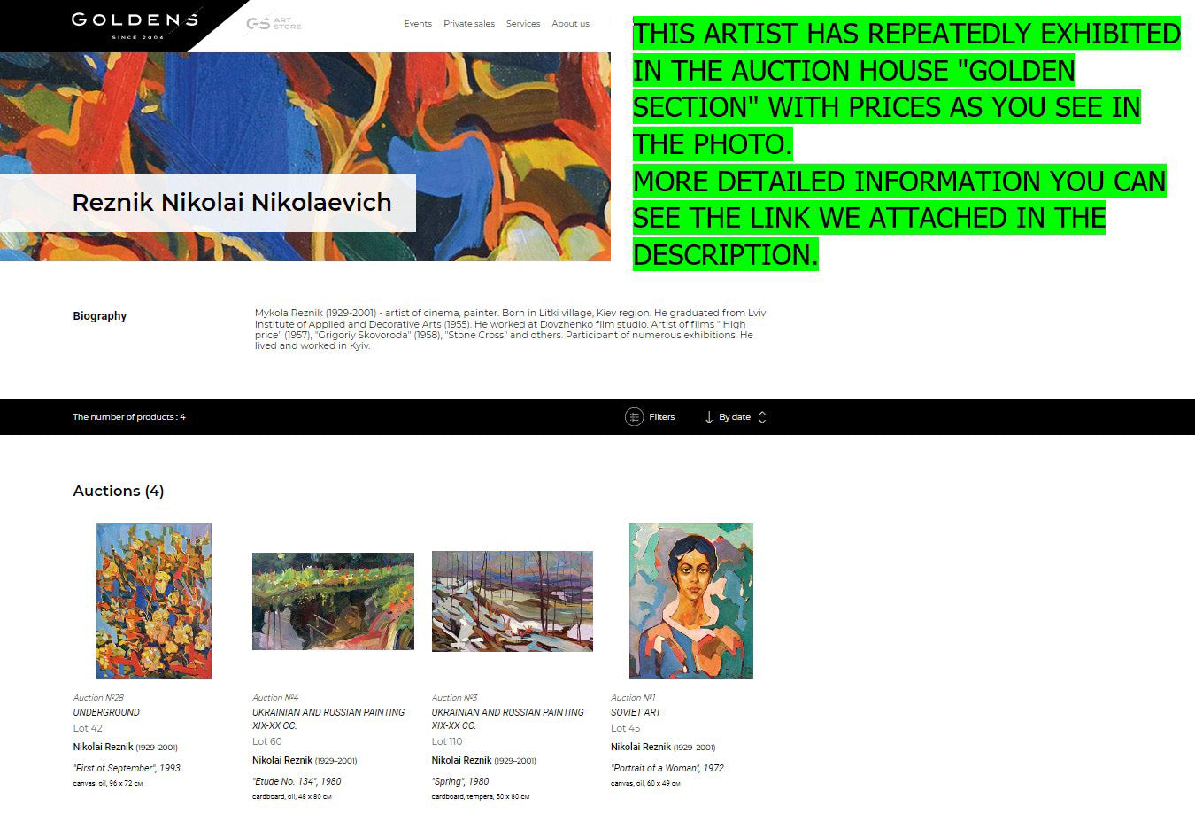 About the artists: Mykola Reznik (1929-2001) - artist of cinema, painter. Born in Litki village, Kiev region. He graduated from Lviv Institute of Applied and Decorative Arts (1955). He worked at Dovzhenko film studio. Artist of films " High price" (1957), "Grigoriy Skovoroda" (1958), "Stone Cross" and others. Participant of numerous exhibitions. He lived and worked in Kyiv.