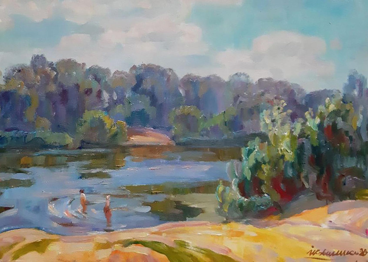 In "Summer Beach by the River," Ukrainian artist Kovalenko Ivan masterfully captures the peaceful and joyful atmosphere of a sunny summer day by the water. The painting showcases a calm riverside scene, with figures enjoying the water surrounded by lush trees and a bright sky dotted with soft clouds. The warm, earthy tones of the sandy beach contrast beautifully with the cool, reflective water, creating a tranquil and harmonious setting. This vibrant work is an ideal addition to any Collection of Summer Landscapes.